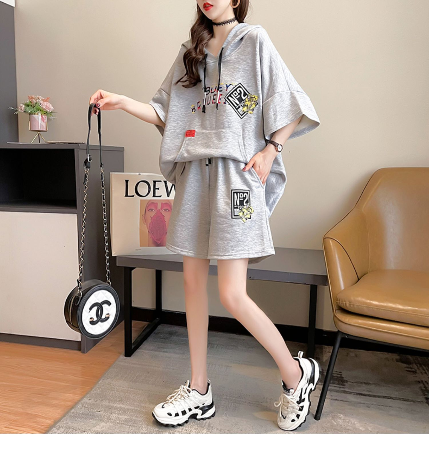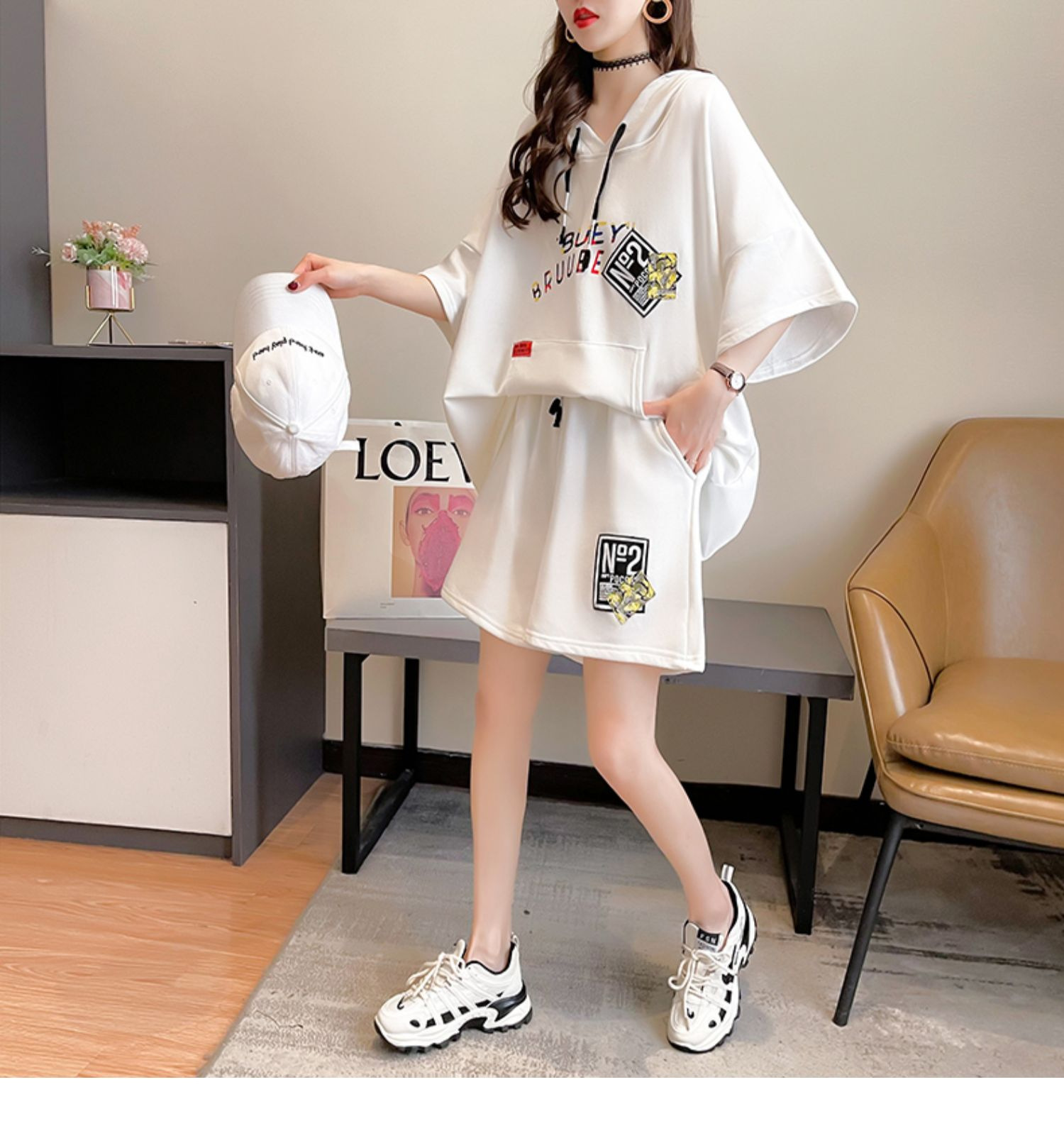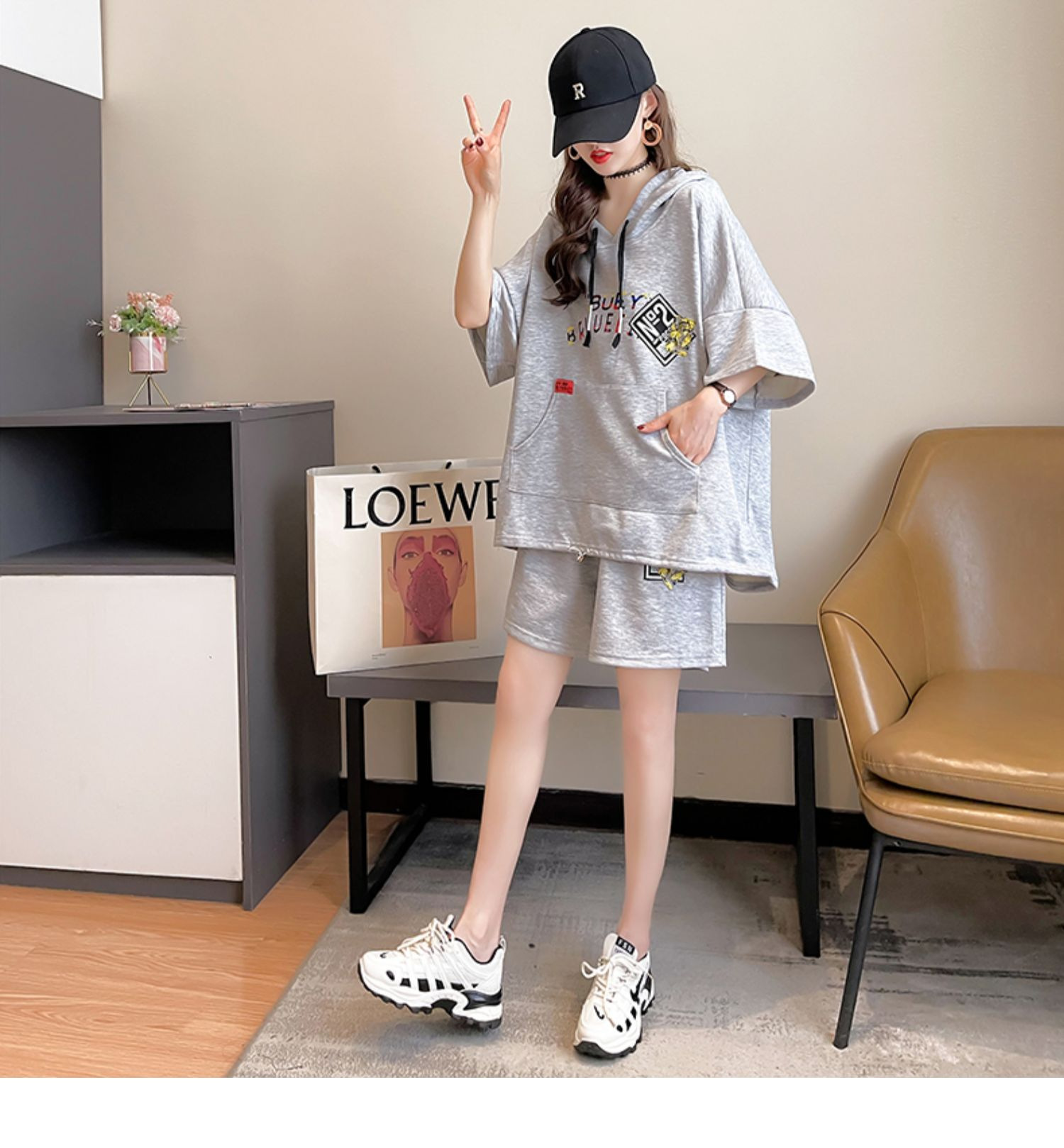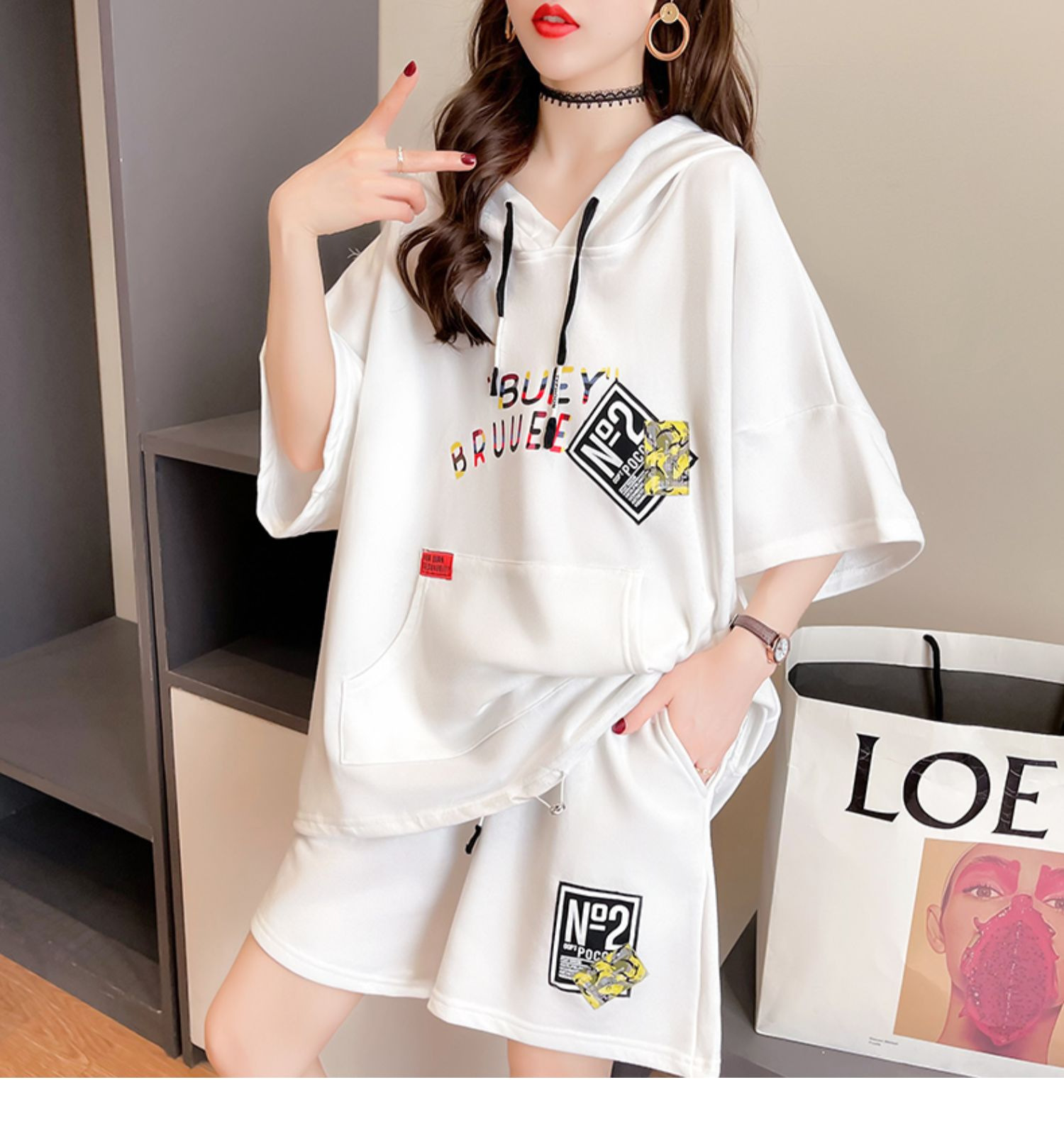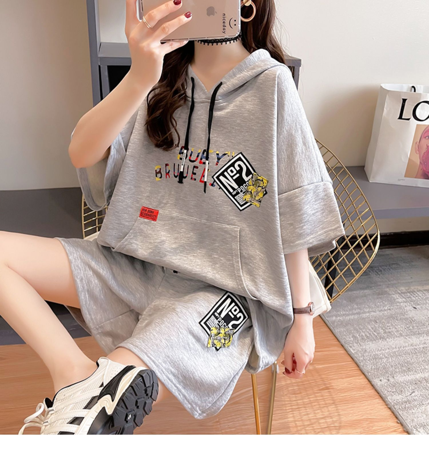 플러스 사이즈 여자 반팔 + 반바지 캐주얼 세트 여자 여름 새로운 스포츠 투피스 유행 세트
