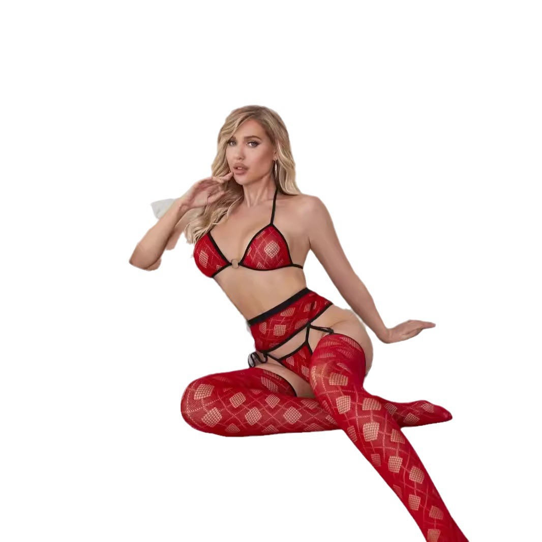 유럽과 미국의 국경 간 섹시한 속옷 플러스 사이즈 빨간 격자 무늬 스타킹 가죽 브래지어 세트 재고 도매