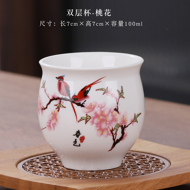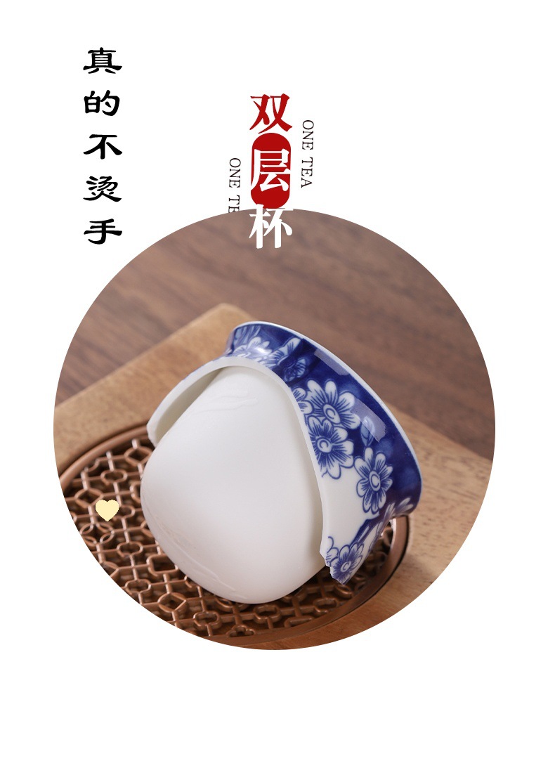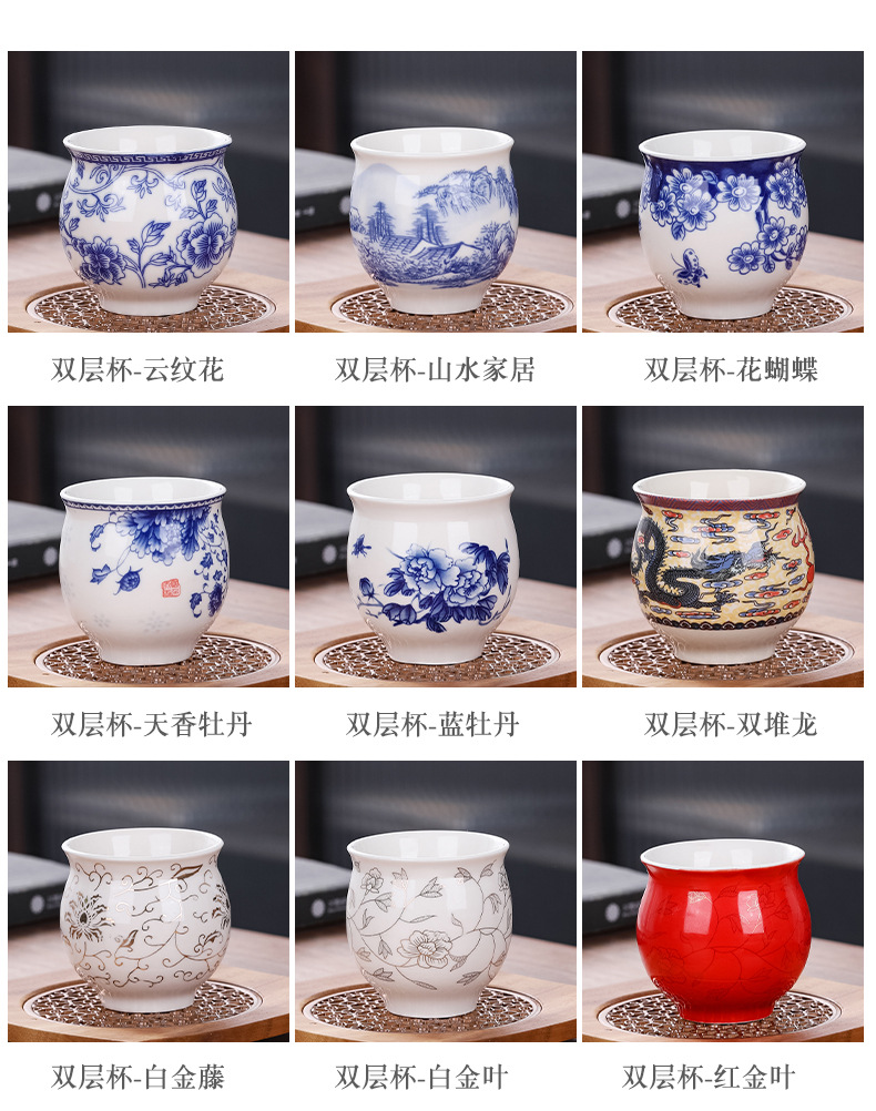 안티 스케일 더블 레이어 컵 세라믹 티 컵 티 그릇 가정용 단일 차 시음 컵 절연 마스터 컵 파란색과 흰색 도자기 차 큰 크기