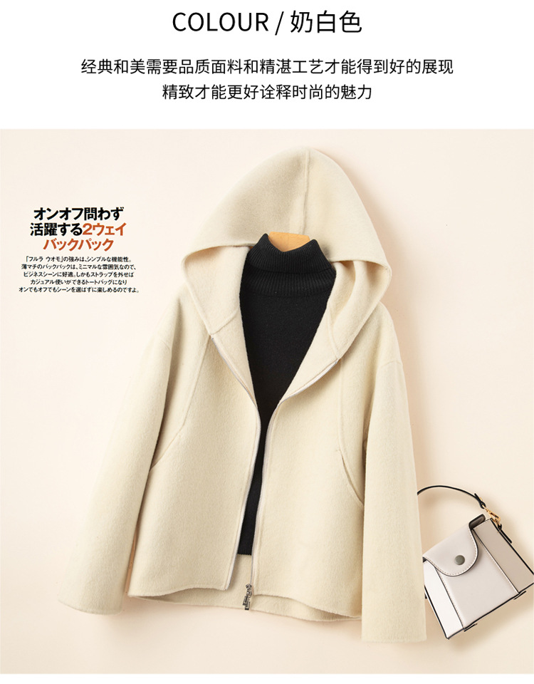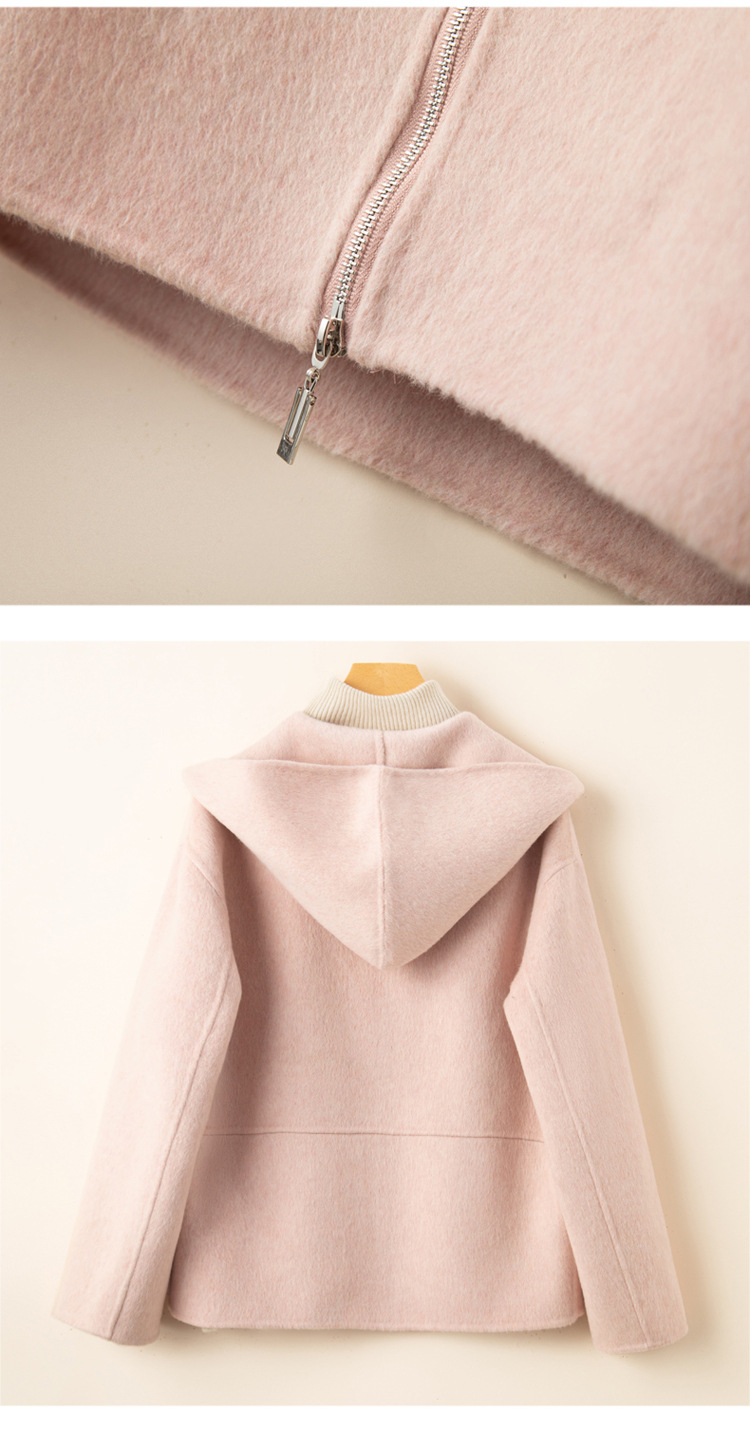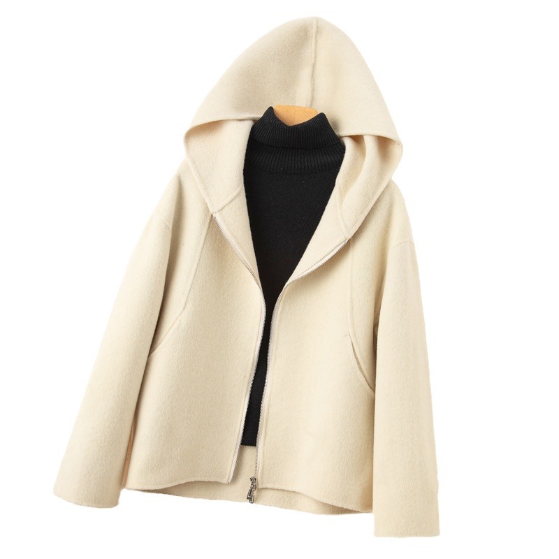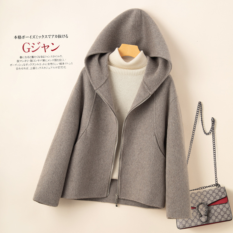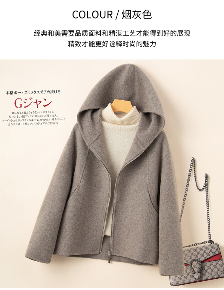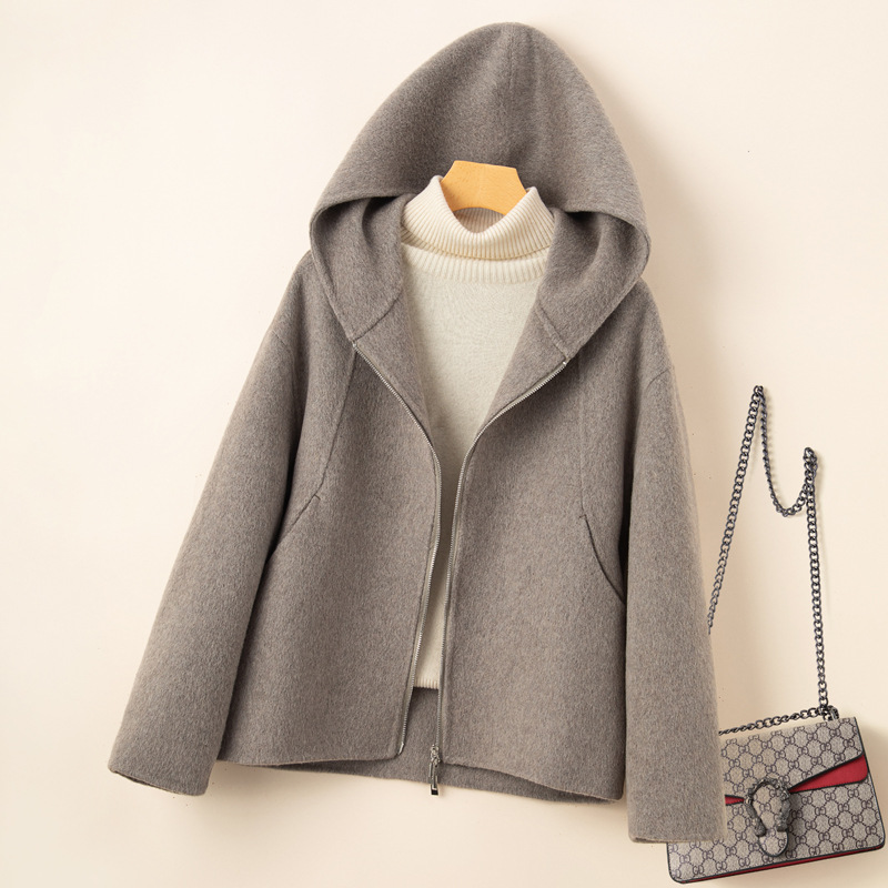 새로운 도착 작은 양면 울 코트 여성 짧은 후드 클래식 지퍼 캐주얼 심플 재킷