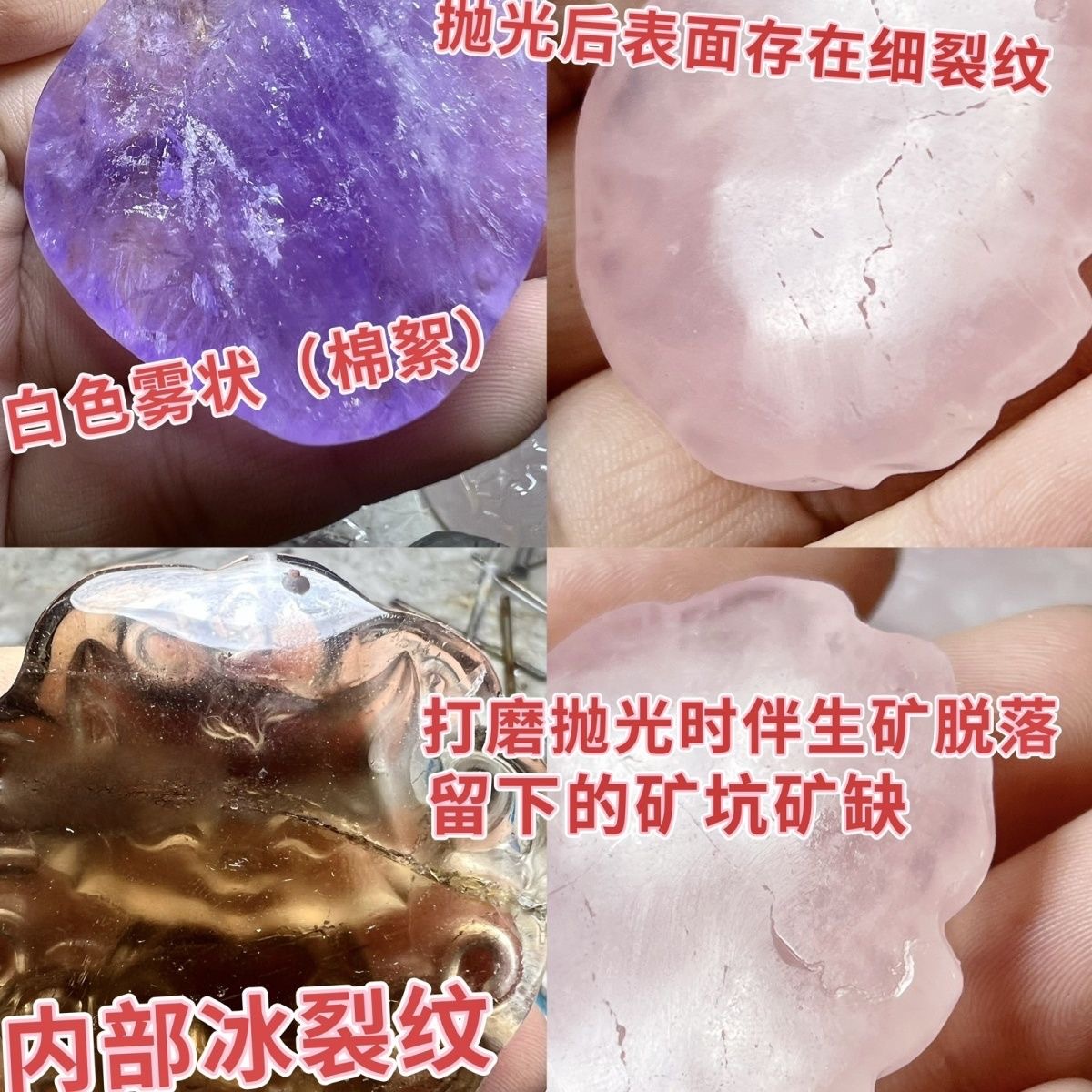 部分天然水晶晶体内都具有天然棉絮,冰裂,矿缺,和打磨过程中人为造成的硬伤,还有的手链单珠会有微小的大小悬殊.这就是我们所说的缺憾美。就像喜欢一个人一样,喜欢他(她)就要接受他(她)的缺点,人无完人,更何况是出自亿万年前的宝石呢。请大家了解水晶、爱护天然水晶,希望每个属于您的水晶都能给您带来好运。