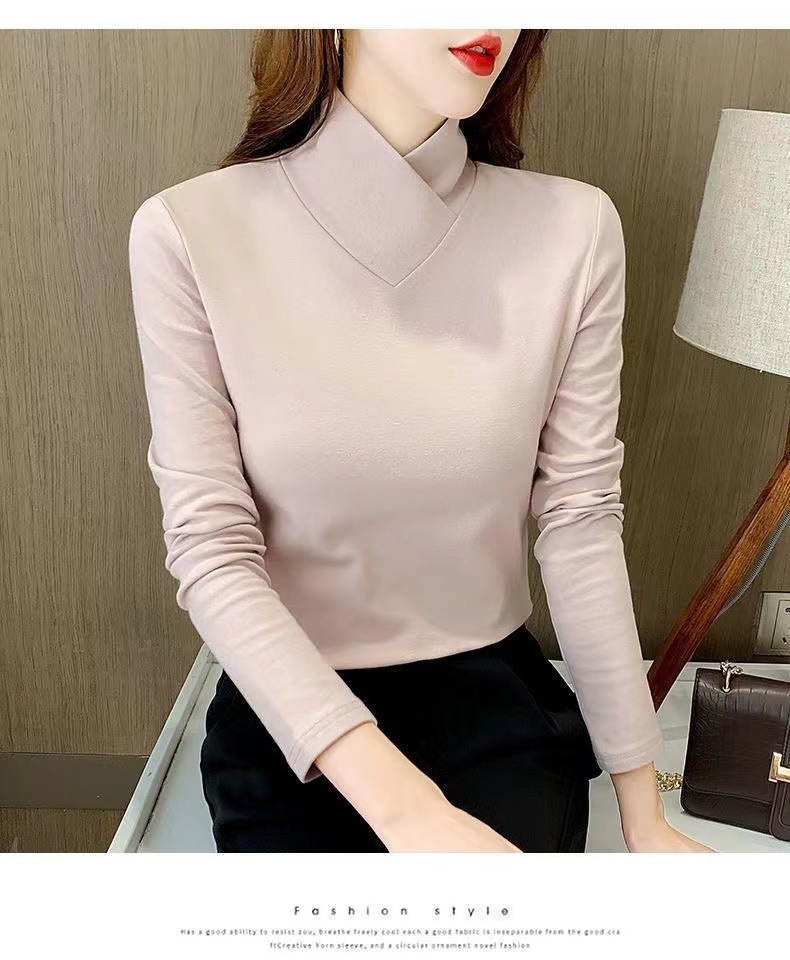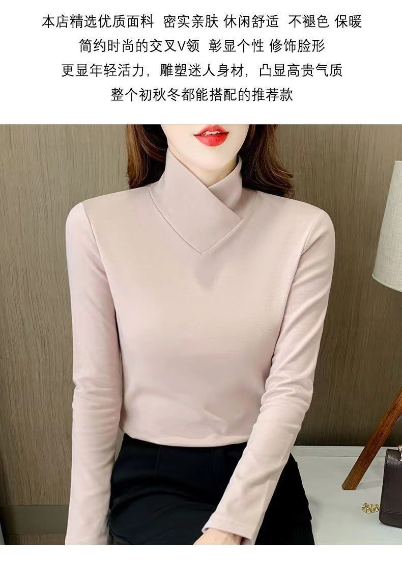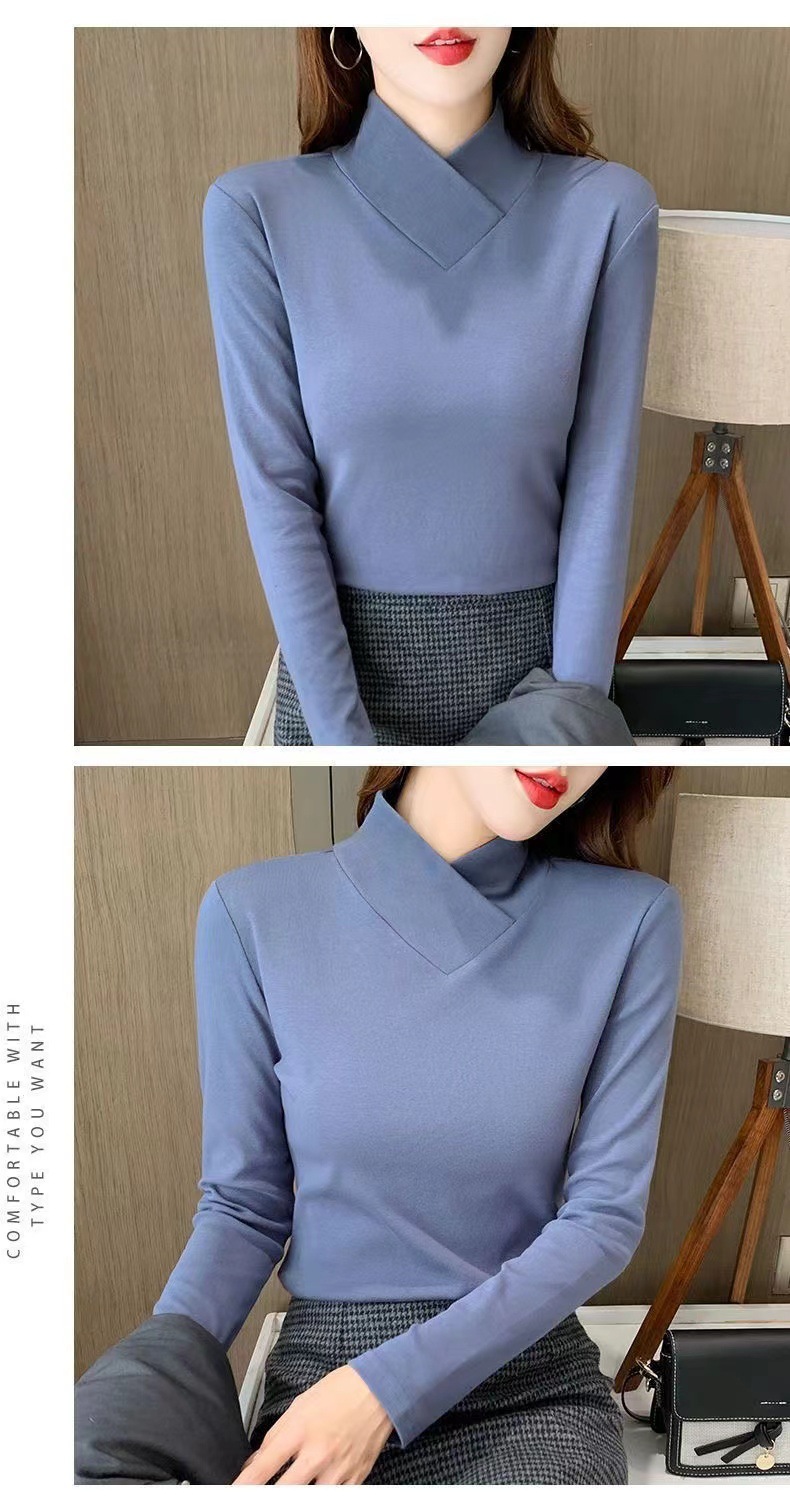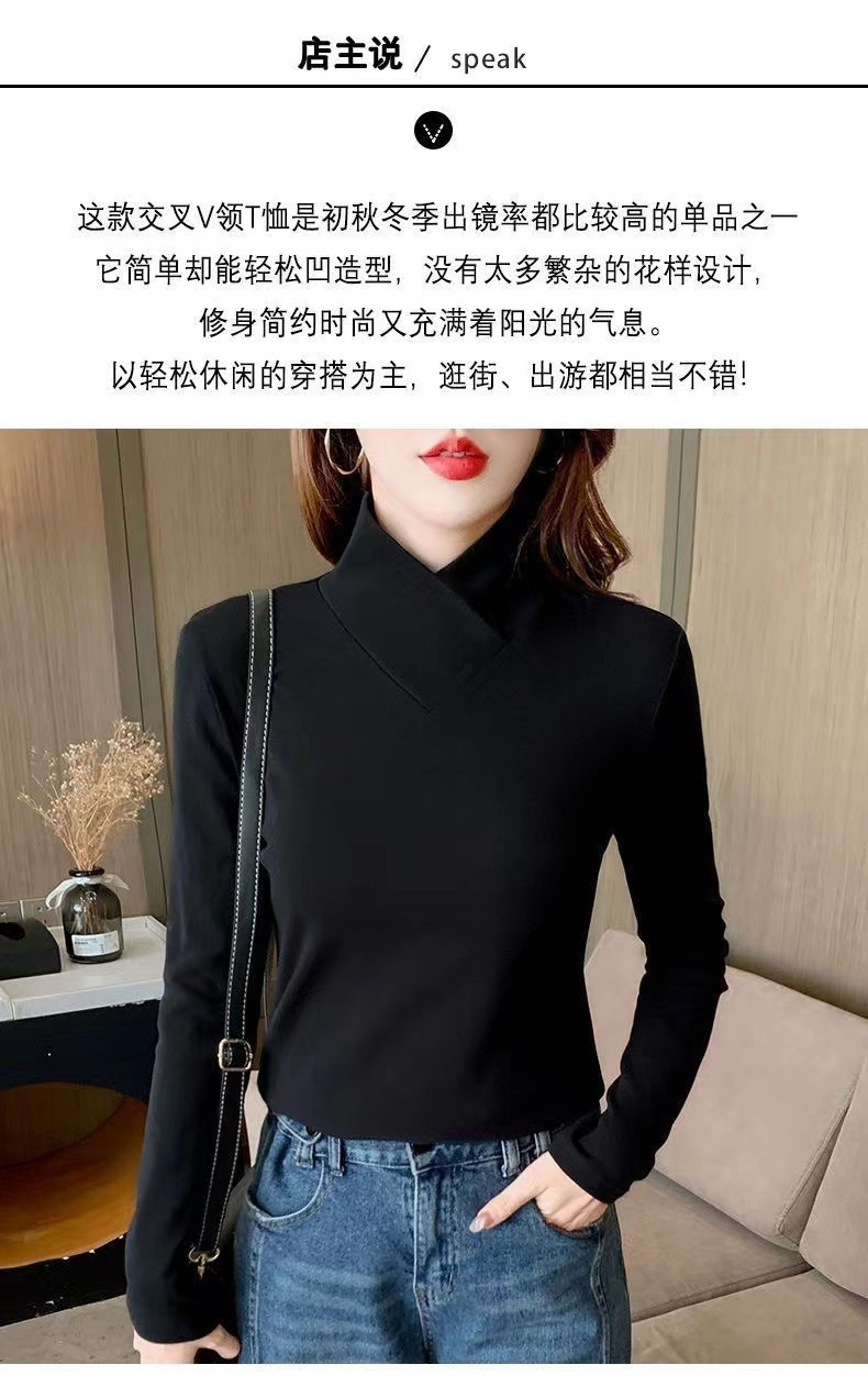 양면 벨벳베이스 셔츠 여자 가을 및 겨울 새로운 올 매치 내부 슬리밍 크로스 V 넥 스타일리스트 하이 칼라 티셔츠 탑 트렌디