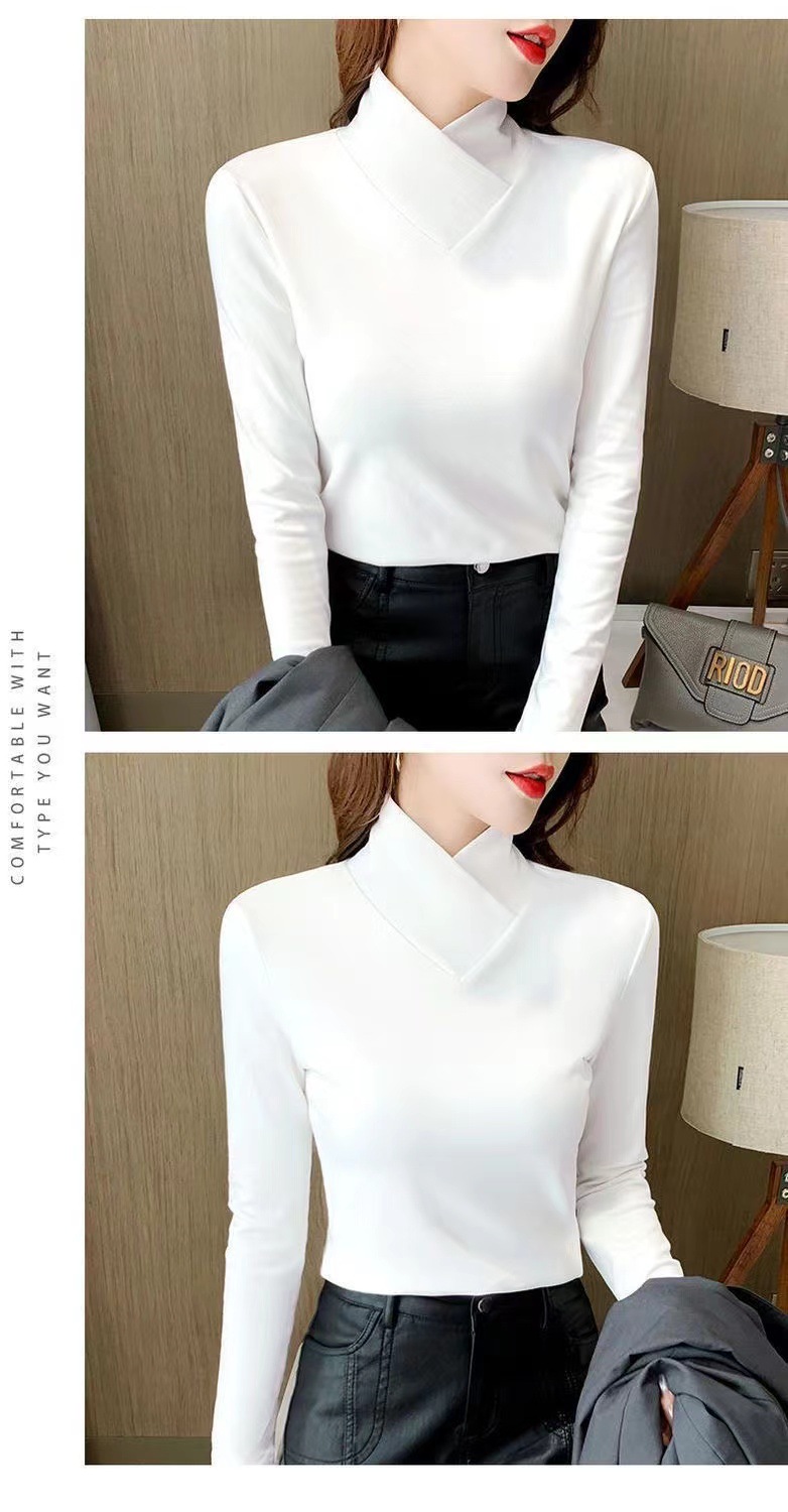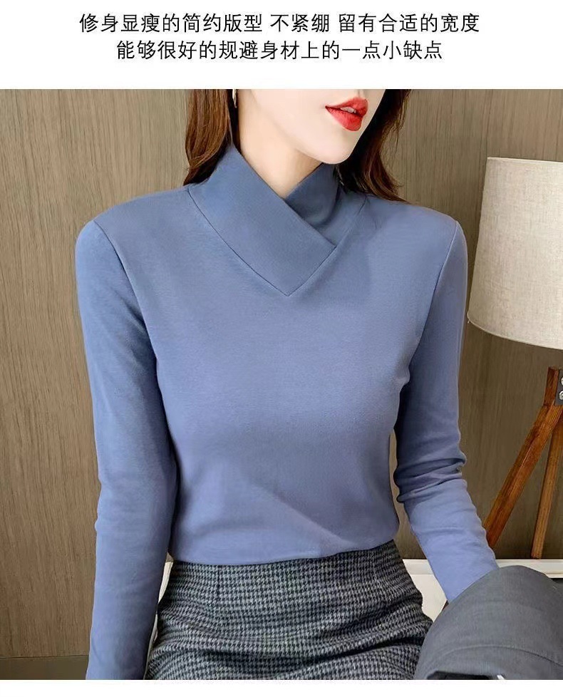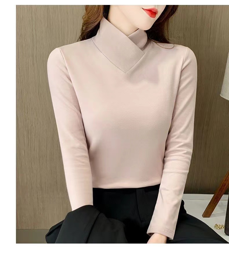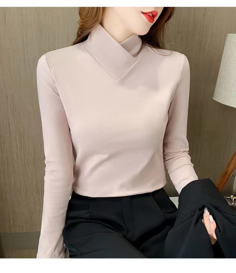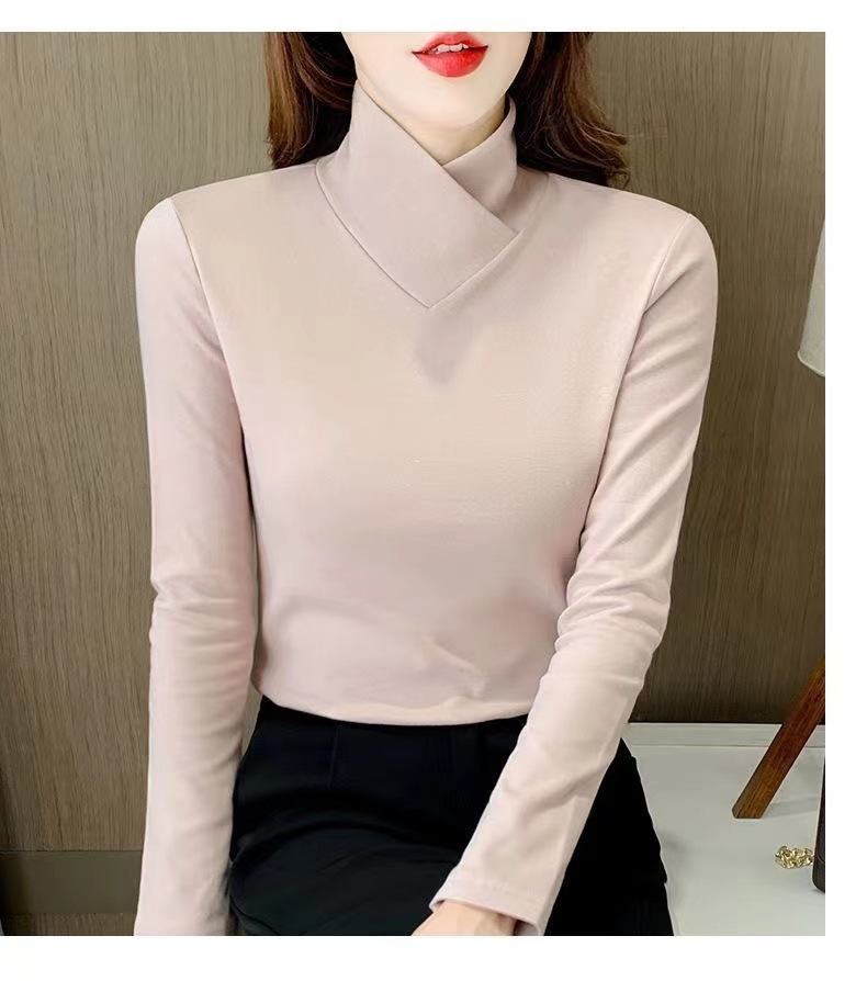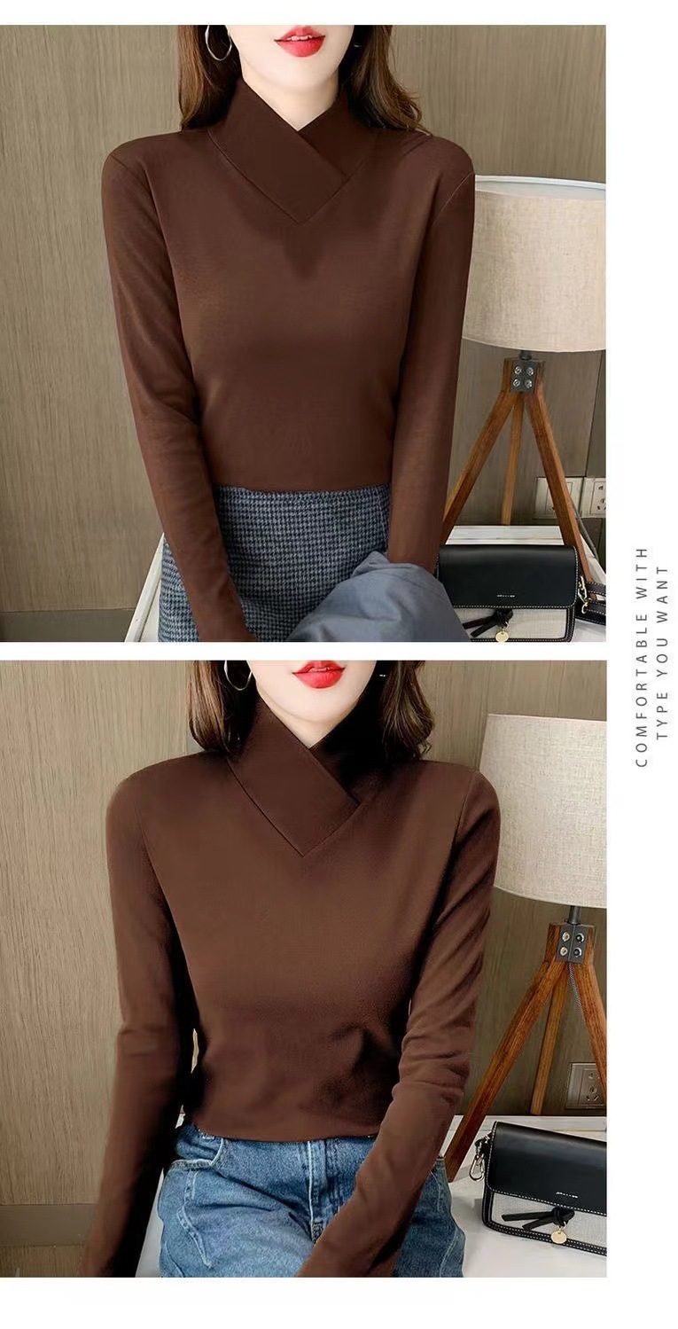 양면 벨벳베이스 셔츠 여자 가을 및 겨울 새로운 올 매치 내부 슬리밍 크로스 V 넥 스타일리스트 하이 칼라 티셔츠 탑 트렌디