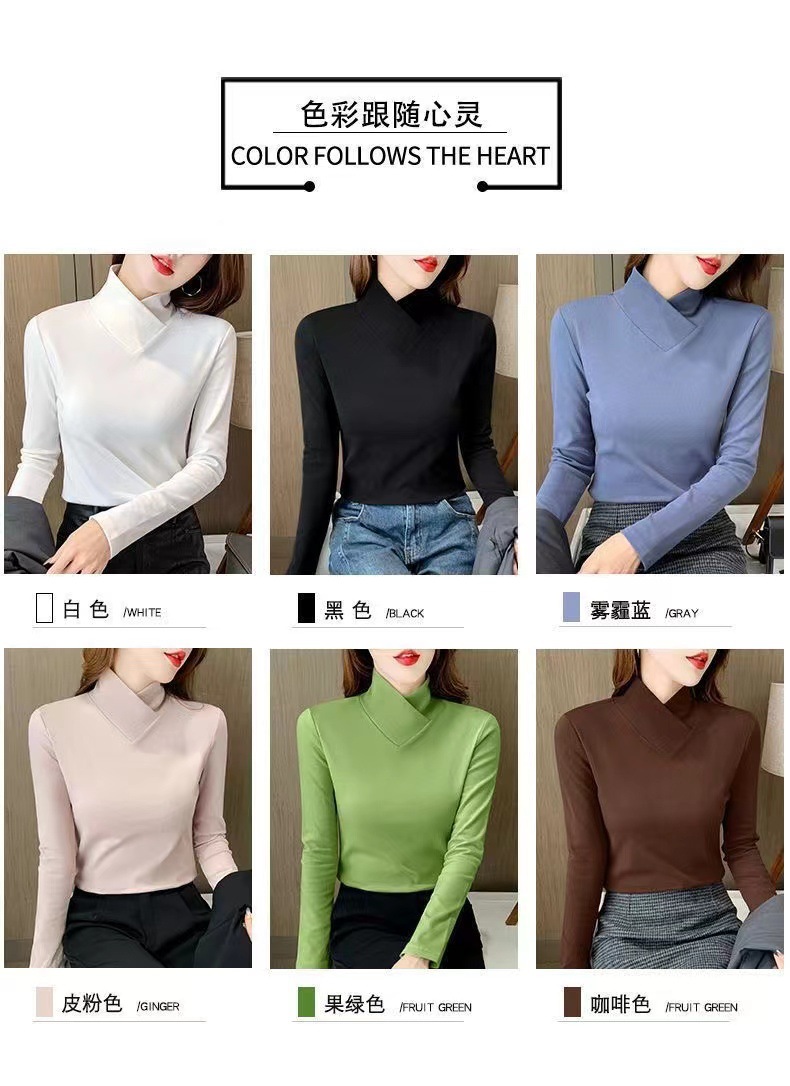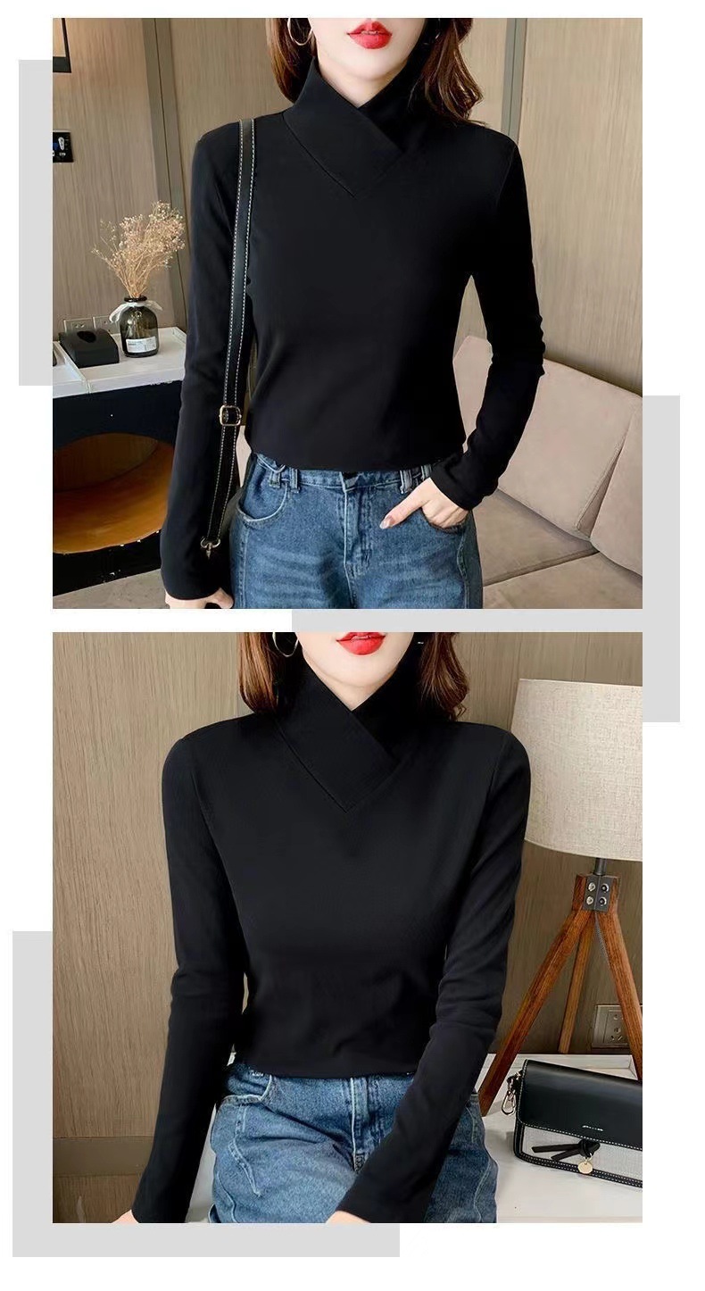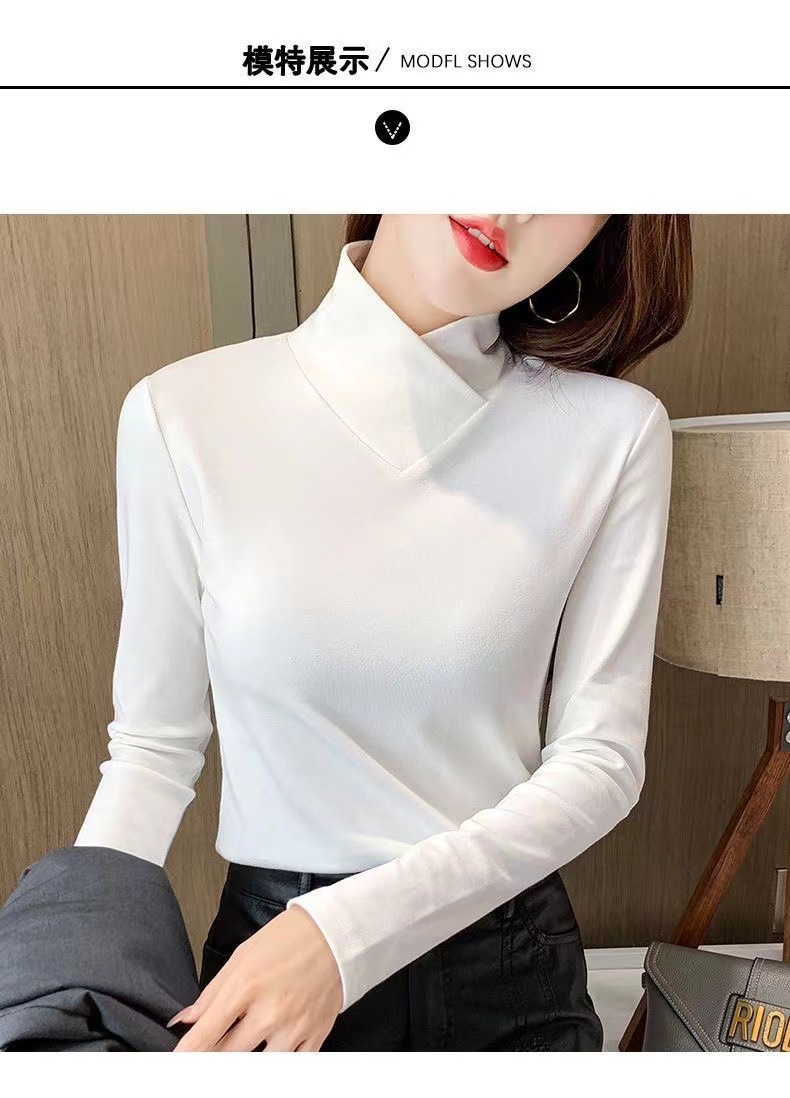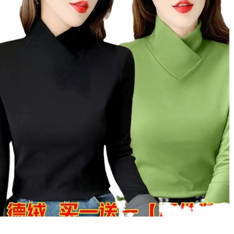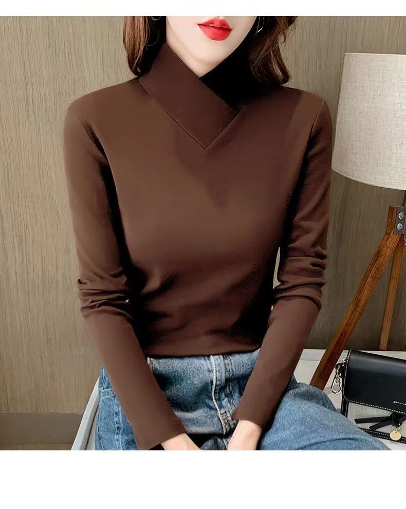 양면 벨벳베이스 셔츠 여자 가을 및 겨울 새로운 올 매치 내부 슬리밍 크로스 V 넥 스타일리스트 하이 칼라 티셔츠 탑 트렌디