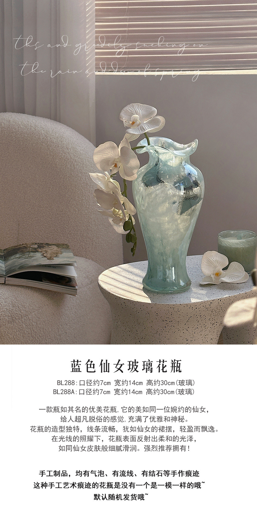请在购买前,务必确定好产品尺寸颜色等信息,以免为您的使用带来不便。手工吹制产品每只都是不一样的!每一件都是单独制作,个体间存在差异(高度.厚度.工艺等),单品都具有个性,介意者慎购,手工吹制产或多或少会产生气泡、柳 纹、划痕等包括其他手工痕迹都属于正常工艺现象,根本无法避免。希望各位买家能在购买前了解好玻璃花瓶本身的工艺特点,不要用此类商品与其他成百上千的商品作无谓的比较对产品要求极高的朋友请慎重考虑后购买