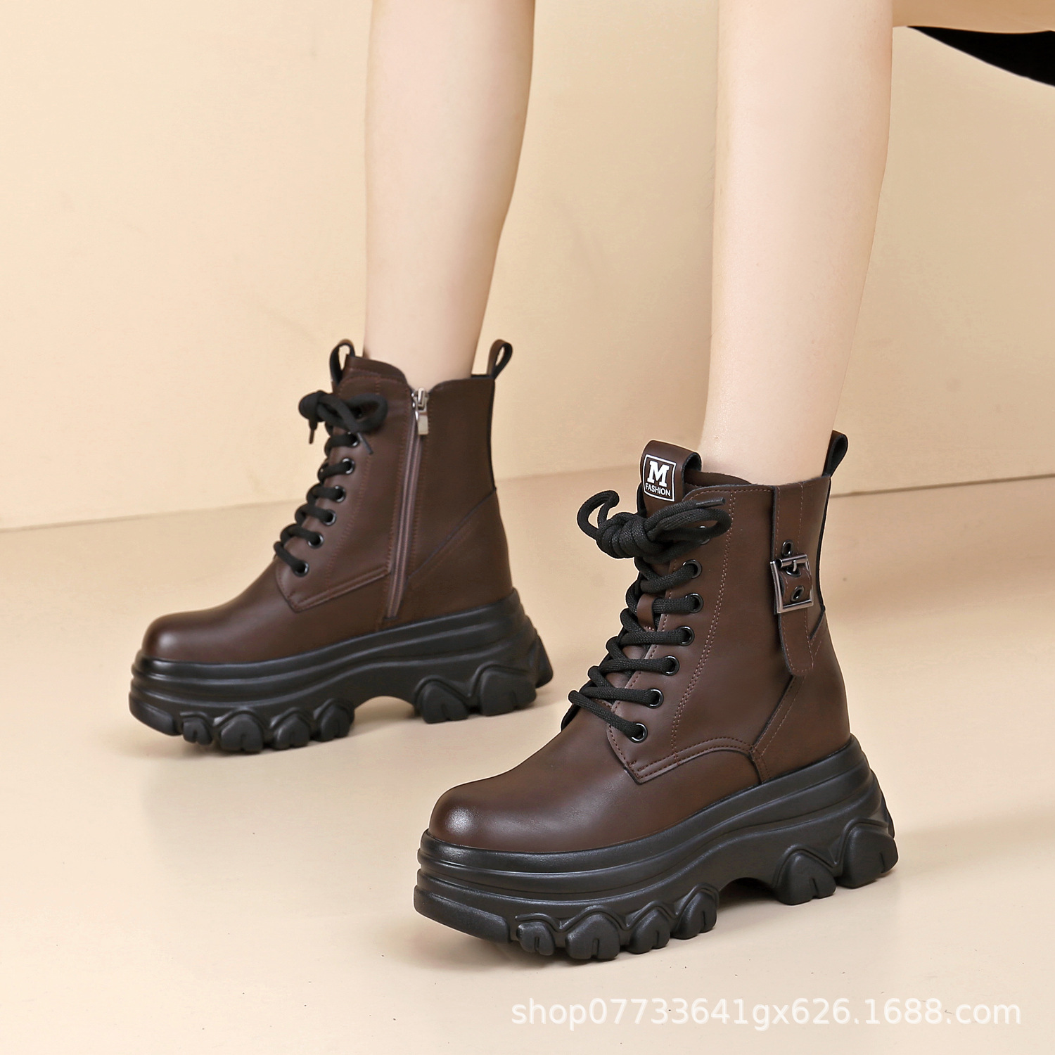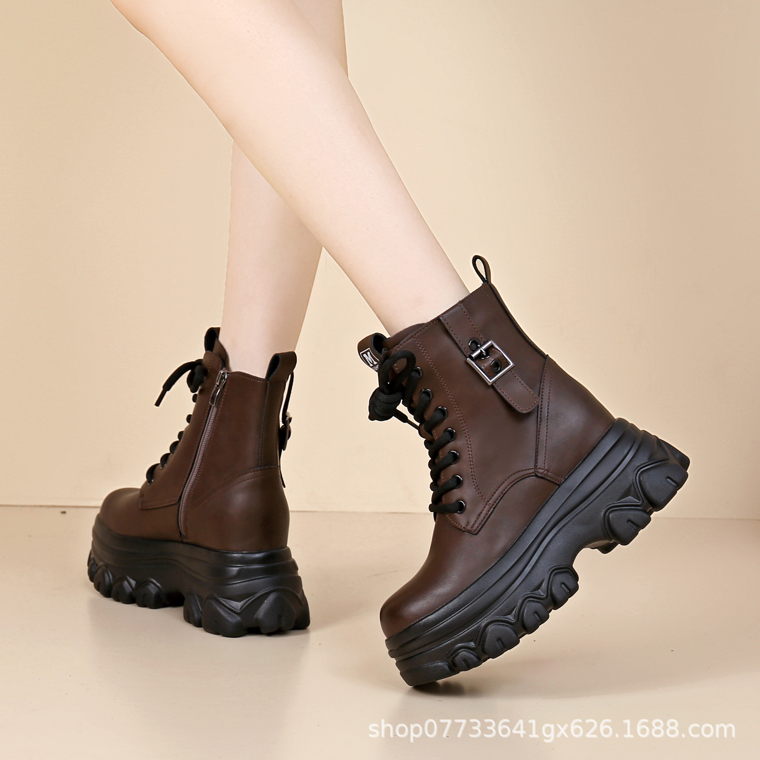 내부 강화 마틴 부츠 여성용 두꺼운 밑창 짧은 하이힐 짧은 부츠 웨지 힐 편안한 싱글 레이어 부츠 여성용 겨울 기모 가죽 부츠