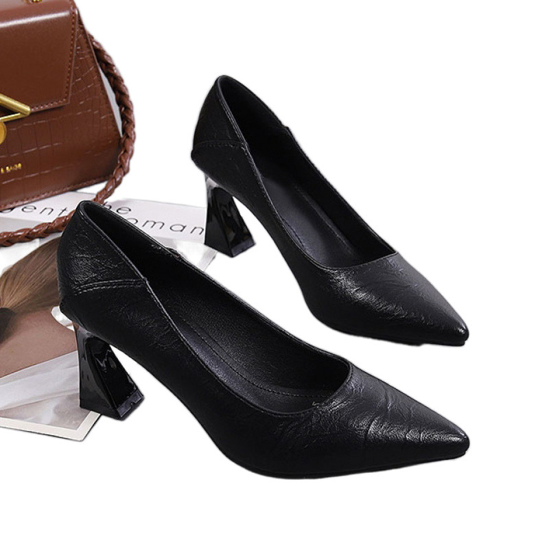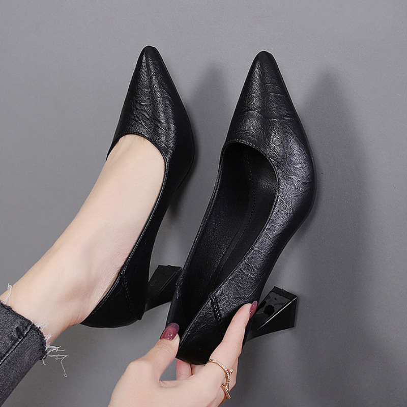 브랜드 깨진 크기 정품 가죽 뾰족한 발가락 싱글 레이어 신발 여성 두꺼운 힐 블랙 작업 신발 슈퍼 소프트 올 매치 패션 신발 양밍