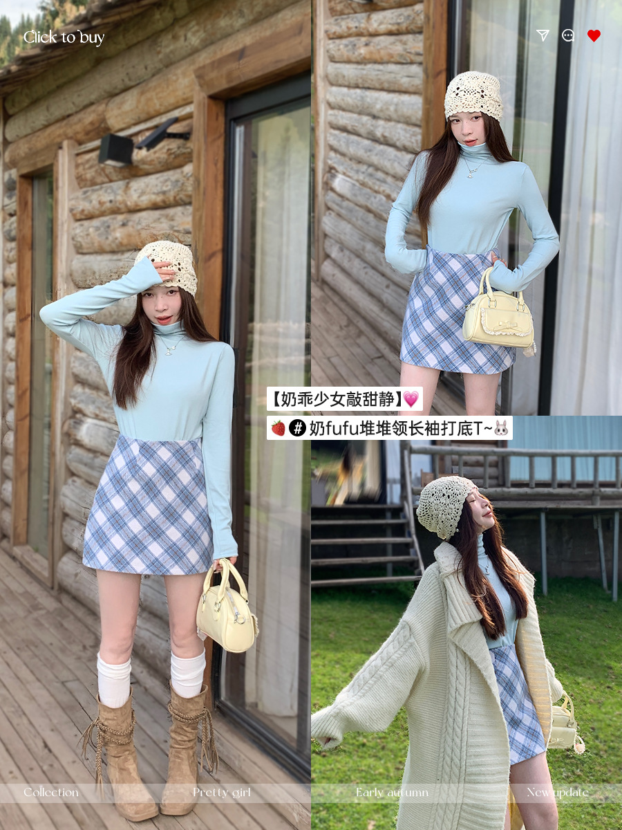 블루 베이스 레이어 여성용 봄 가을 겨울 2025 신상 하이넥 스타일리시 이너 티셔츠 모달 랩넥 탑