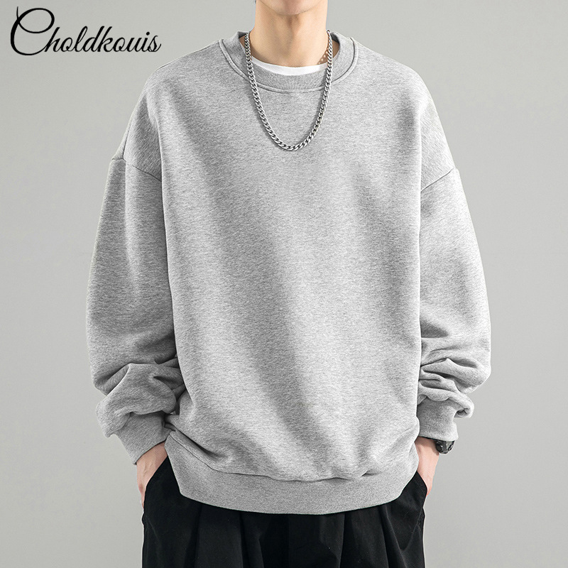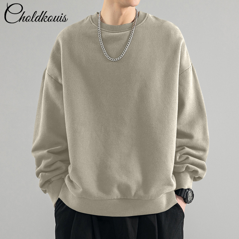 오트밀 그레이 라운드넥 스웨트셔츠 플러스 벨벳 스타일 - 솔리드 컬러 [GL]