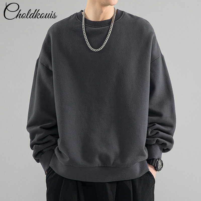 벨벳 스타일의 다크 그레이 라운드넥 스웨트셔츠 - 솔리드 컬러 [GL]