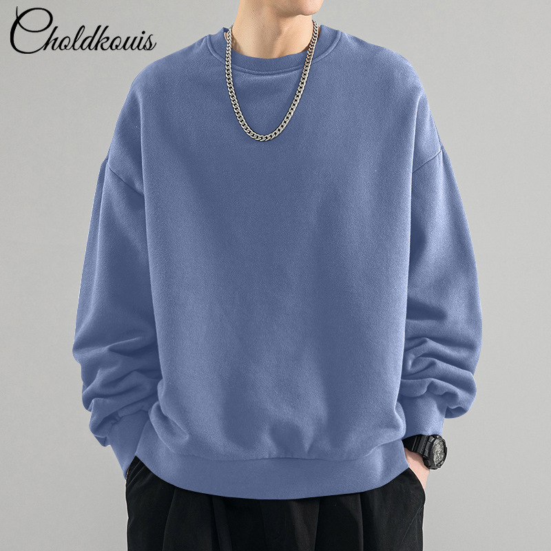 그레이 블루 라운드넥 스웨트셔츠 플러스 벨벳 스타일 - 솔리드 컬러 [GL]