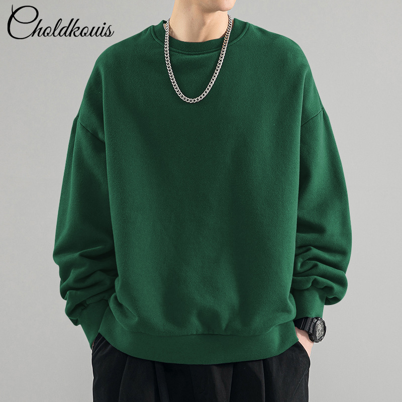 다크그린 라운드넥 스웨트셔츠 플러스 벨벳 스타일 - 솔리드 컬러 [GL]
