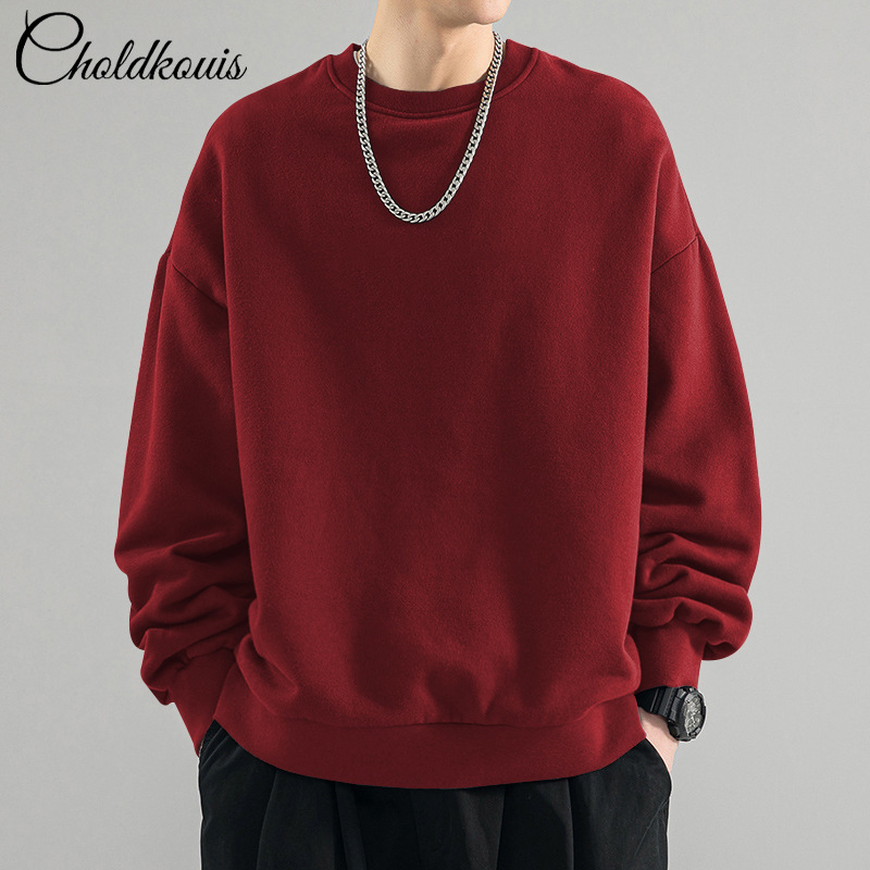 버건디 라운드 넥 스웨트셔츠 플러스 벨벳 스타일 - 솔리드 컬러 [GL]