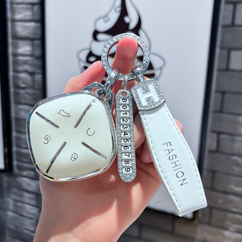 Chery J 모델 - 스마트 4버튼 [싱글 쉘 화이트] + 화이트 H 가죽 로프 다이아몬드 버클 + 실버 번호판