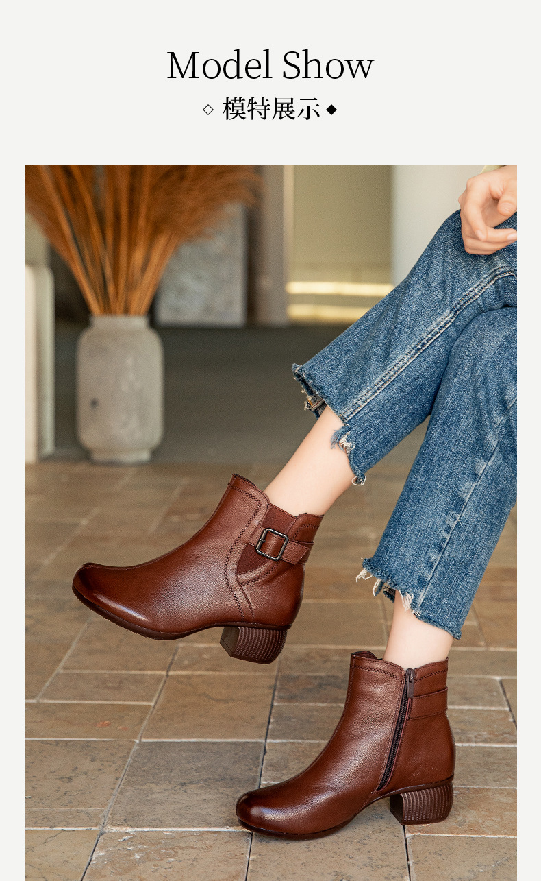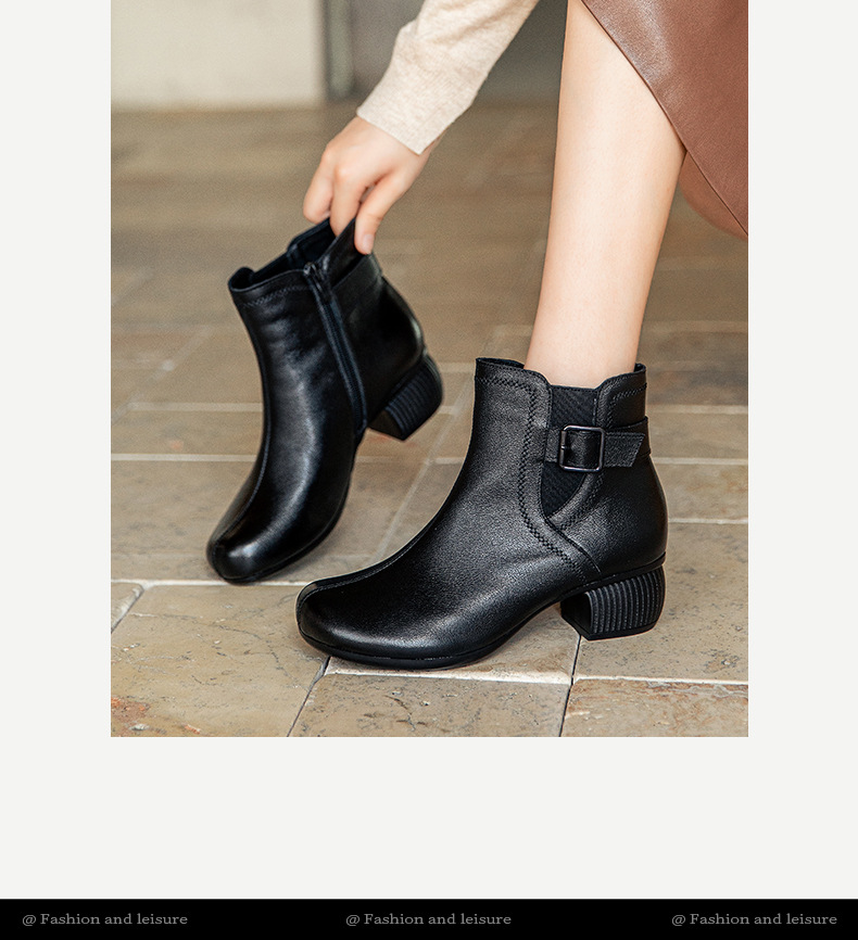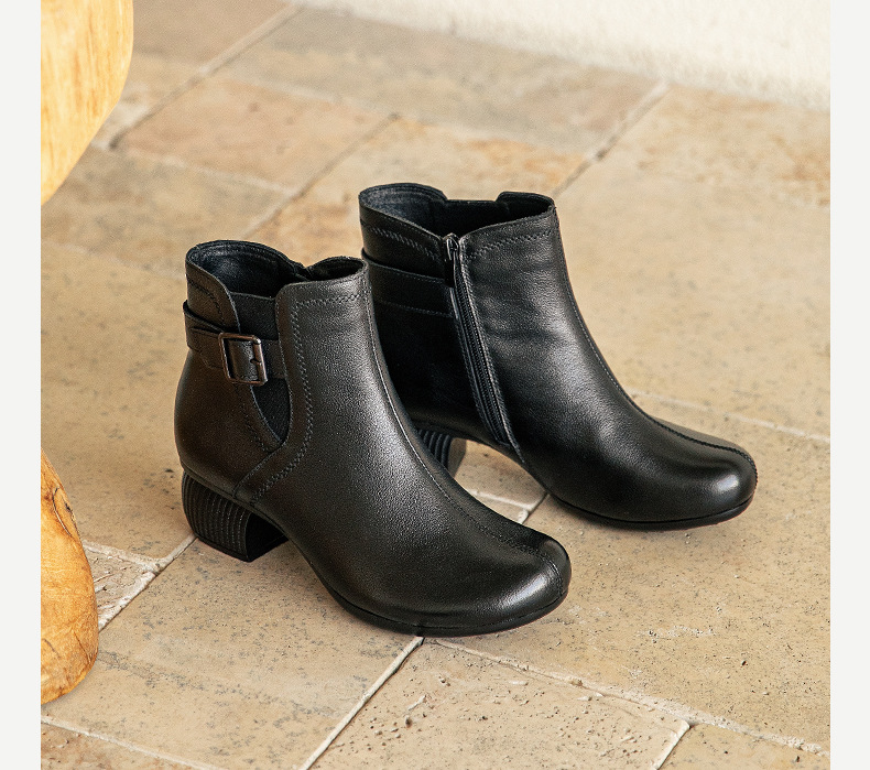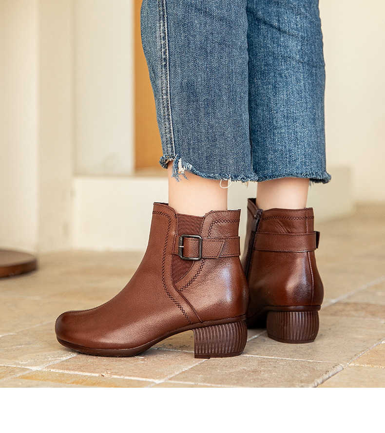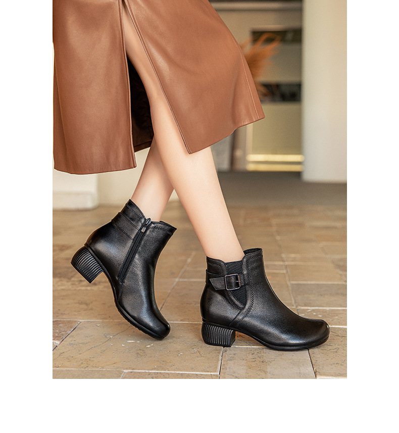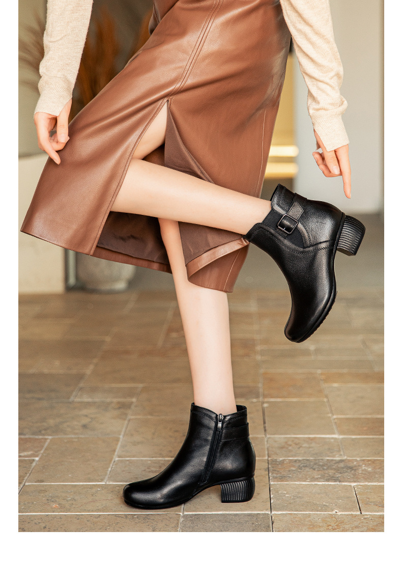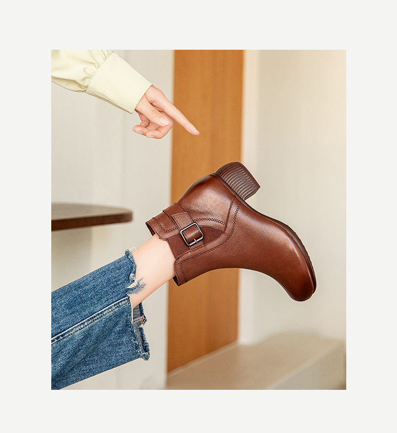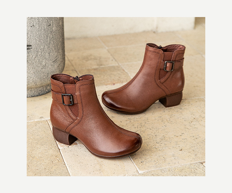 가을과 겨울 새로운 첫 번째 레이어 Cowhide 빈티지 발목 부츠 여성용 소프트 솔 중간 두께의 뒤꿈치 우아한 사이드 버클 올 매치 어머니 마틴 부츠 여성