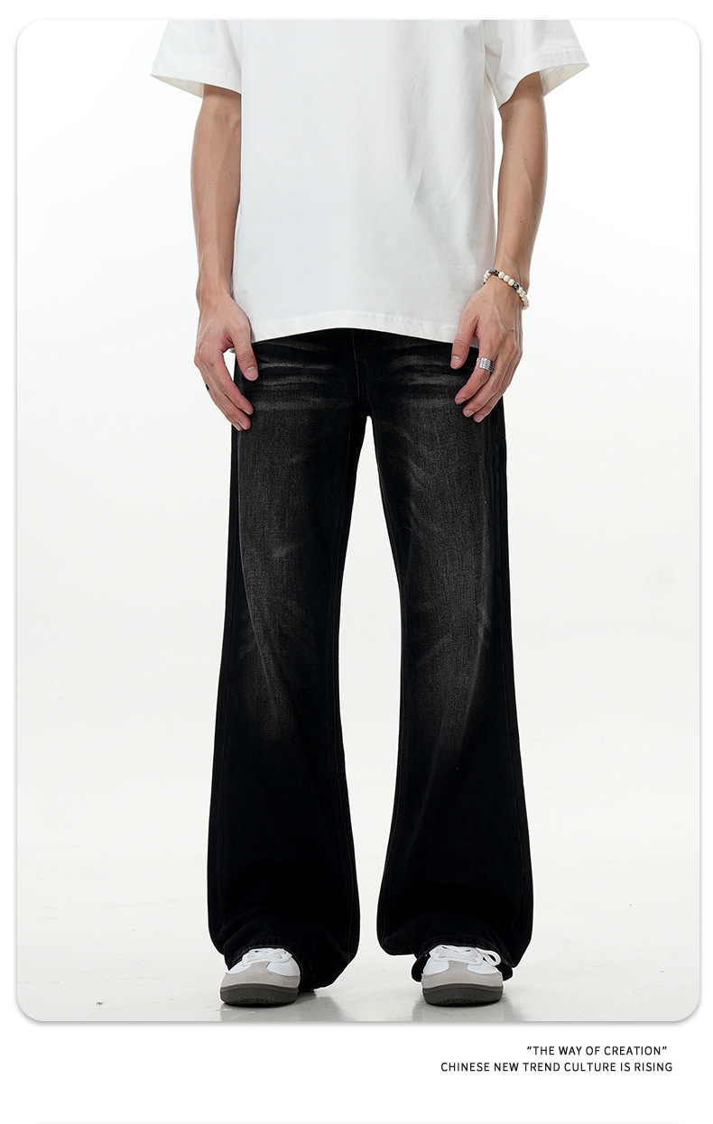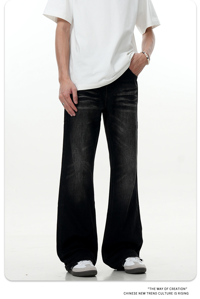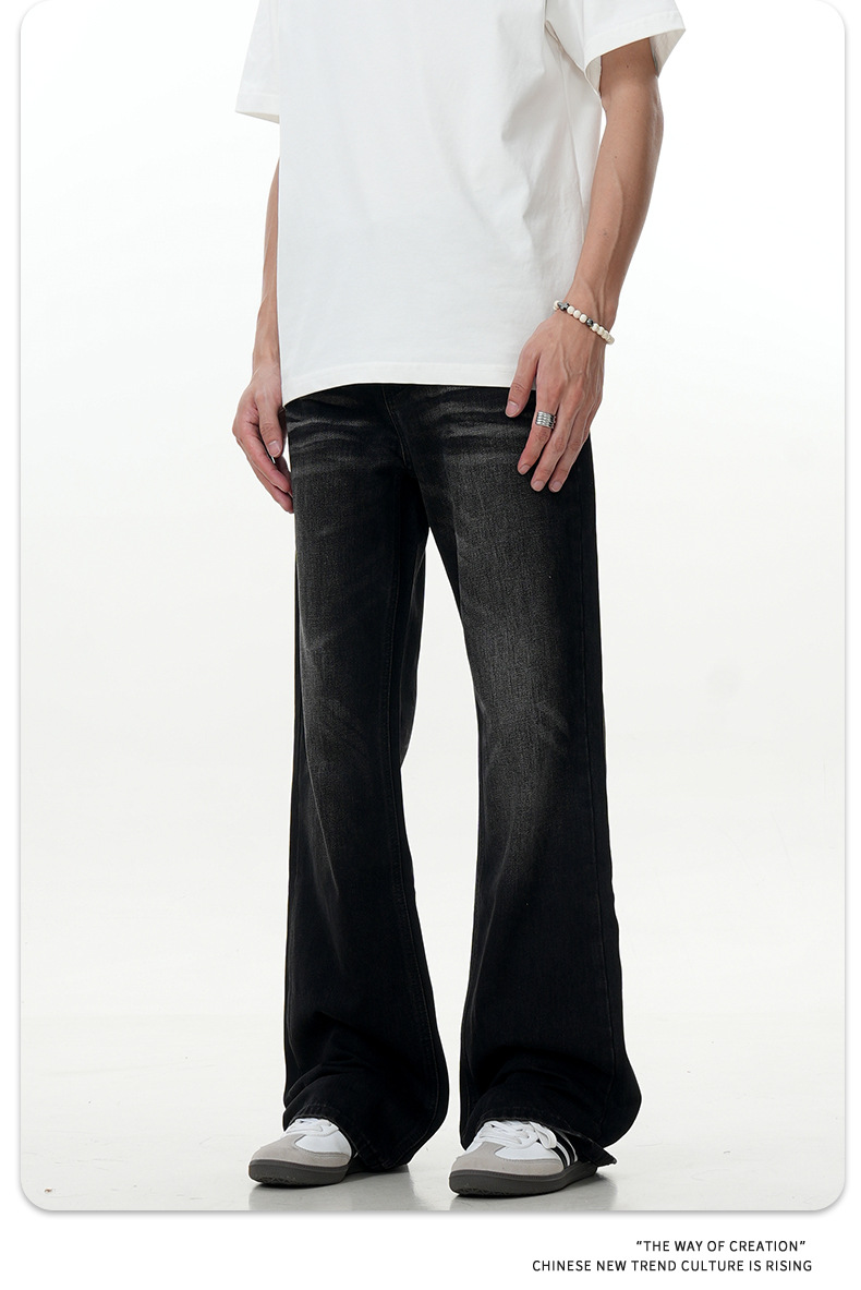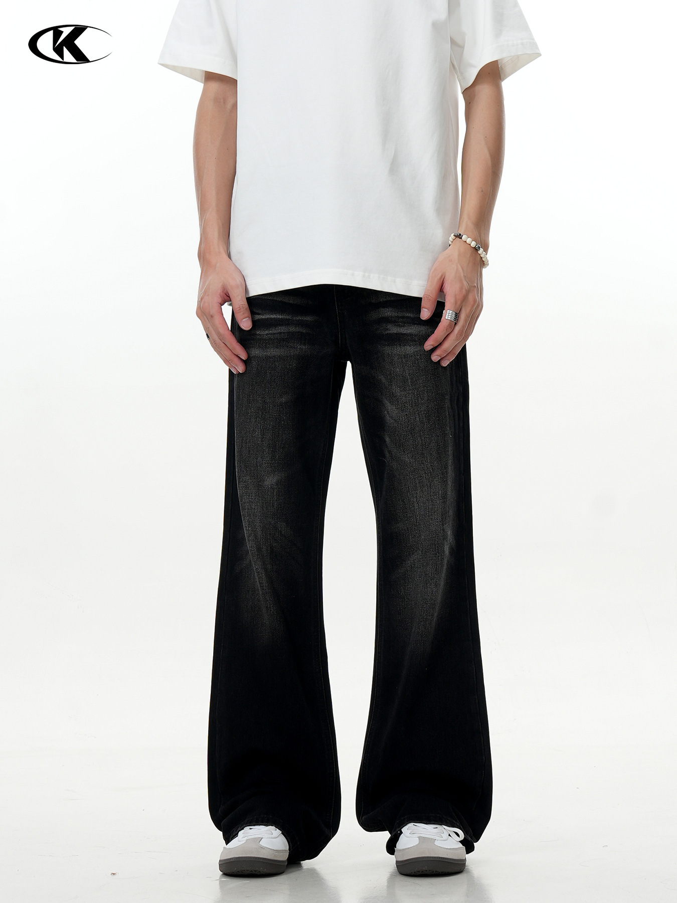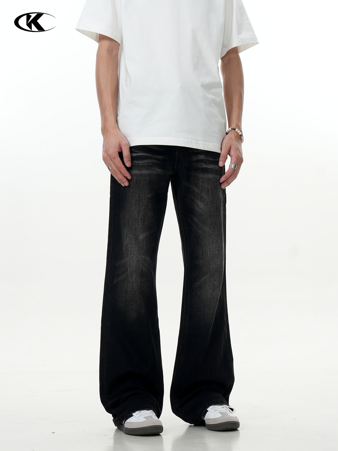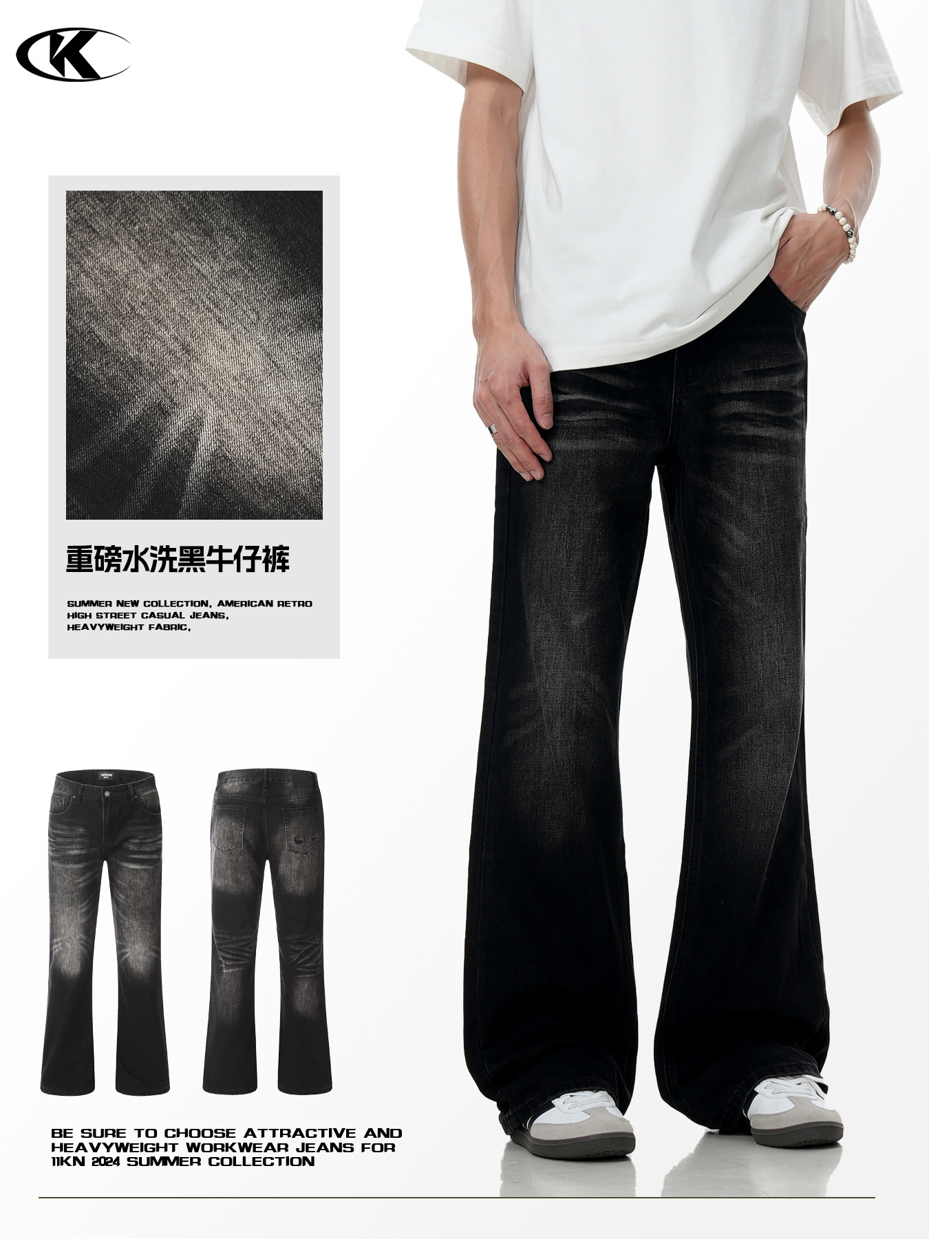 11KN American retro washed black high street cat whisker gradient jeans for men and women, loose and slightly flared pants, cross-border