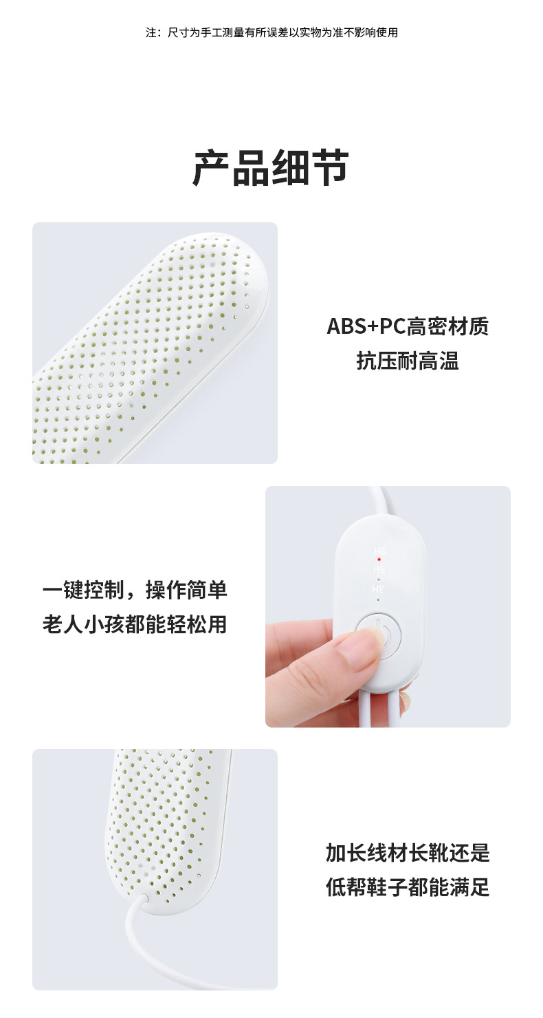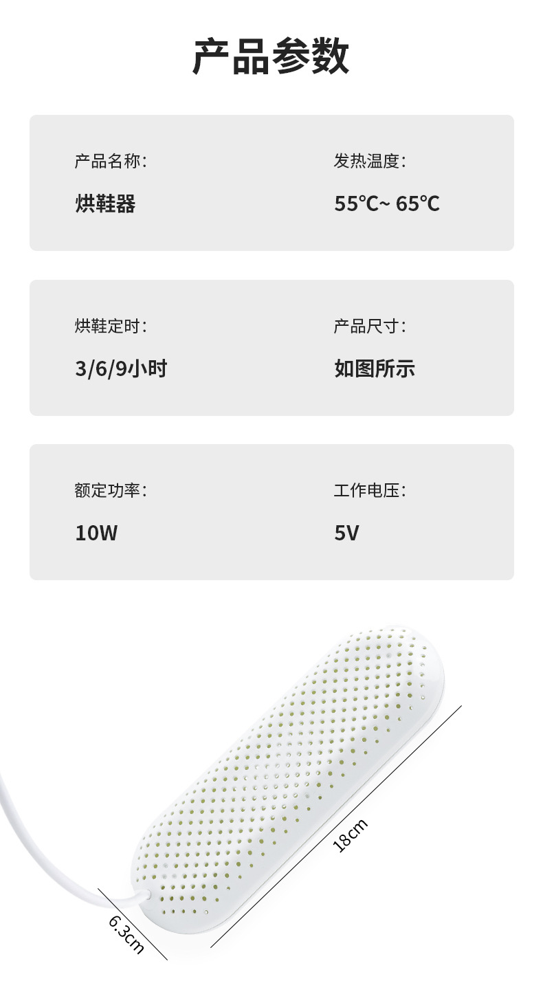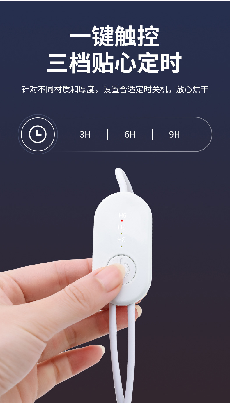 产品特点 1.定时3-6-9小时 2.陶瓷发热片,安全高效 3.恒温不伤鞋。