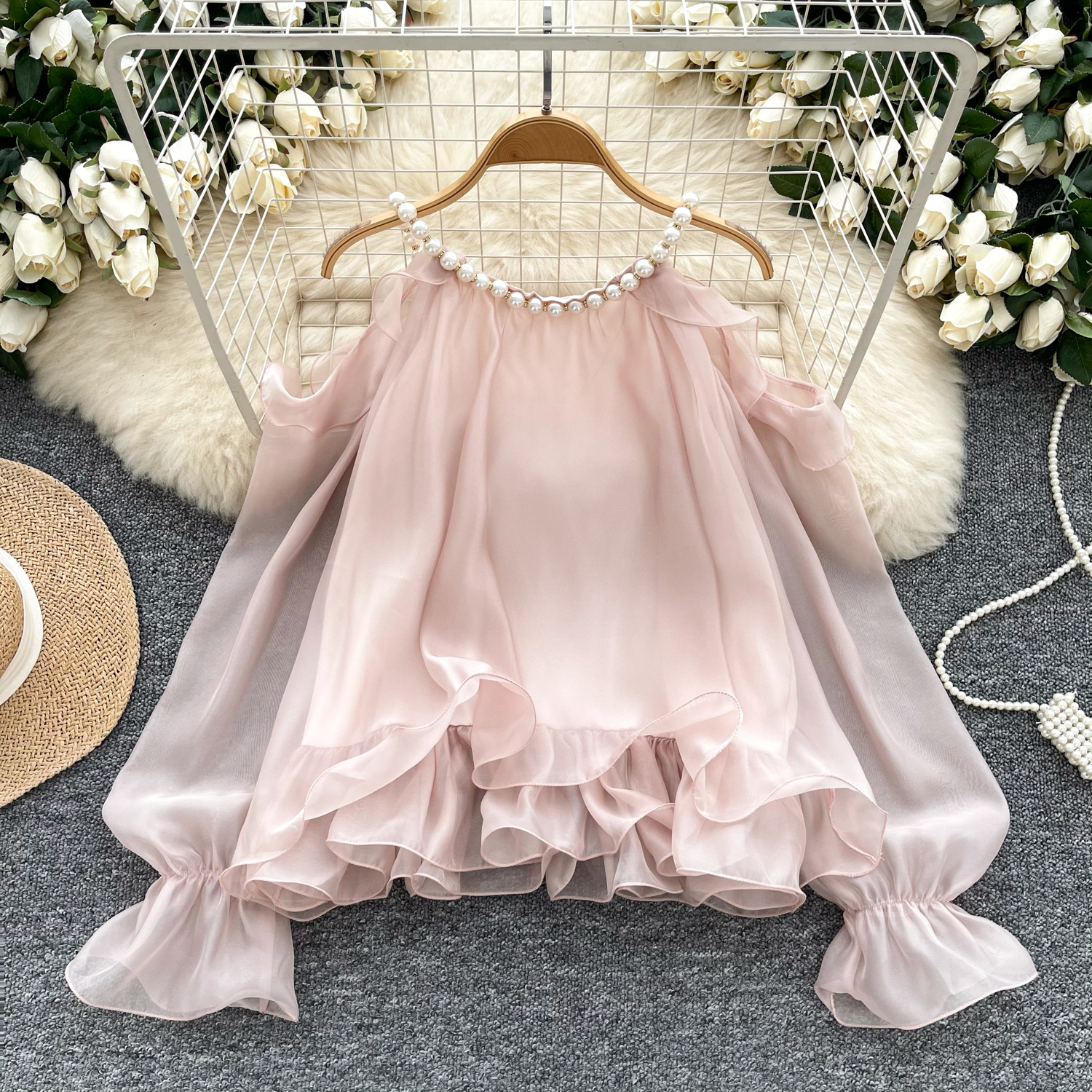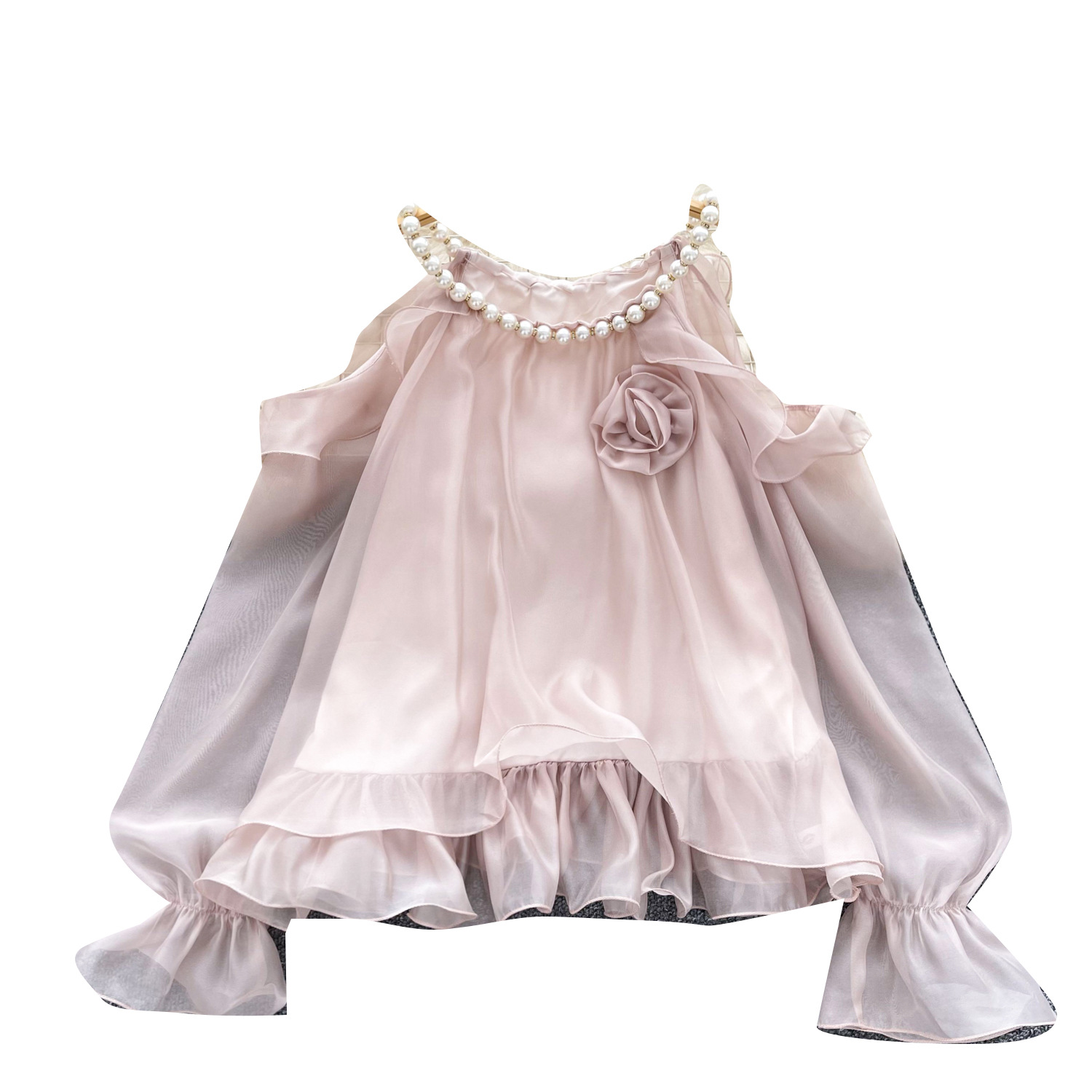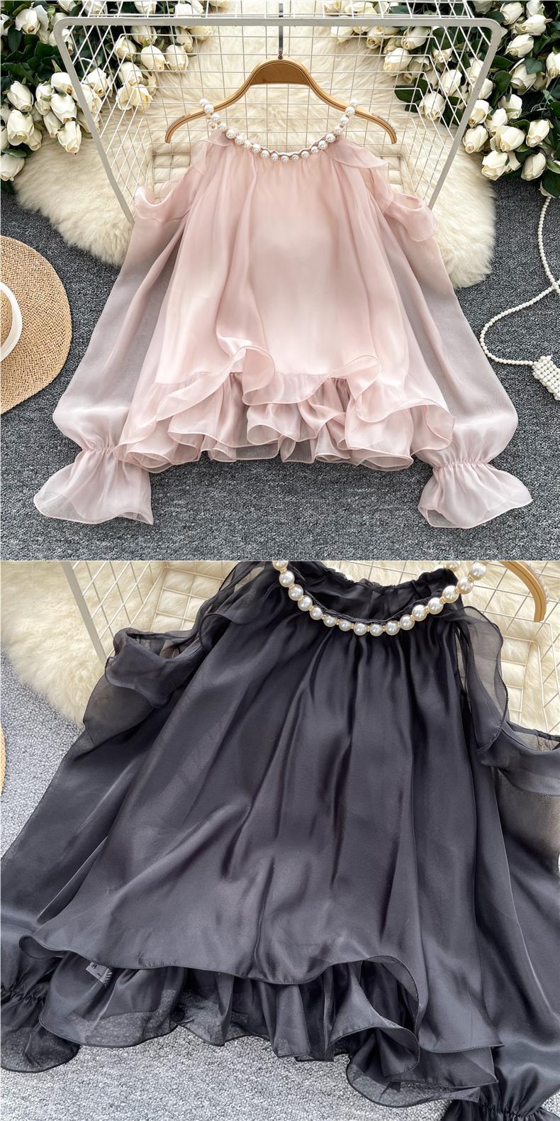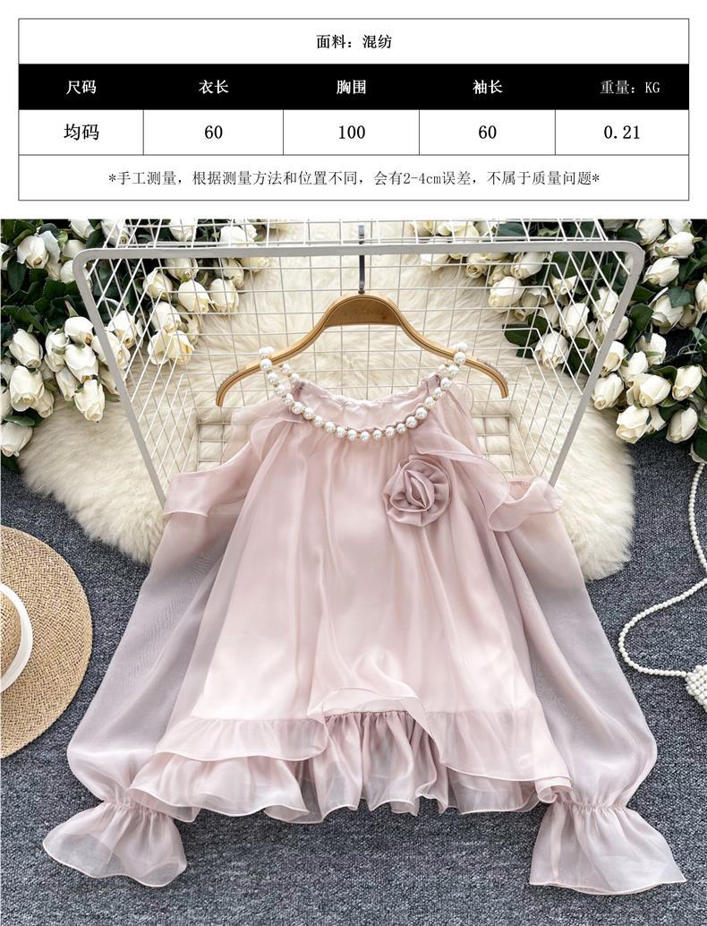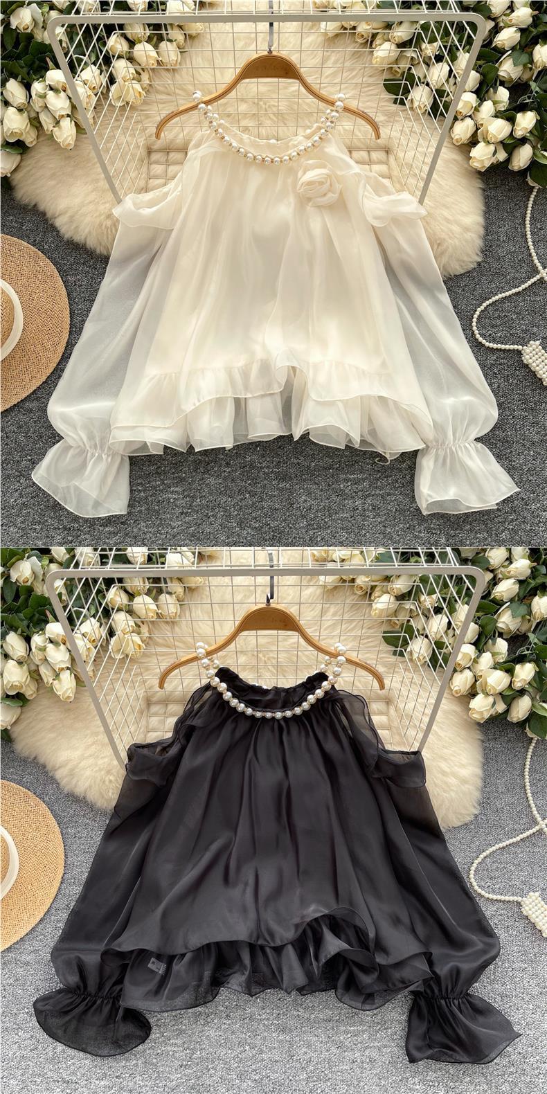 부드러운 착용 여성용 가을 착용 달콤한 구슬 매달려 목 민소매 할로우 오픈 숄더 트럼펫 슬리브 쉬폰 셔츠 긴 소매 셔츠