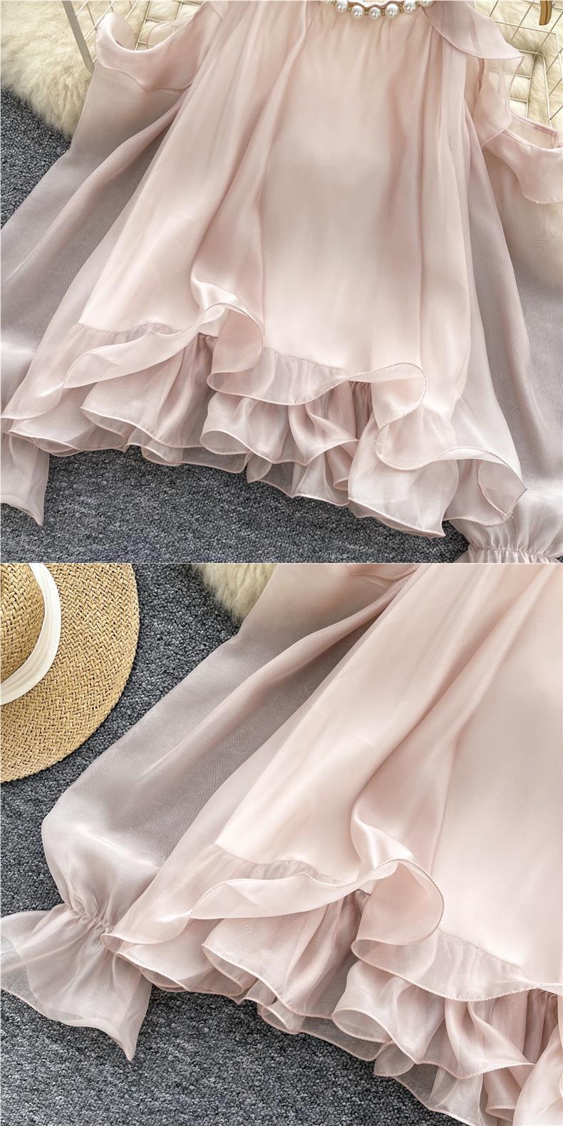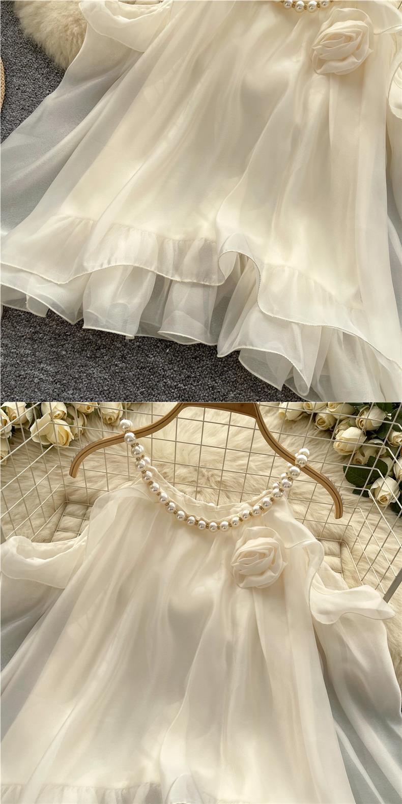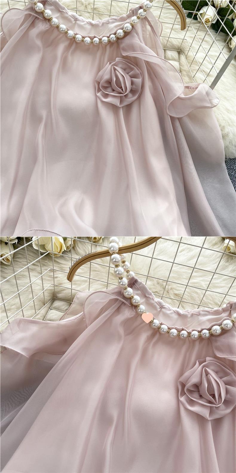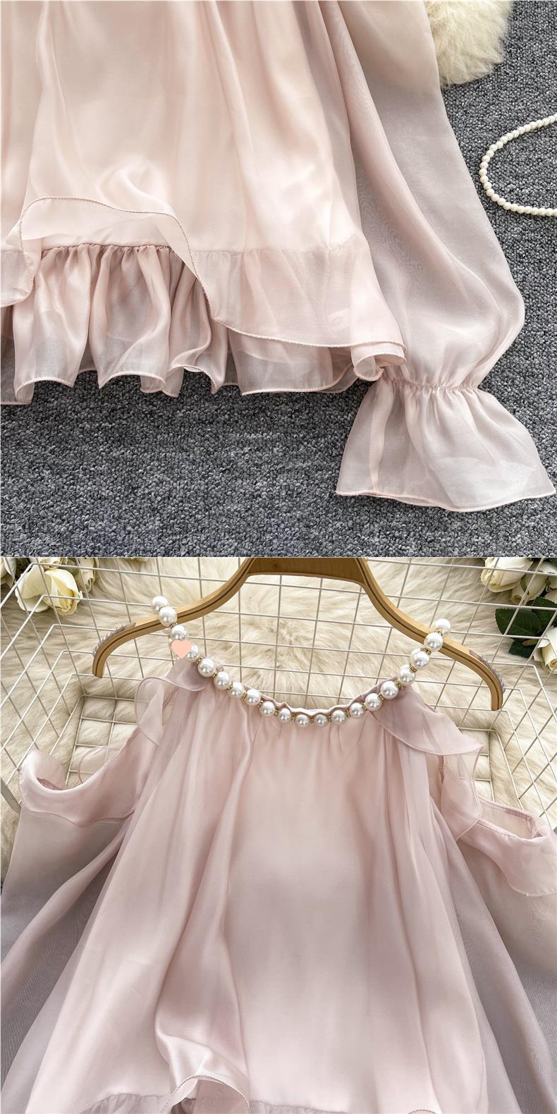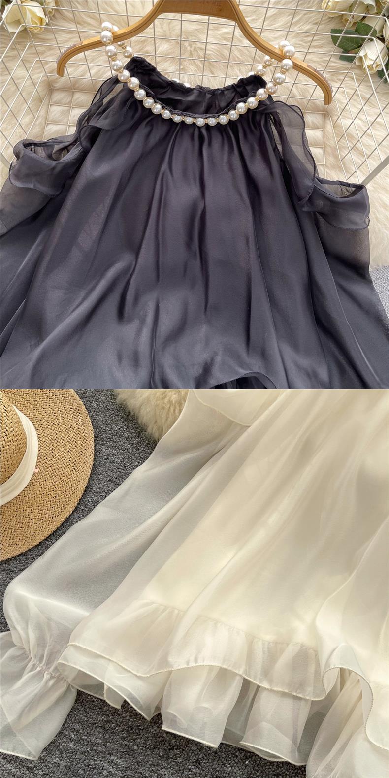 부드러운 착용 여성용 가을 착용 달콤한 구슬 매달려 목 민소매 할로우 오픈 숄더 트럼펫 슬리브 쉬폰 셔츠 긴 소매 셔츠