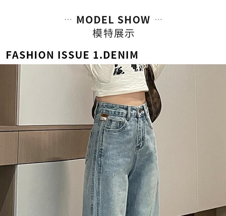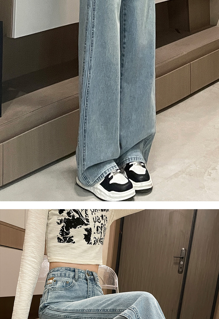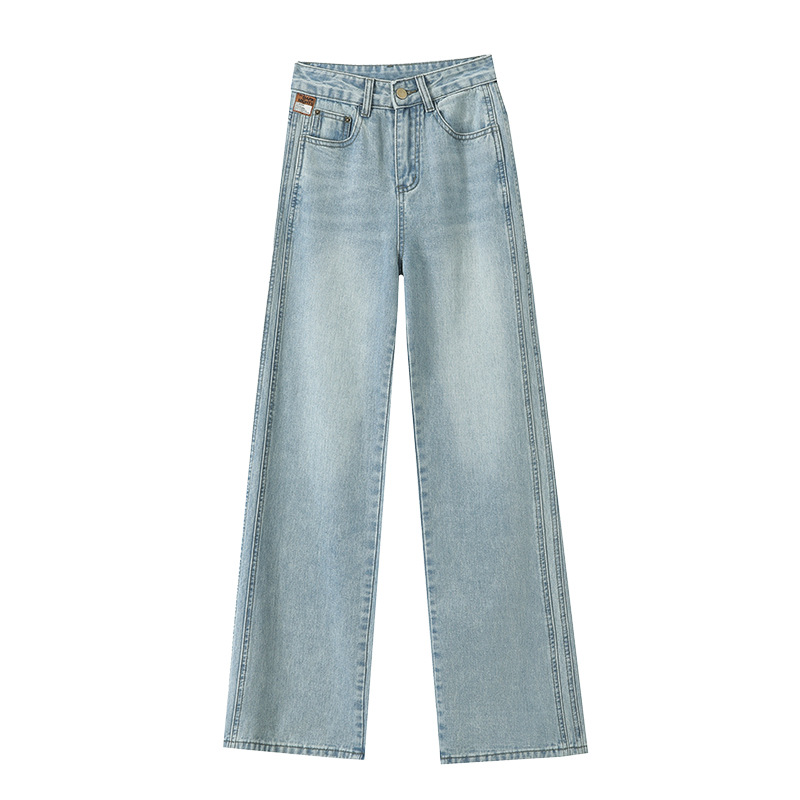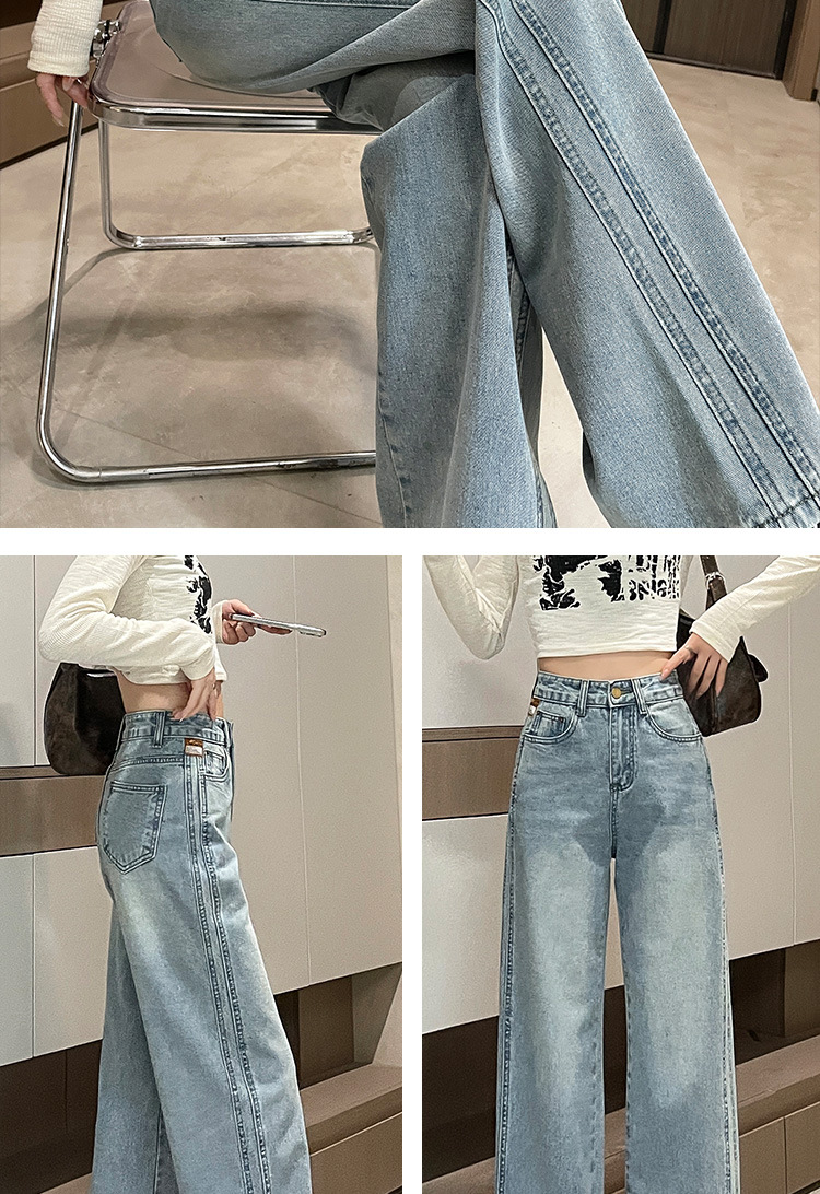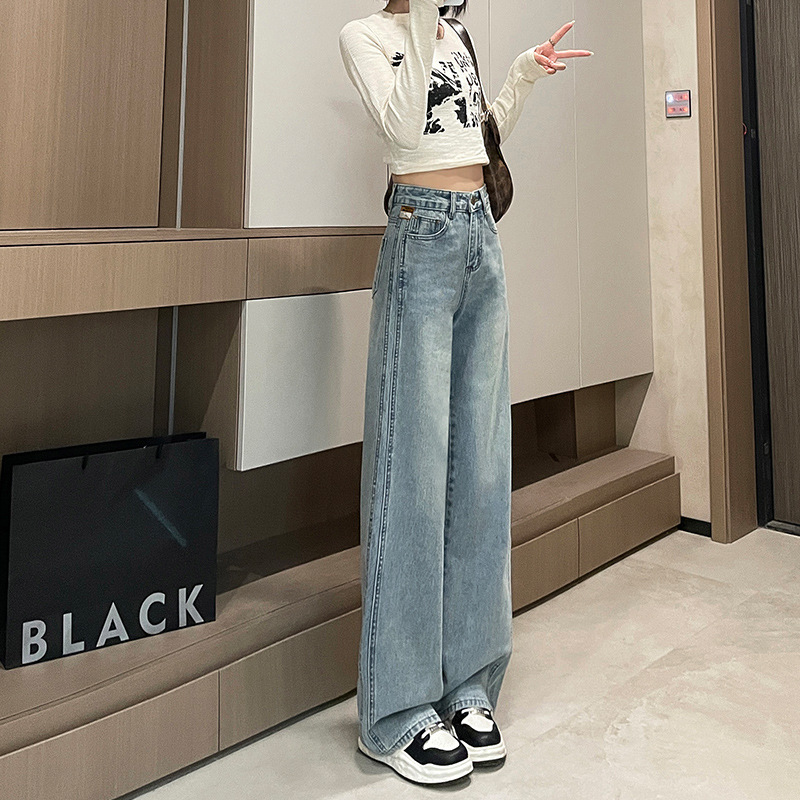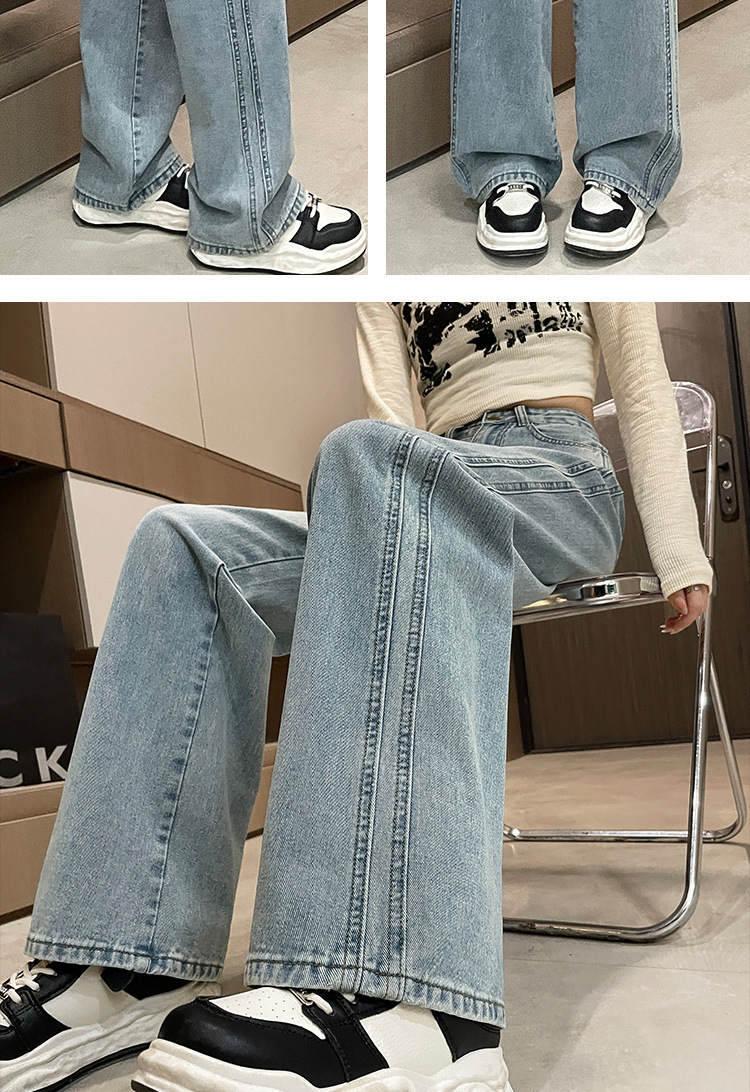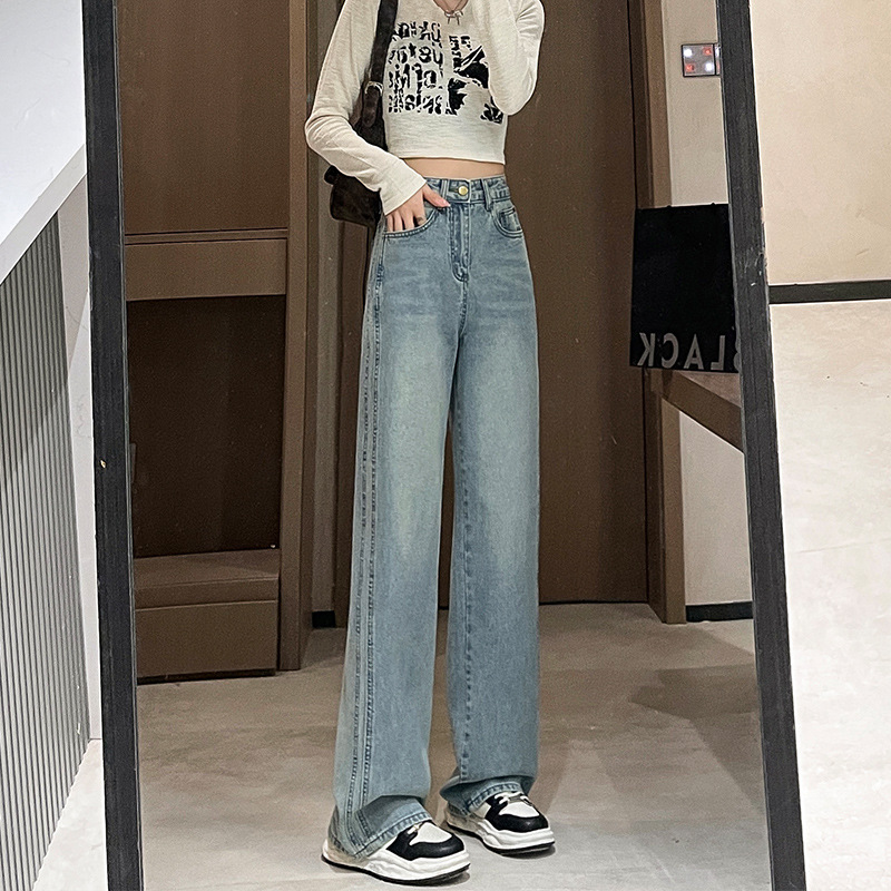 라이트 블루 넓은 다리 청바지 여성의 가을 새로운 레트로 향수 대비 컬러 측면 측면 좁은 버전 걸레 긴 바지