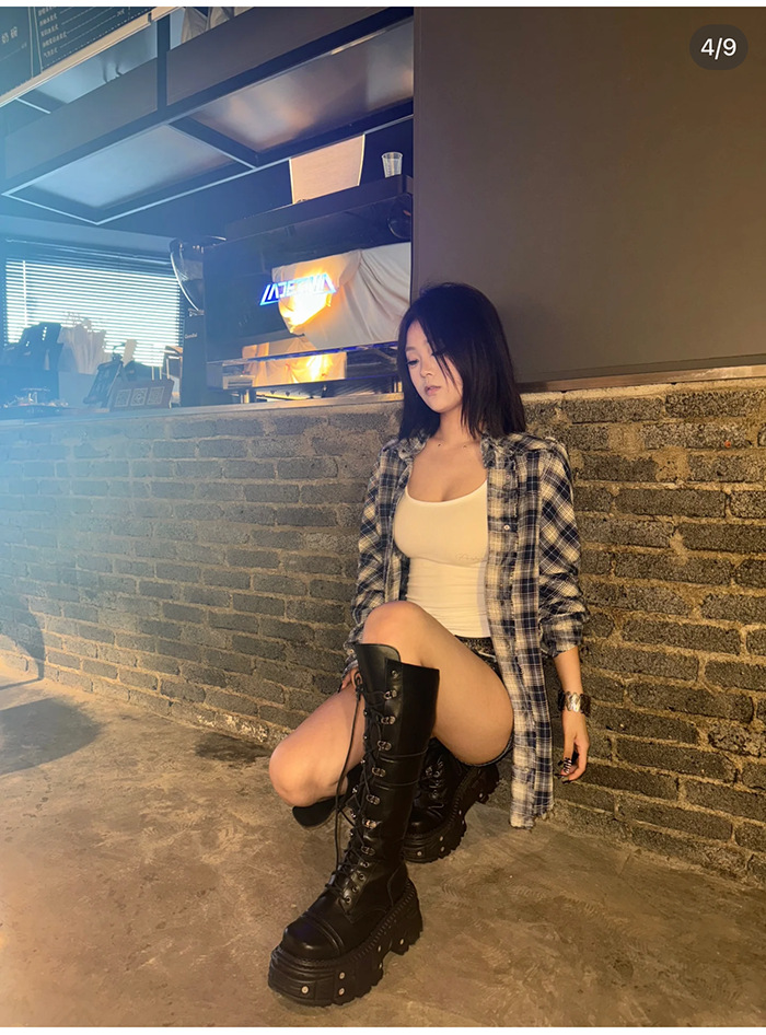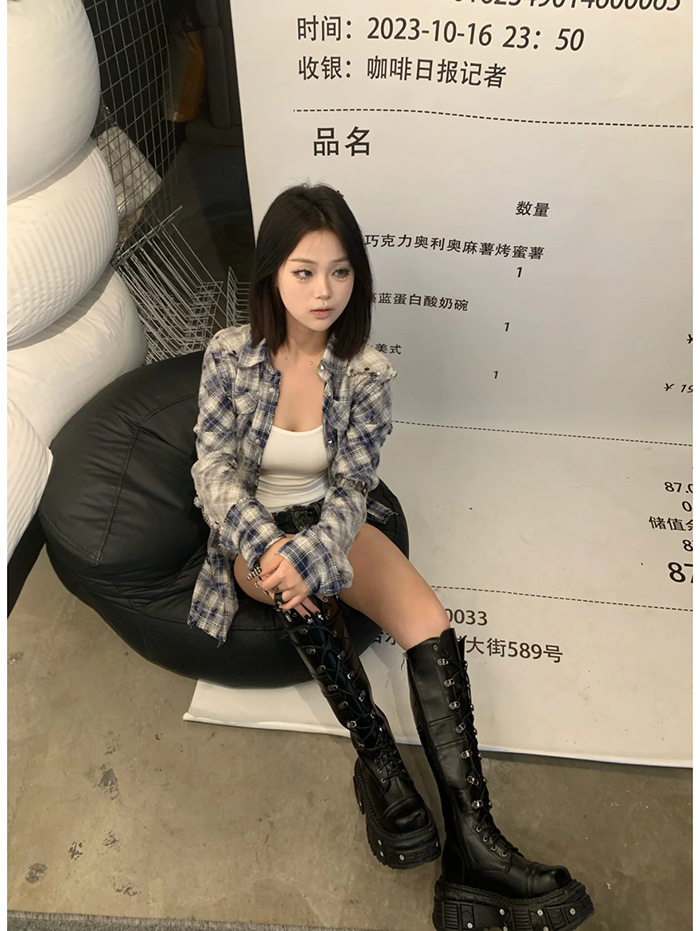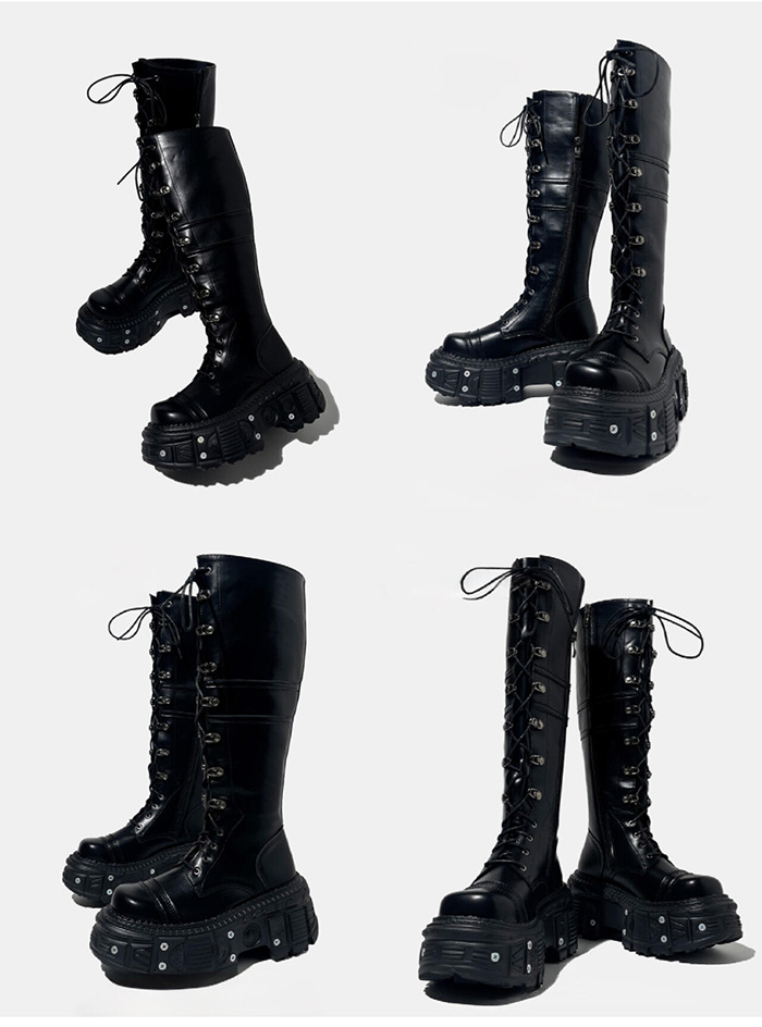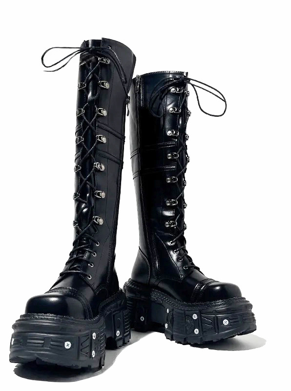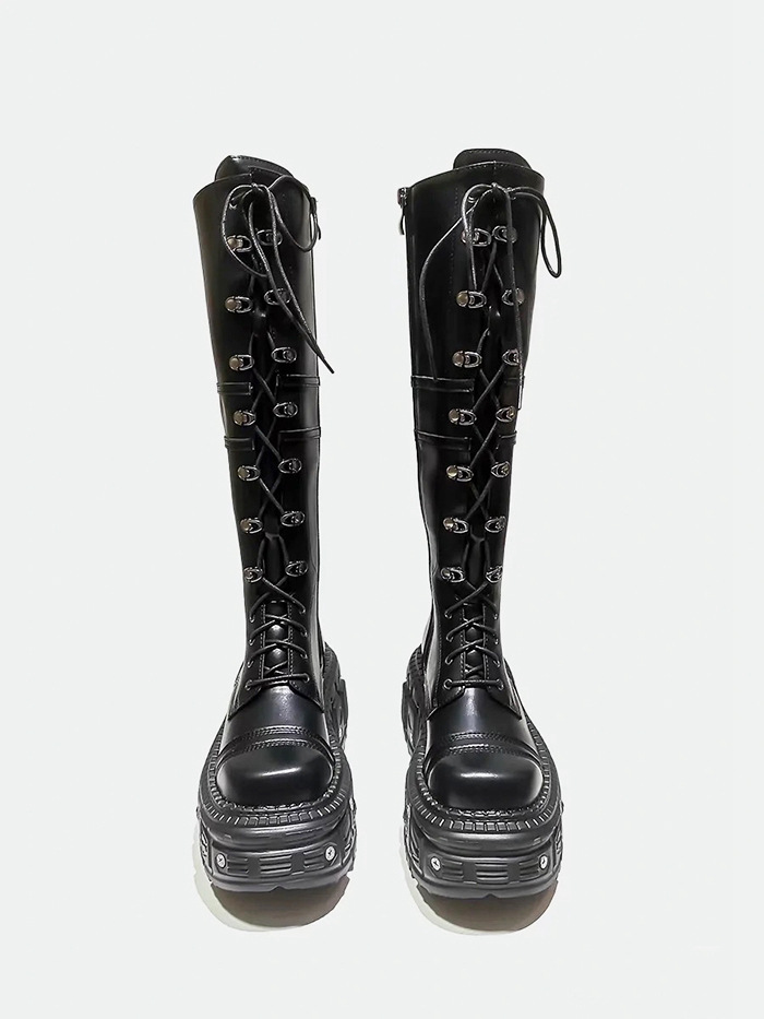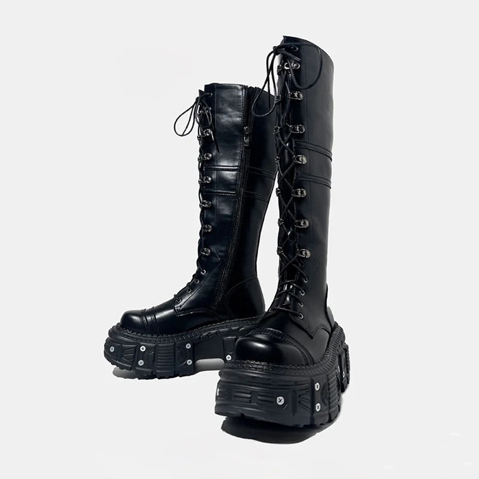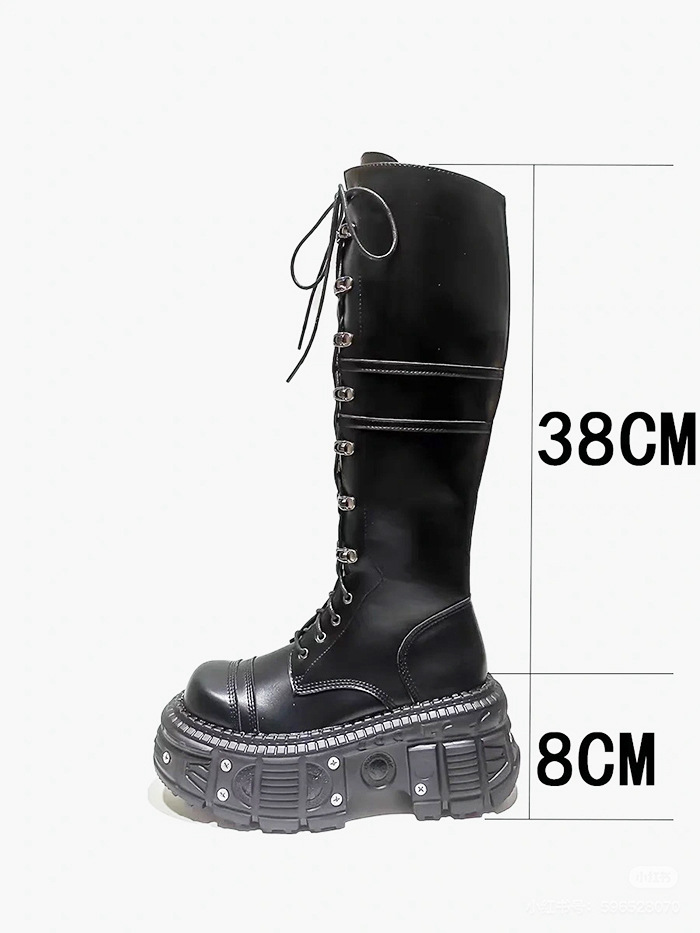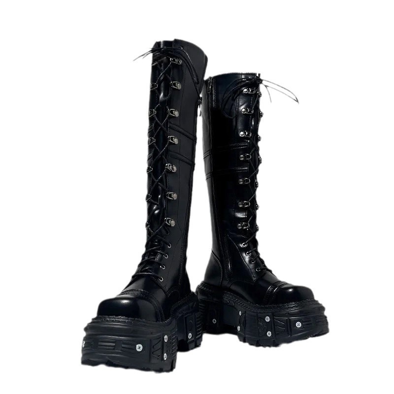 그러나 무릎 롱 부츠 여자의 2024 새로운 레이스 업 하이 부츠 증가 기사 부츠 두꺼운 바닥 펑크 레트로 펑크 스타일
