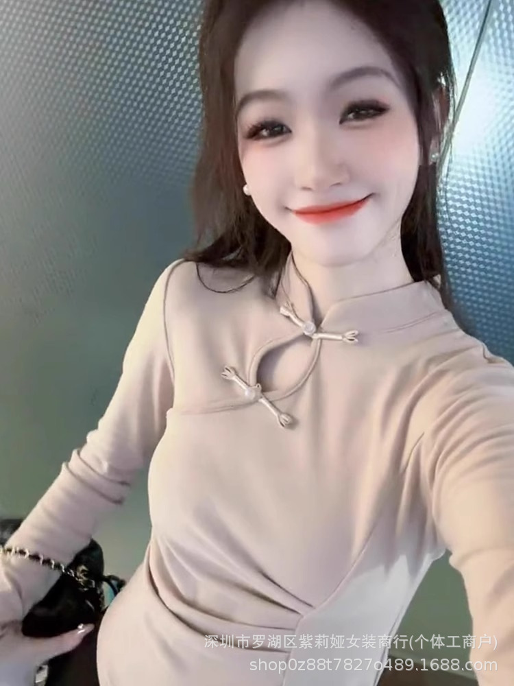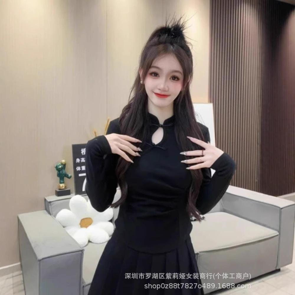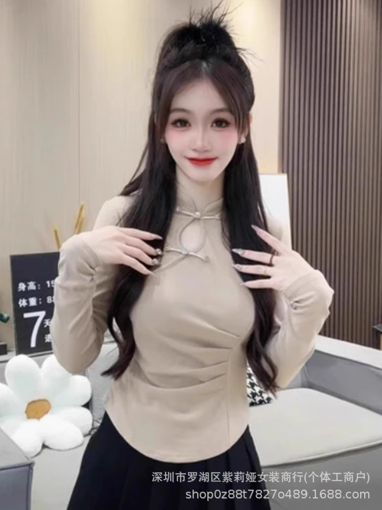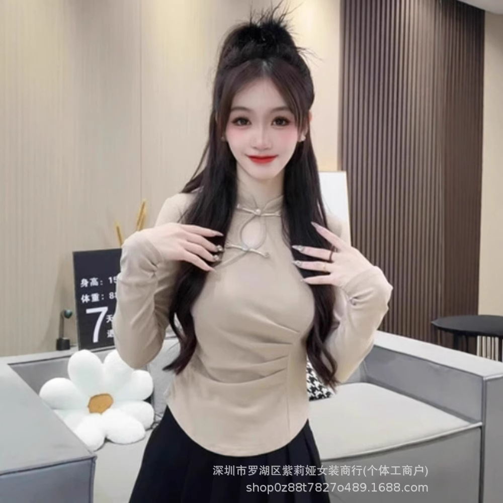 [1 × 1 스레드 벨벳] 반 높은 칼라 새로운 중국 스타일 국가 스타일 버클 티셔츠베이스 슬림 핏 긴 소매 탑