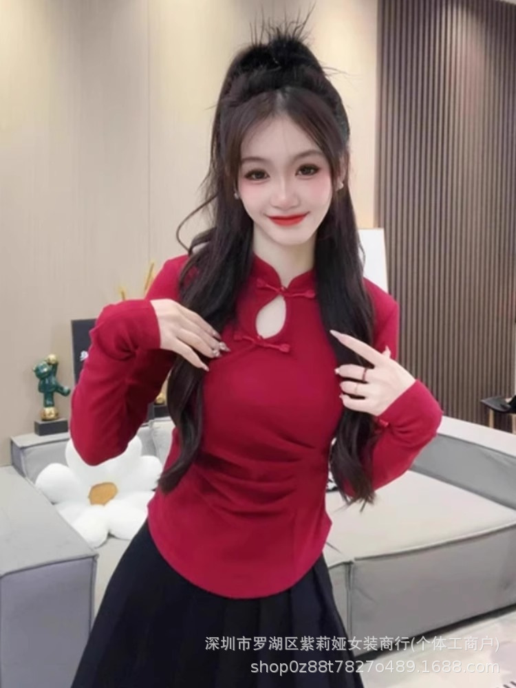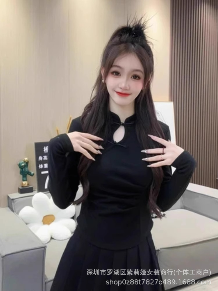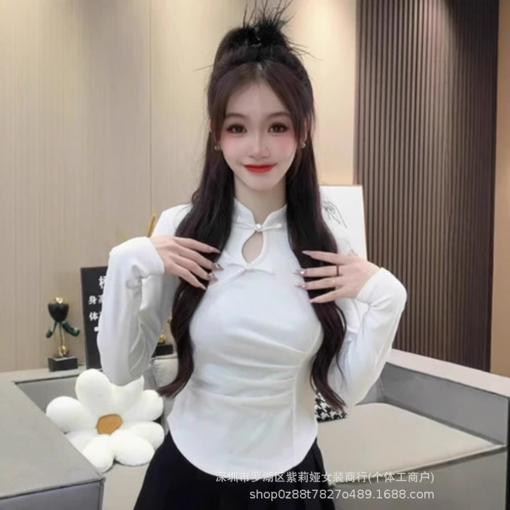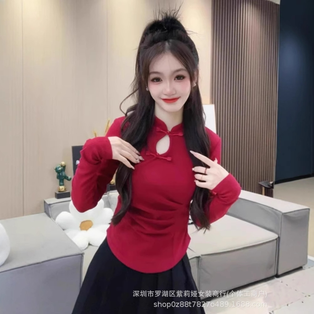 [1 × 1 스레드 벨벳] 반 높은 칼라 새로운 중국 스타일 국가 스타일 버클 티셔츠베이스 슬림 핏 긴 소매 탑