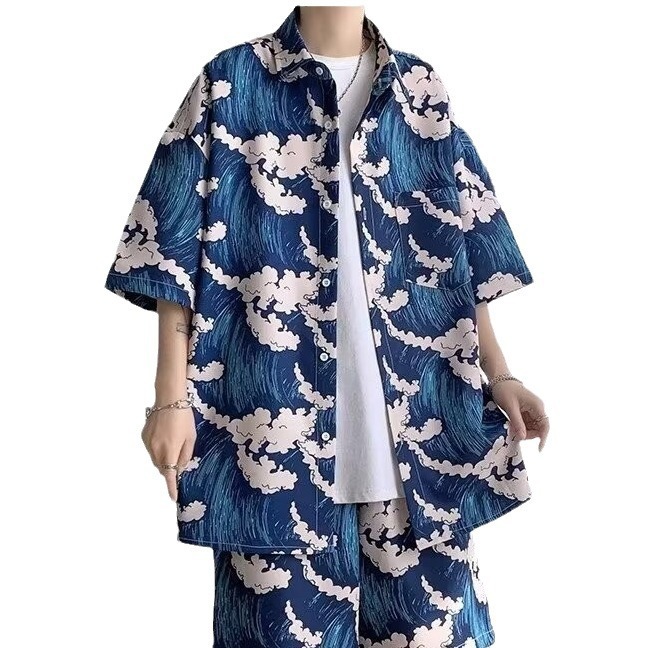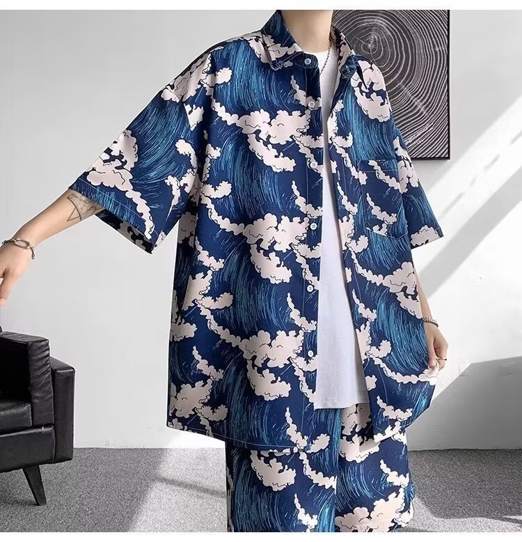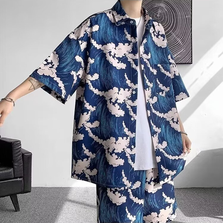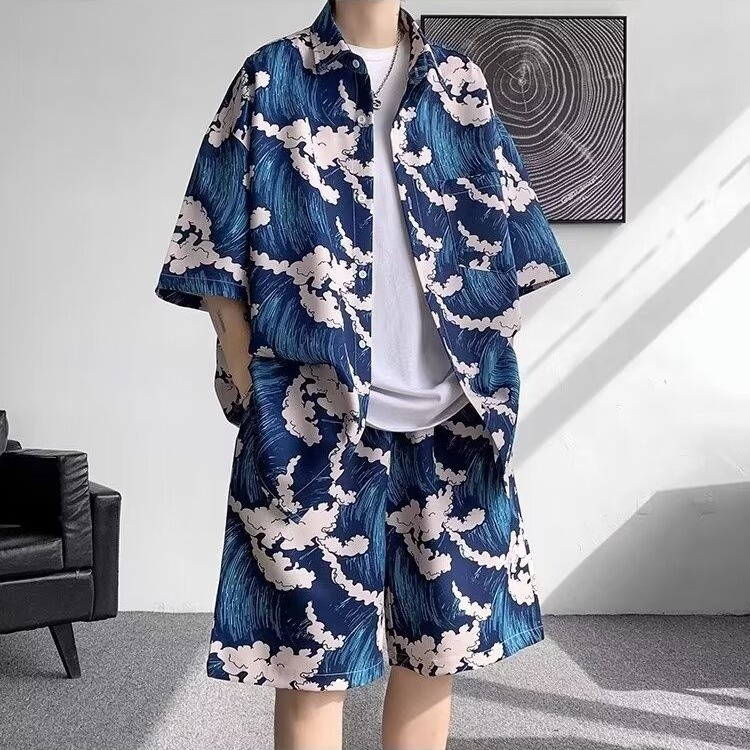 싼야 비치 세트 남자 여름 하이난 섬 비치 셔츠 해변 휴가 남자 꽃 셔츠 아이스 실크 옷