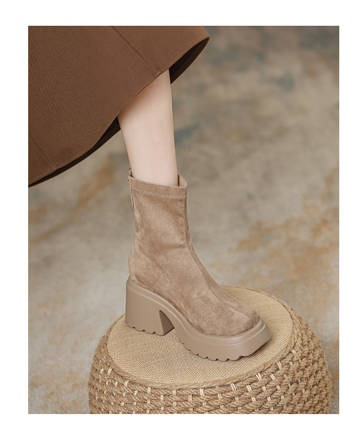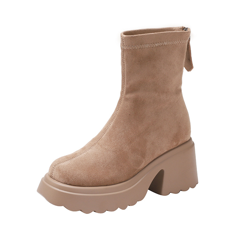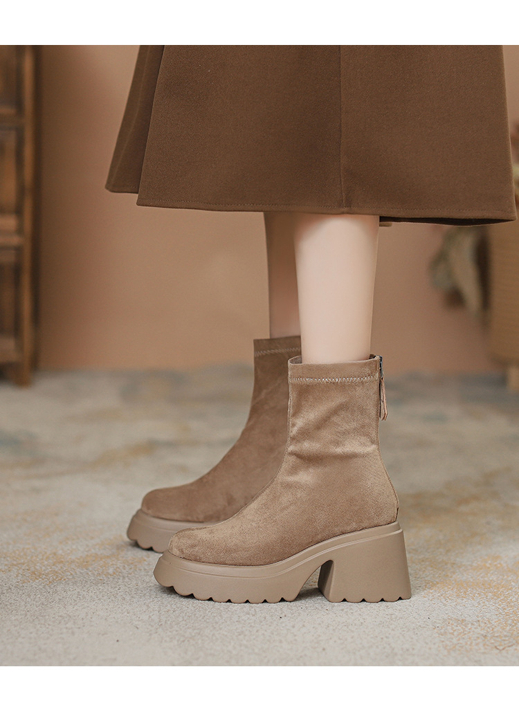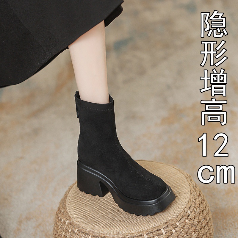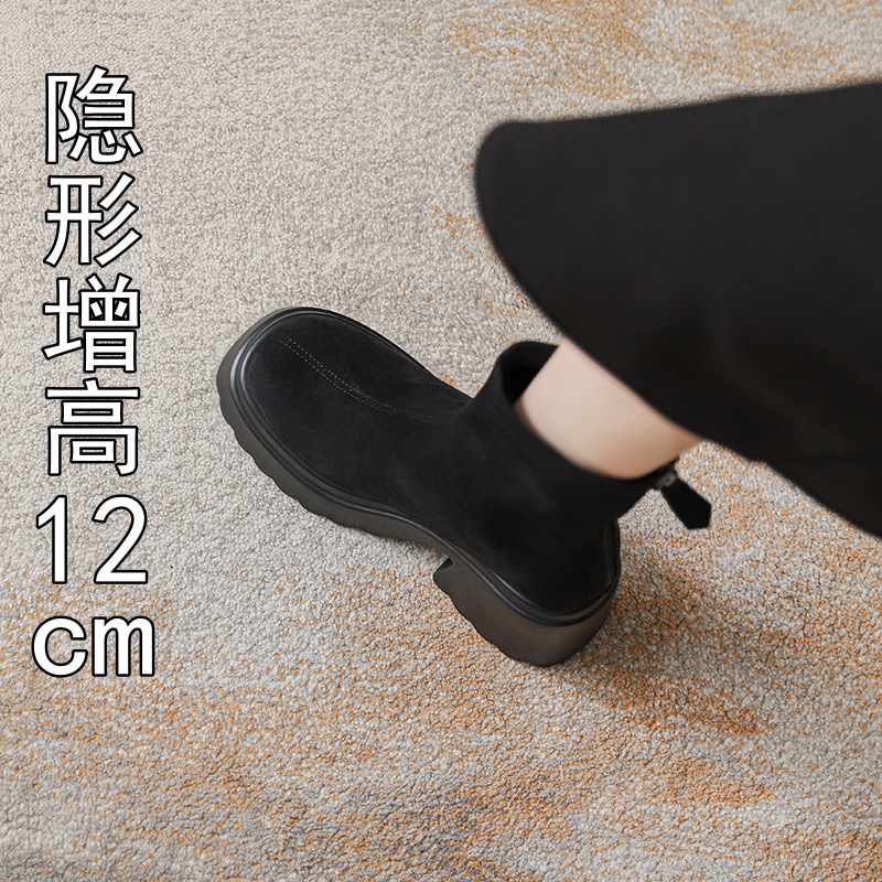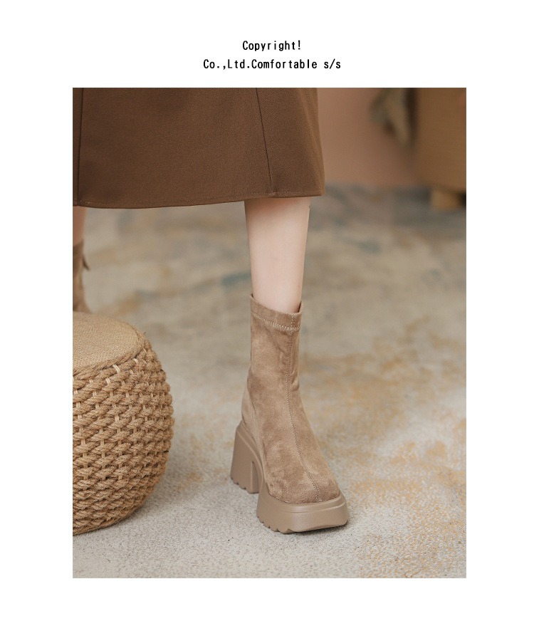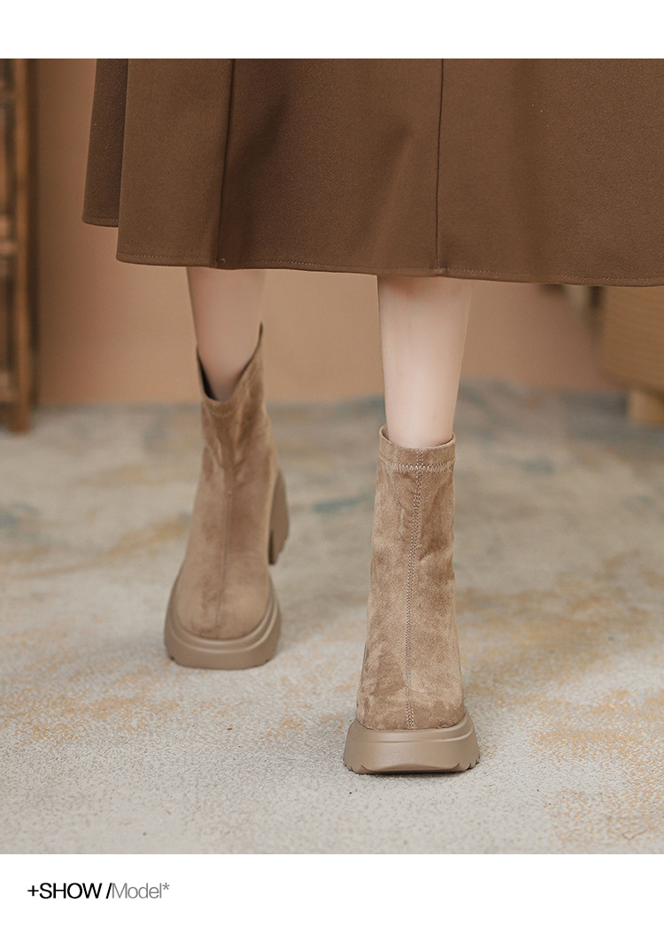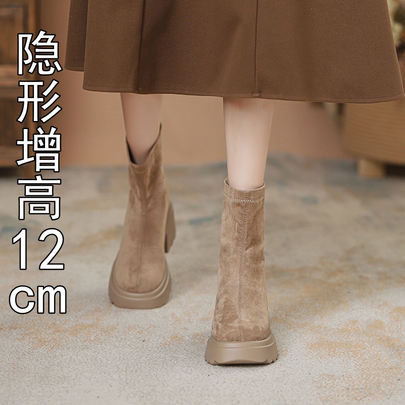 2025년 신상 가을 겨울 슬림 브라운 탄력성 슬림 부츠 여성용 키높이 숏부츠 두꺼운 밑창 영국 스타일 마틴 부츠
