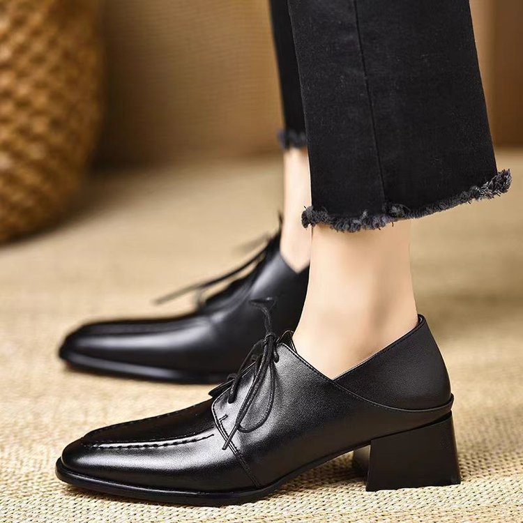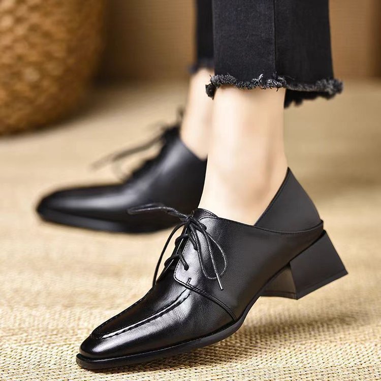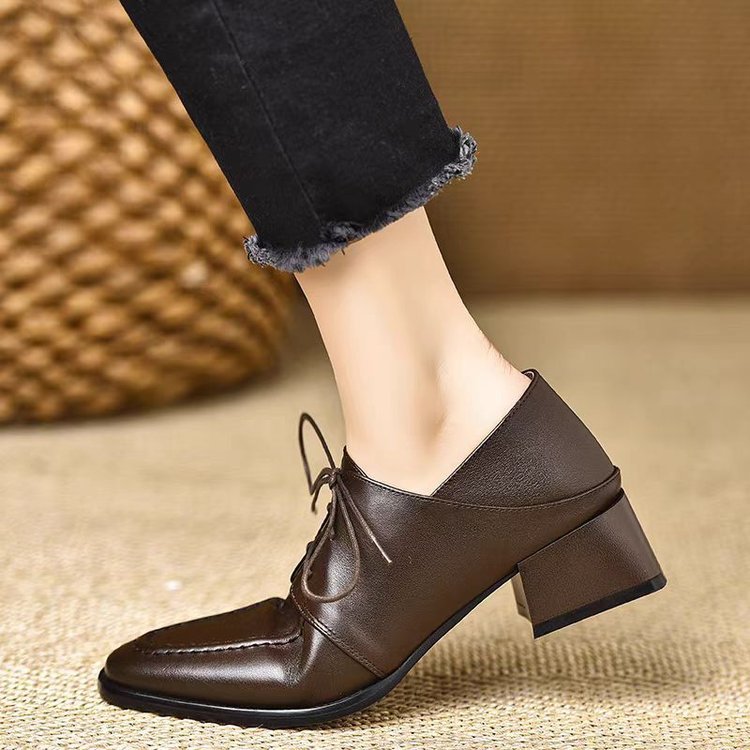 빈티지 아카데미 스타일 미드 힐 스퀘어 발가락 가죽 신발 여성 영국 스타일 깊은 입 레이스 업 신발 여성 두꺼운 발 뒤꿈치 소프트 가죽 로퍼