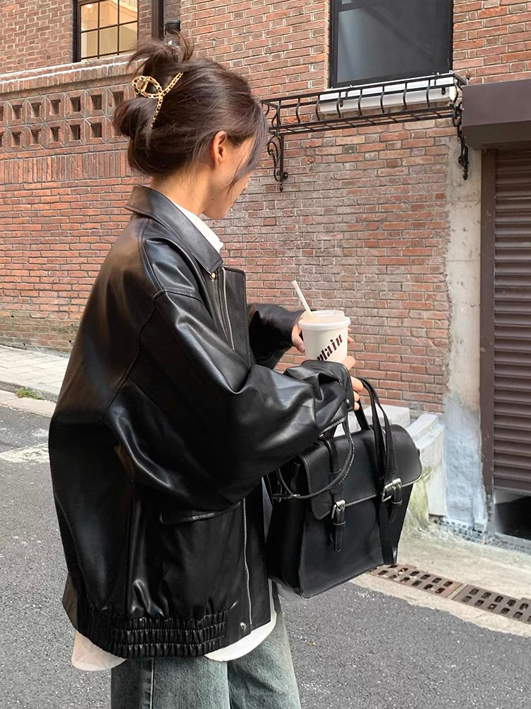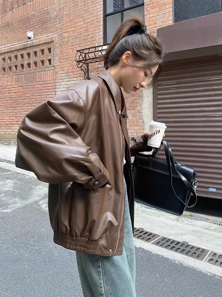 레트로 브라운 가죽 자켓 여성용 숏 스타일 2025 가을용 한국 스타일 루즈핏 가죽 자켓 멋진 바이커 자켓