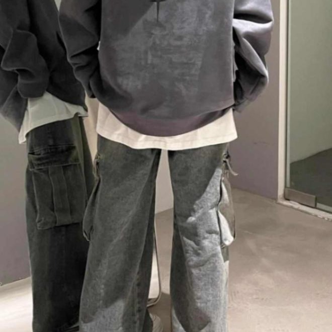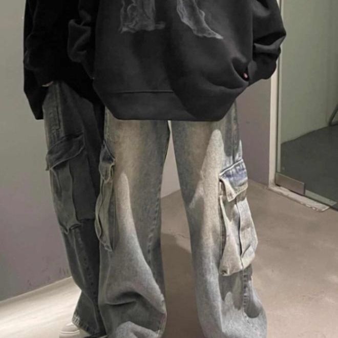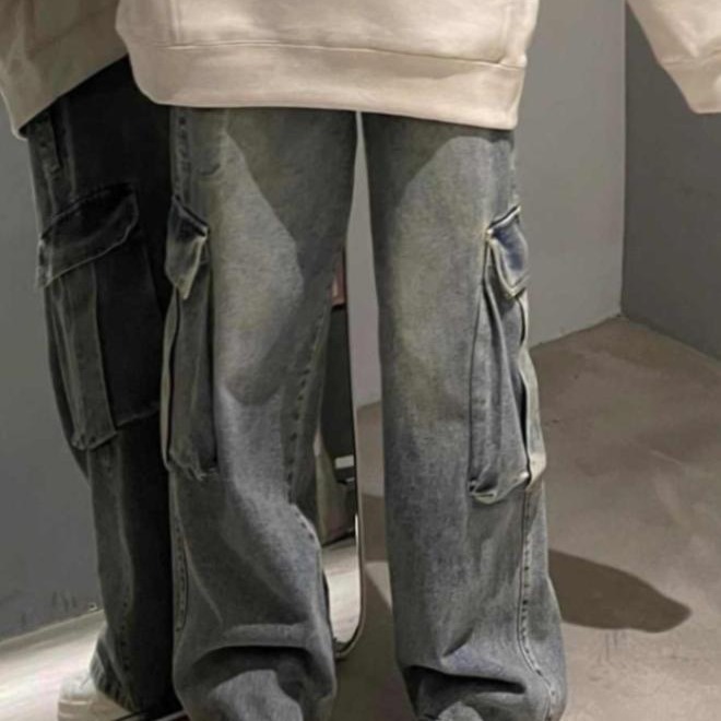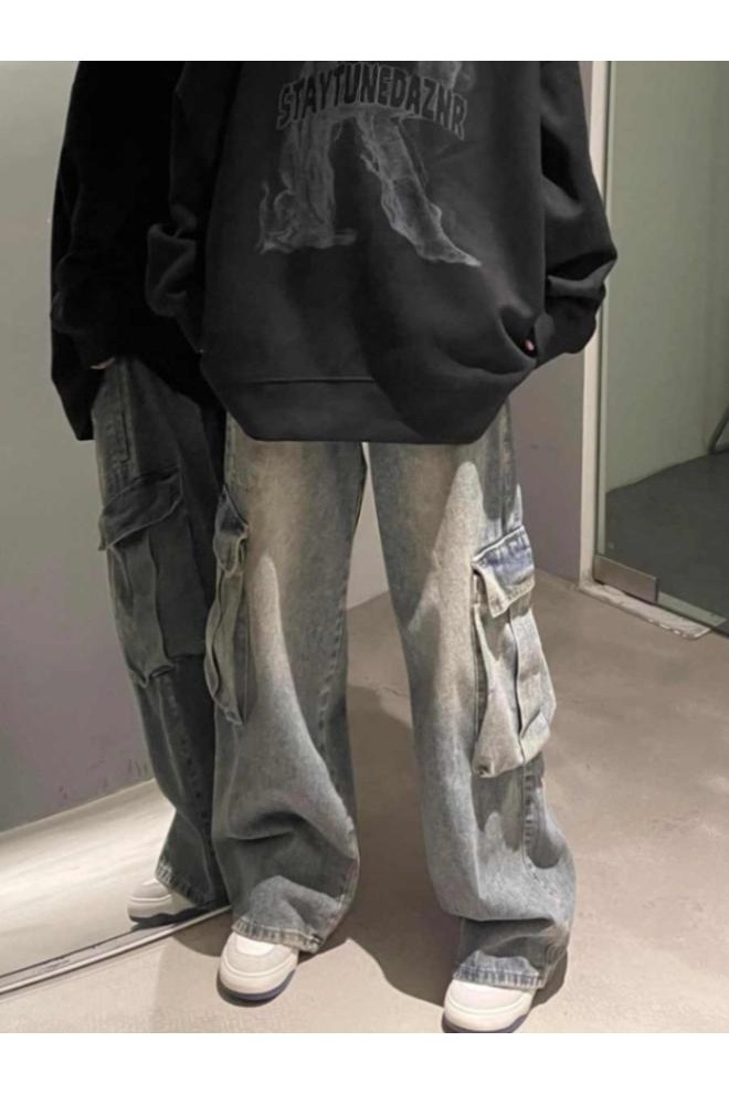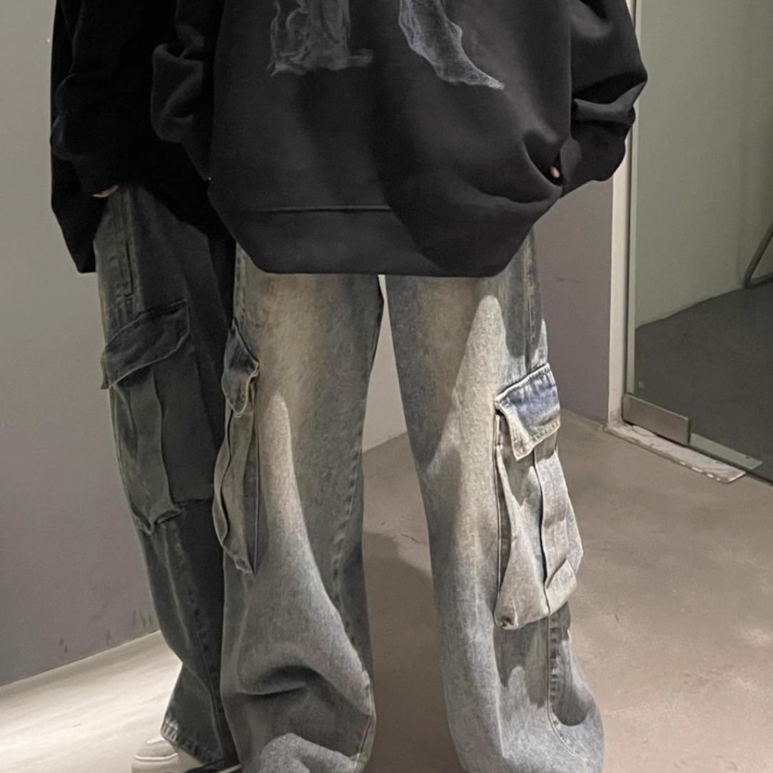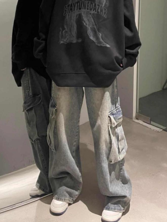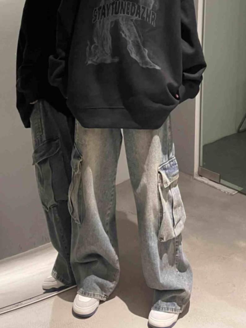 코일 청바지 남성용 가을 미국 스타일 빈티지 워시 와이드 레그 팬츠 멀티 포켓 루즈 스트레이트 캐주얼 트렌디 팬츠