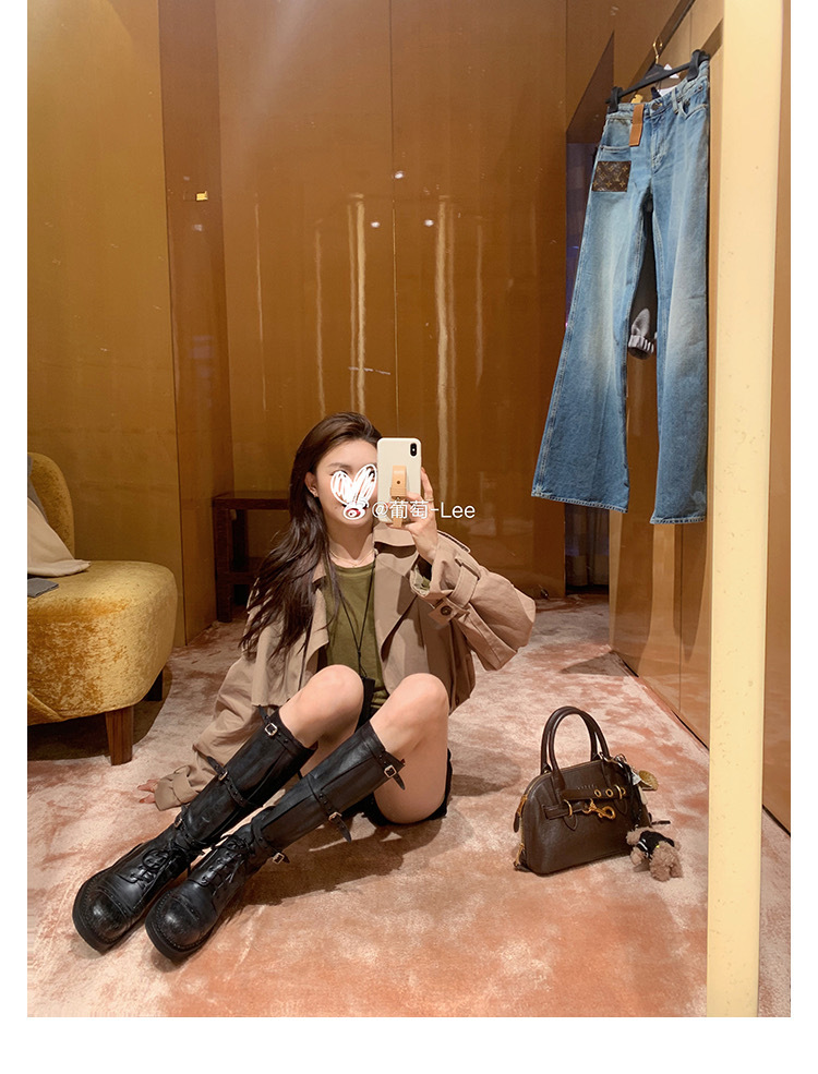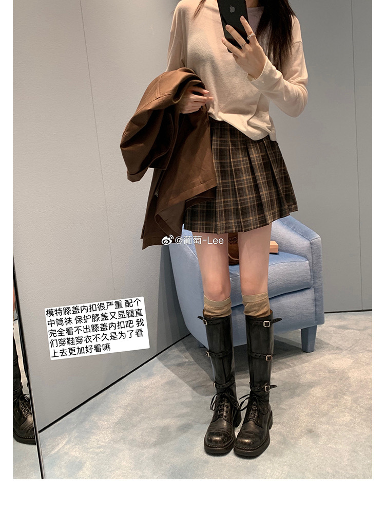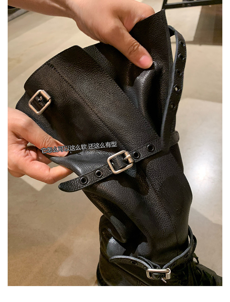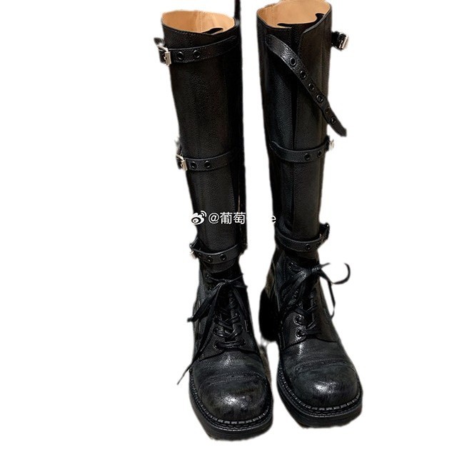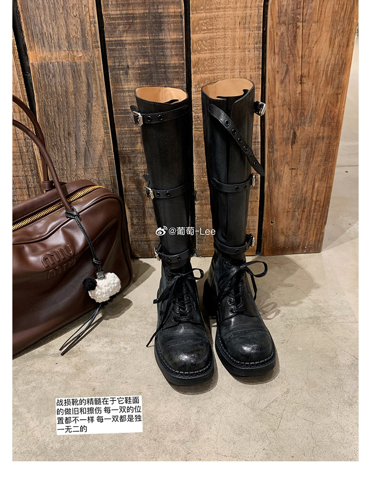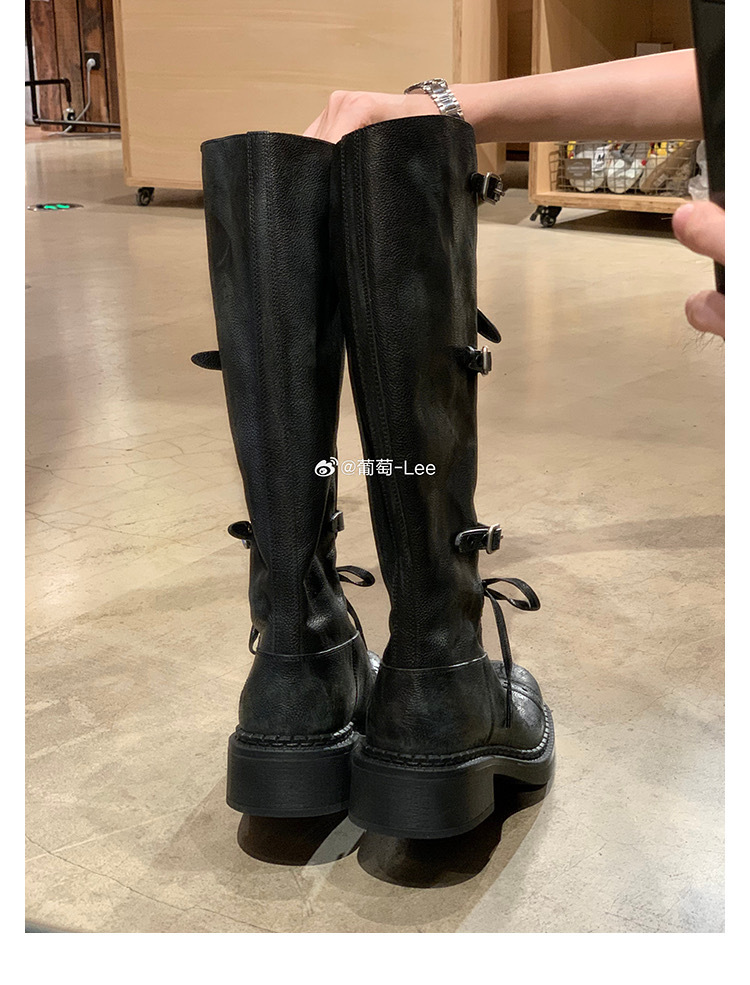 포도 엄마 studiolee 오토바이 Miu 유행 고급 벨트 버클 빈티지 두꺼운 힐 미드 하이 나이츠 부츠 여성의 가을