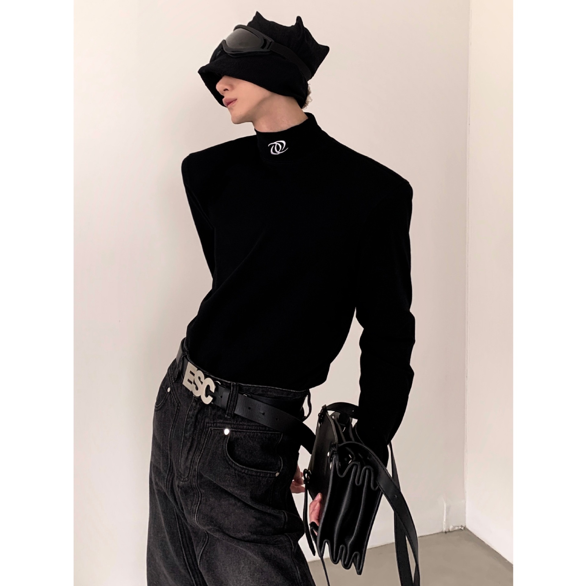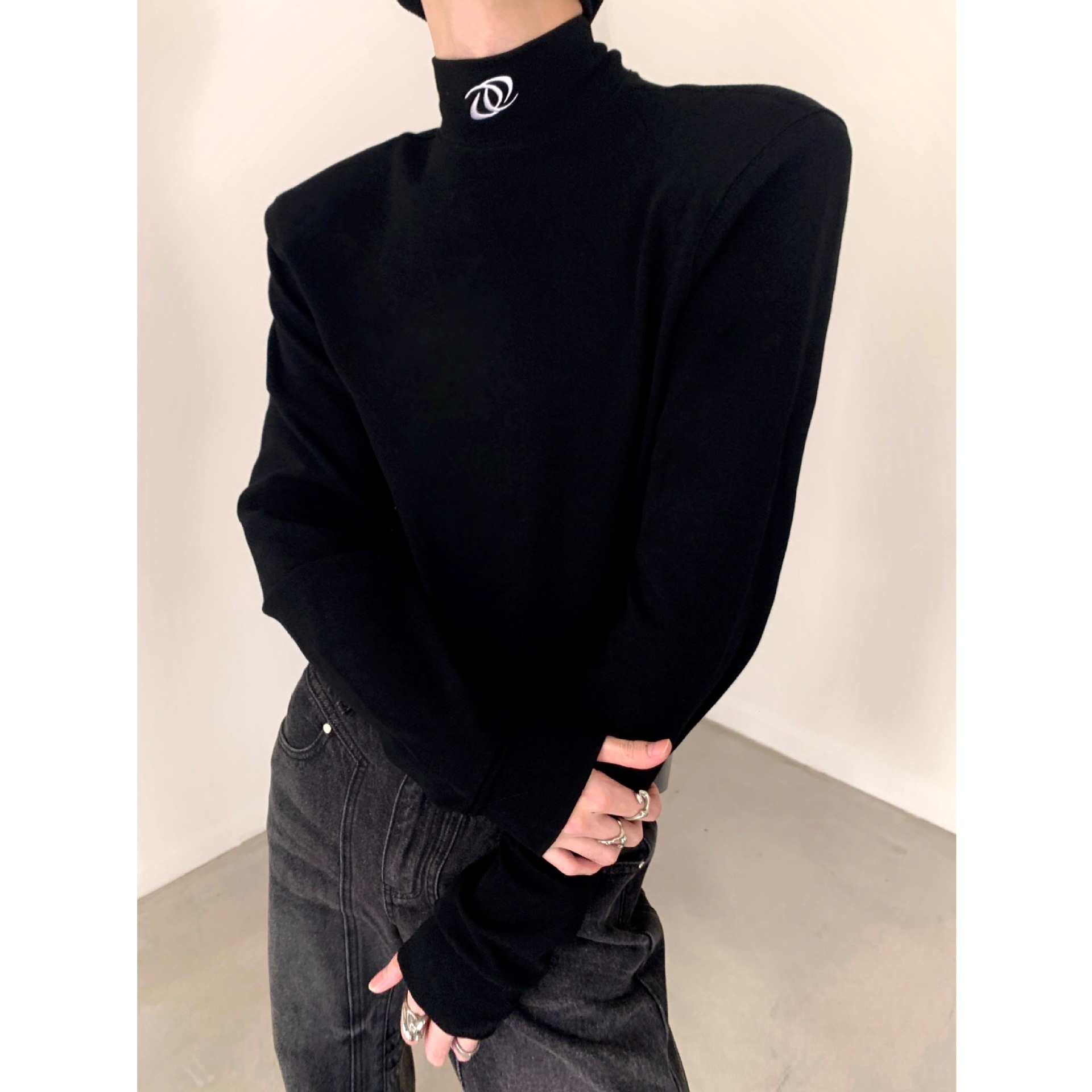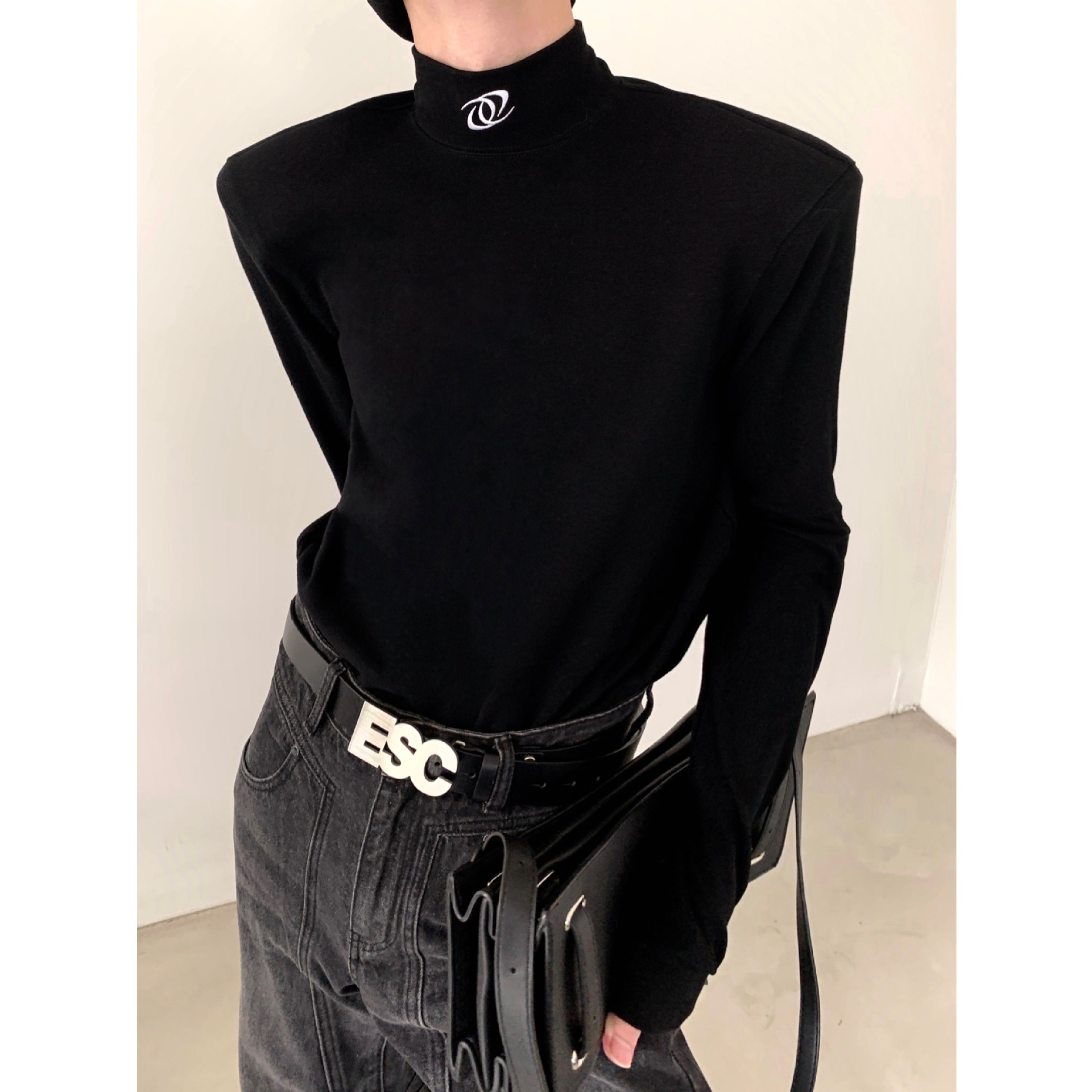 유럽과 미국의 크로스 보더 블랙 하프 하이 칼라 베이스 셔츠 남성용 하이 엔드 센스 내복 니쉬 디자인 센스 숄더 패드 긴팔 티셔츠 남성용