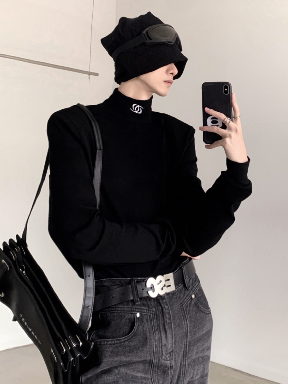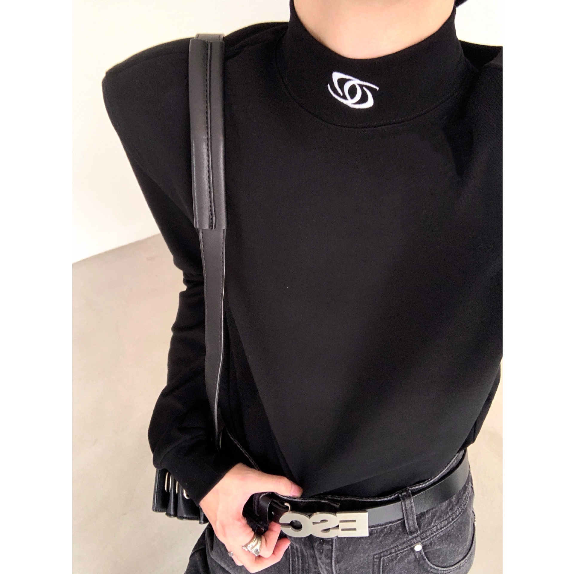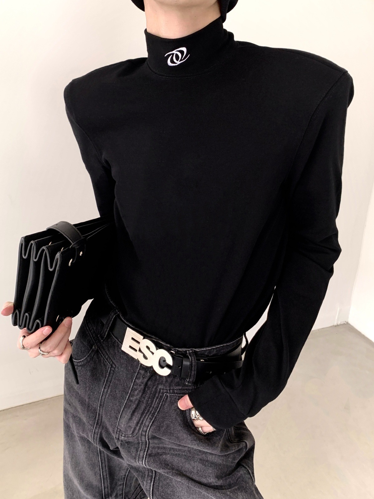유럽과 미국의 크로스 보더 블랙 하프 하이 칼라 베이스 셔츠 남성용 하이 엔드 센스 내복 니쉬 디자인 센스 숄더 패드 긴팔 티셔츠 남성용