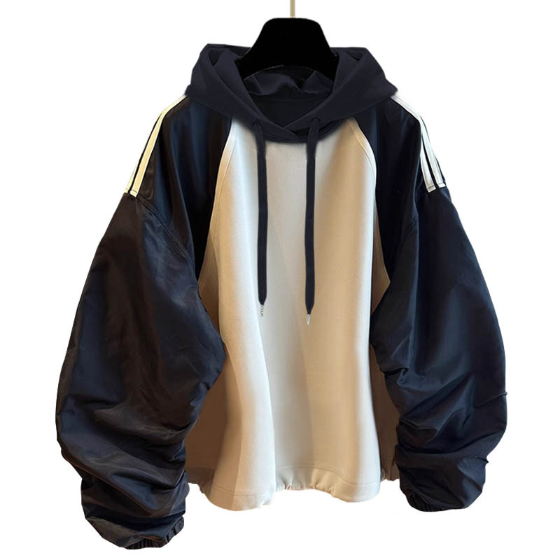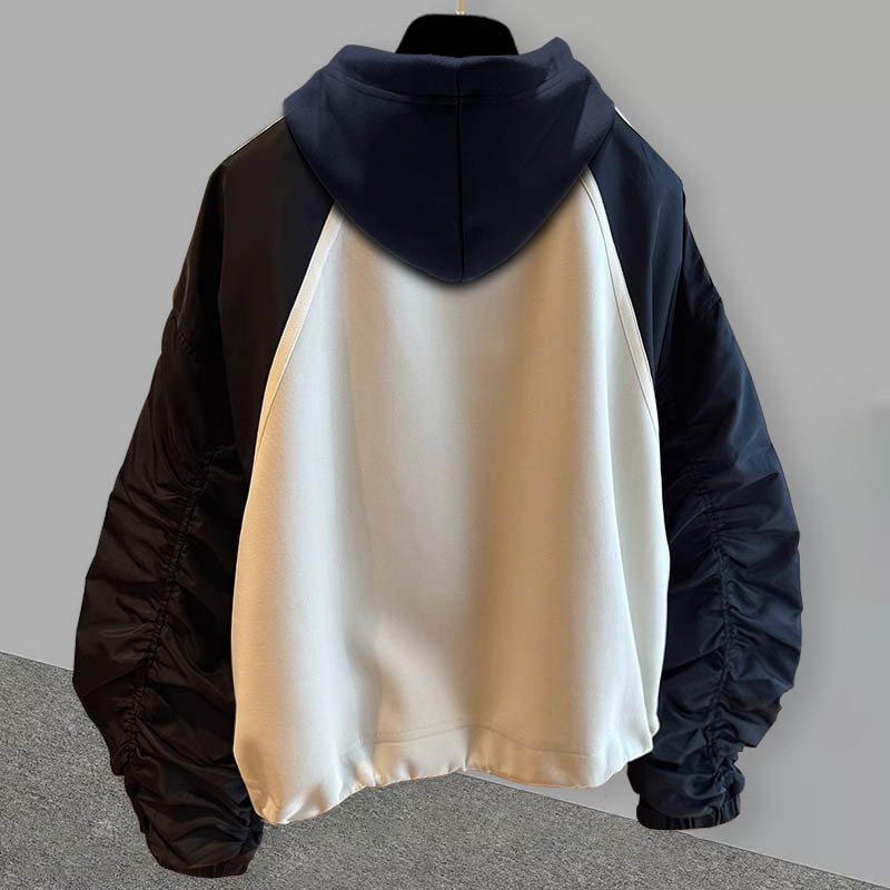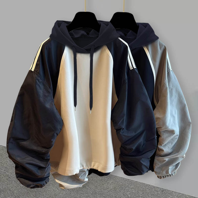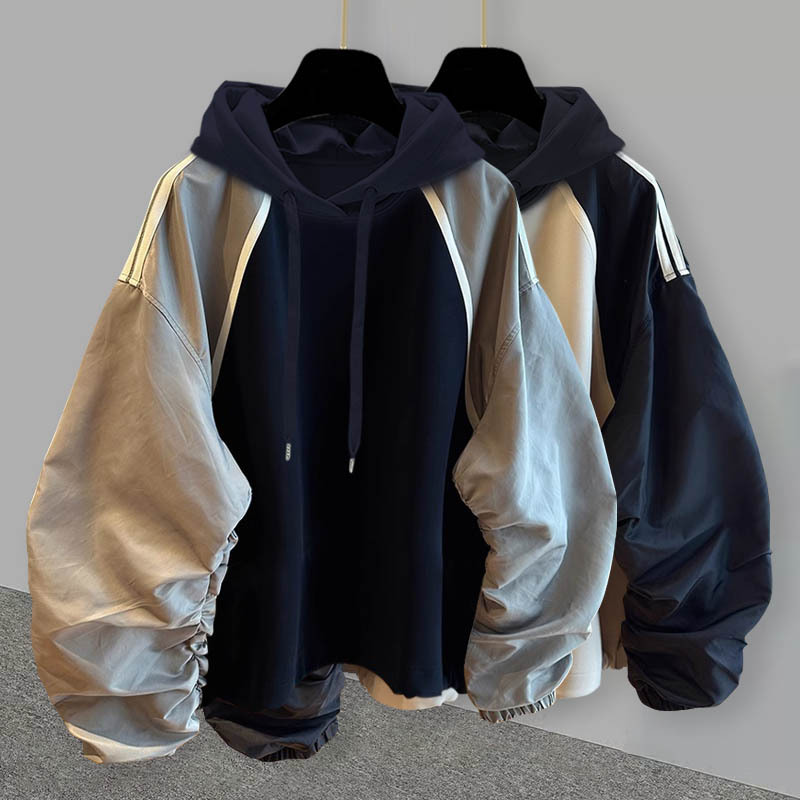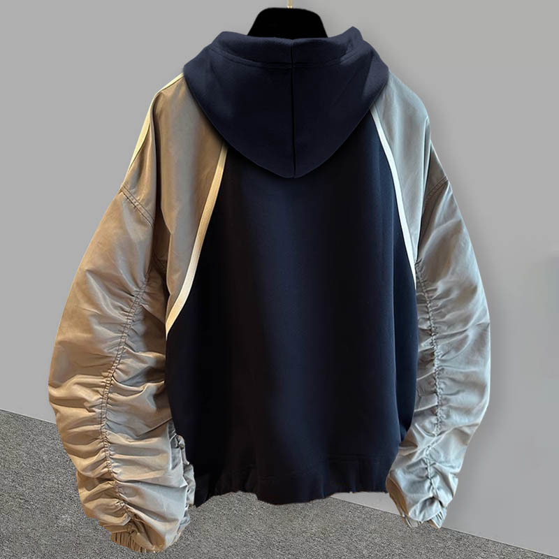 주름 소매 대비 색상 스티칭 후드 스웨트 남성용 가을 새로운 유행 디자인 센스 캐주얼 루즈 올 매치 재킷