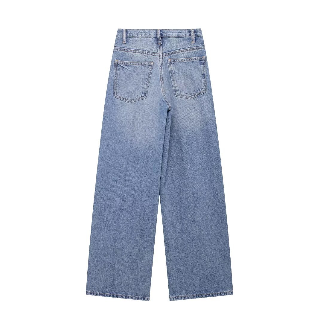 유럽과 미국의 국경 간 여성 의류 도매 여성 더블 브레스트 바지 허리 하이 허리 와이드 레그 청바지
