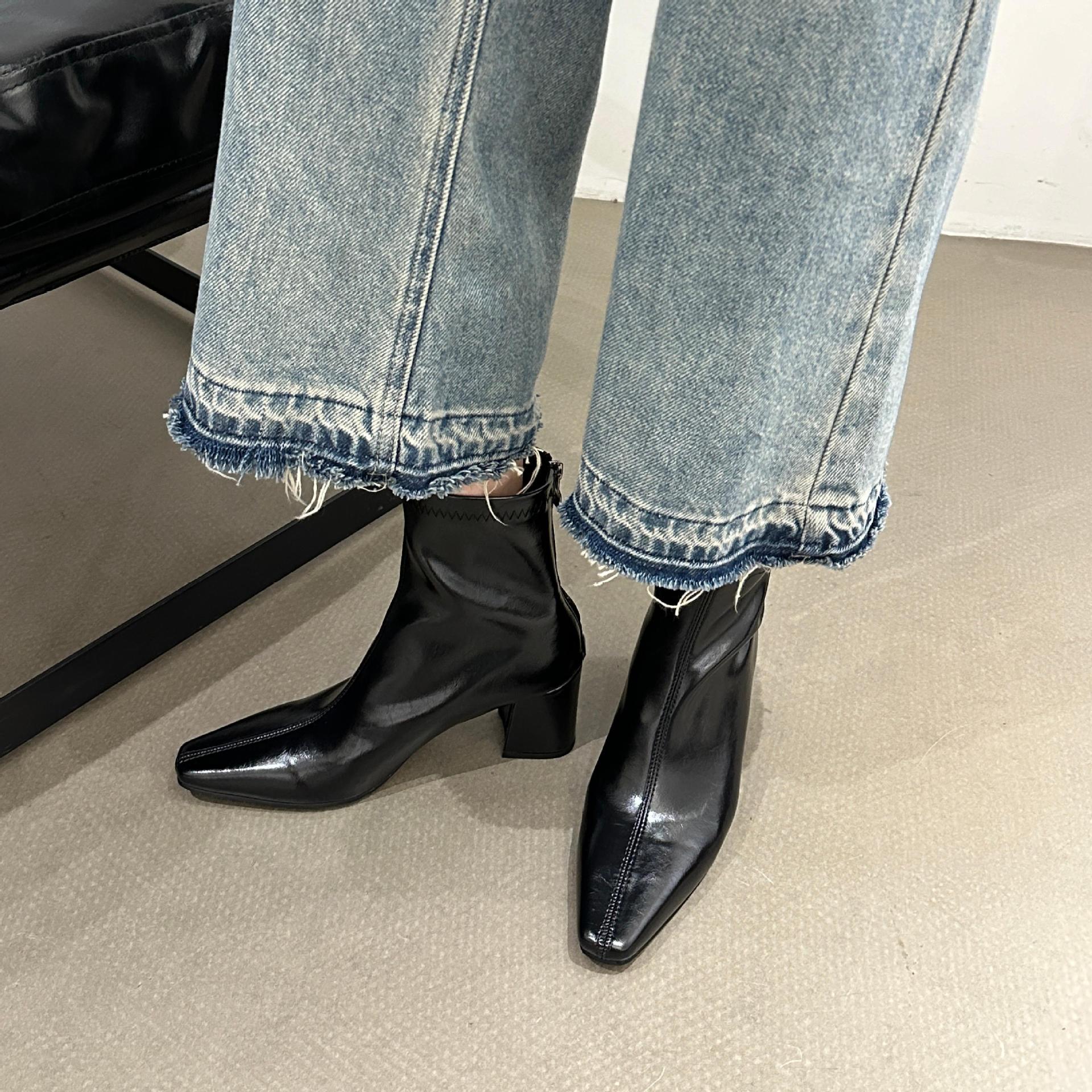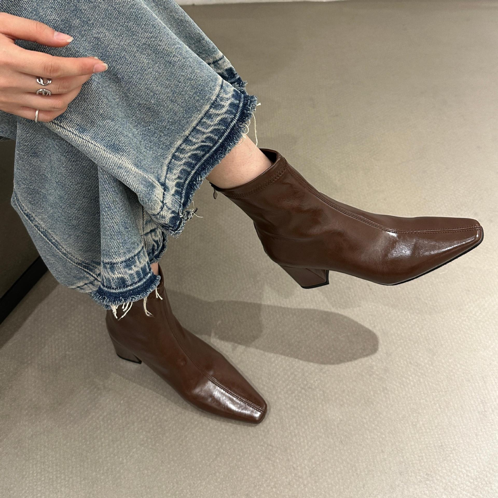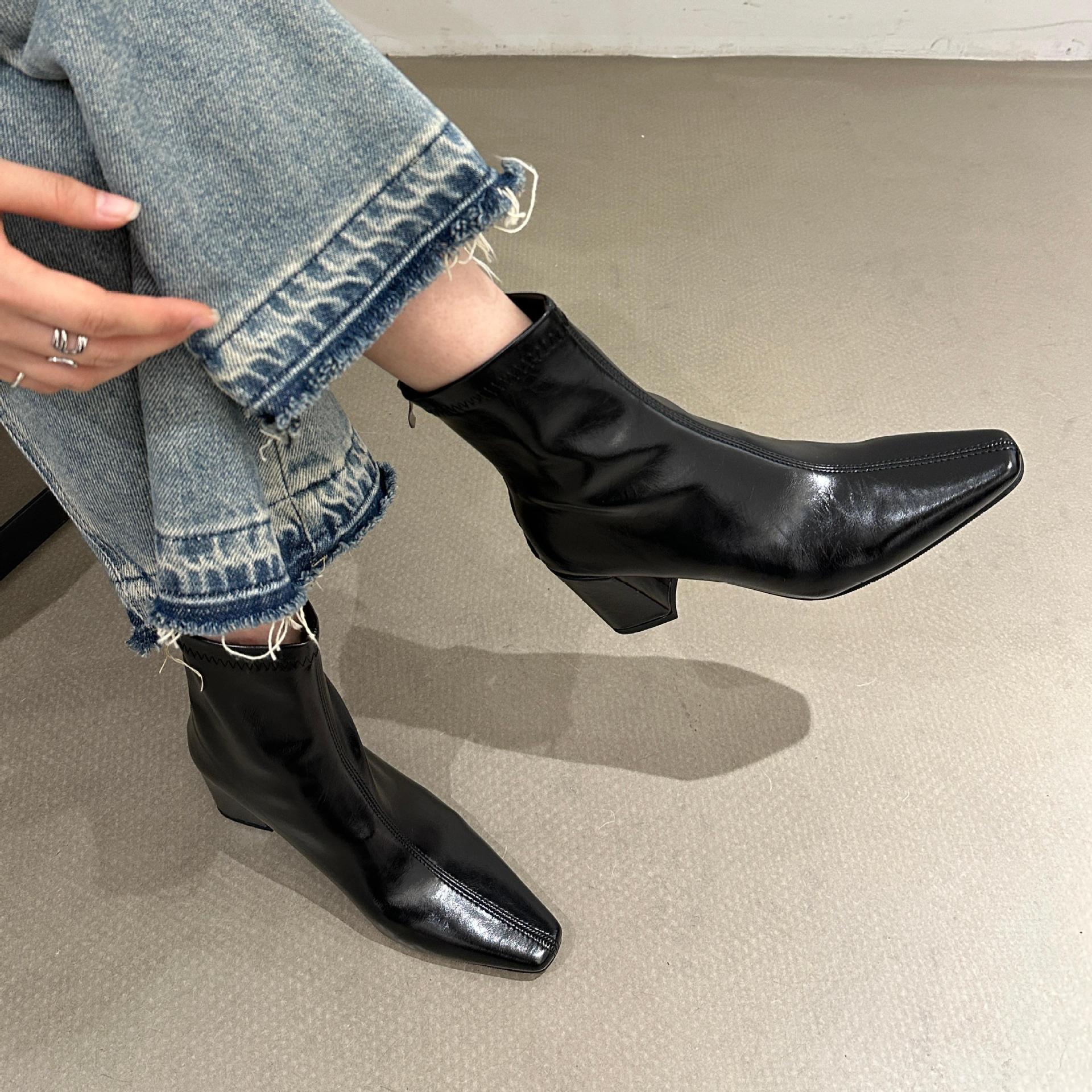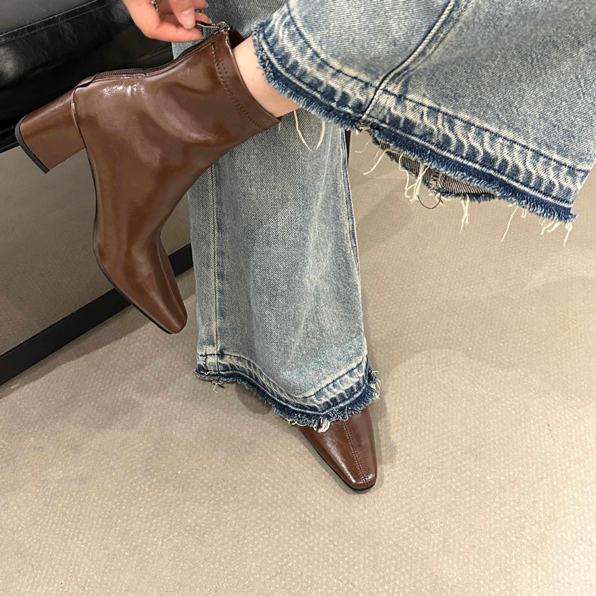 2025 가을 겨울 신상 유럽 및 미국 스타일 사각코 심플 슬림 부츠 두꺼운 굽 하이힐 뒷지퍼 마틴 부츠 숏부츠 여성용