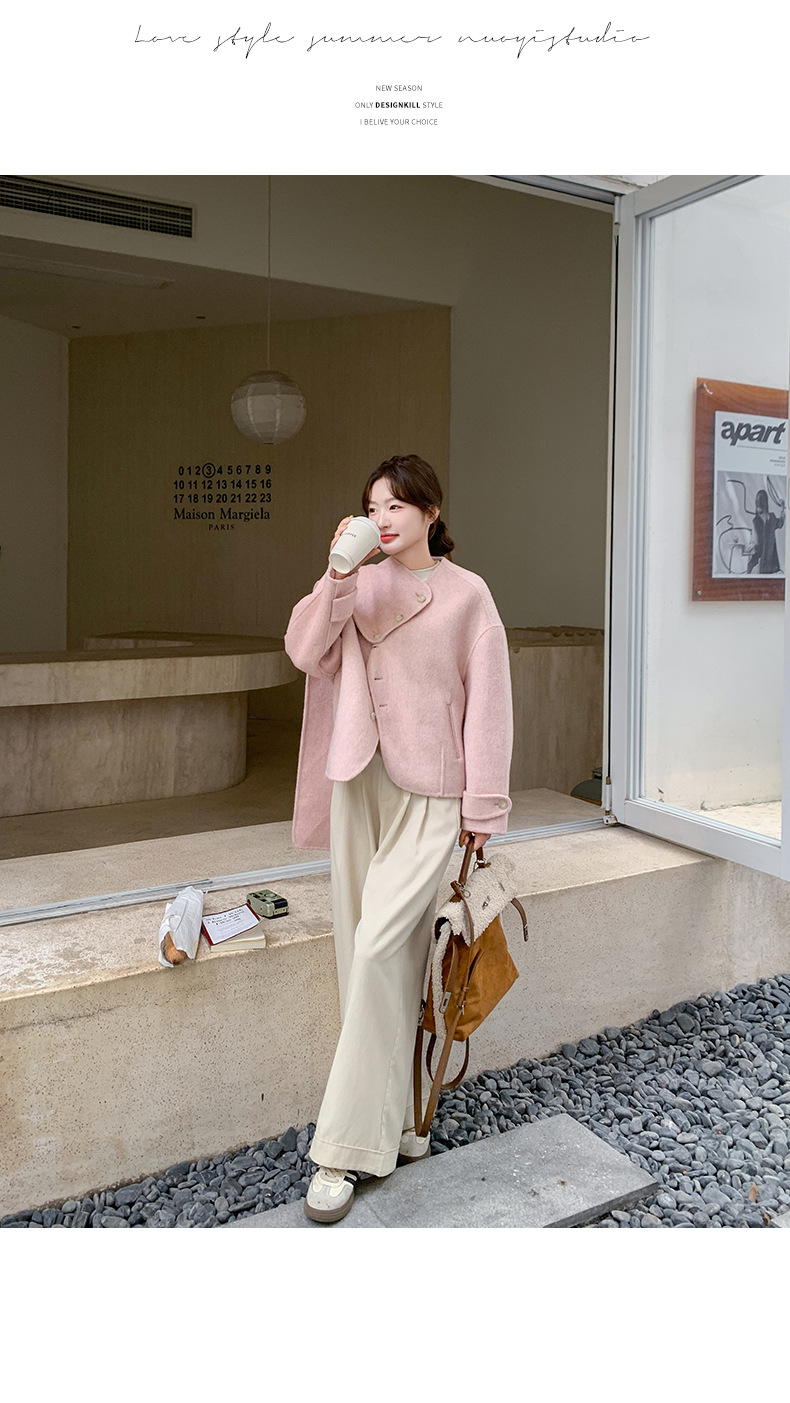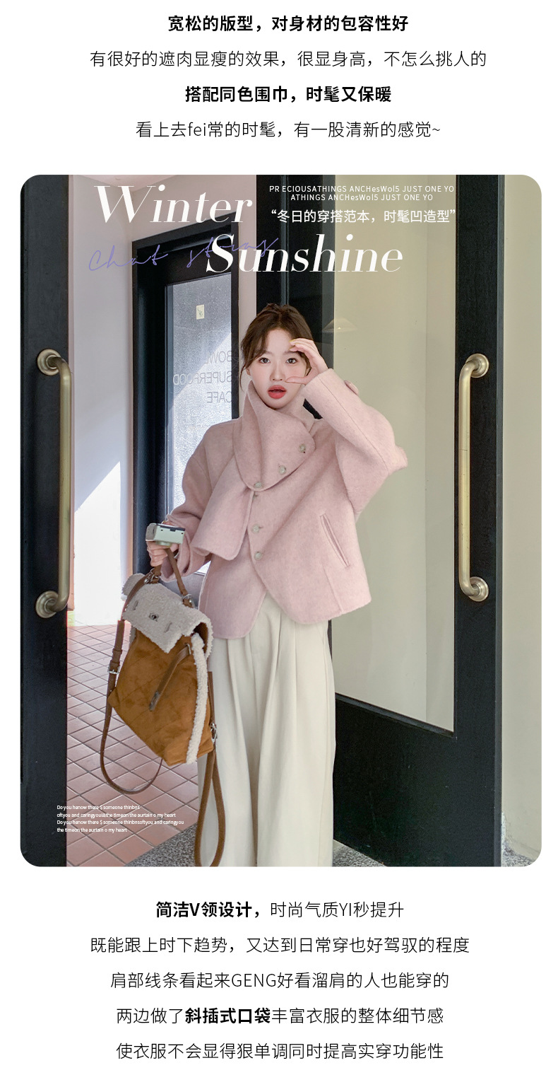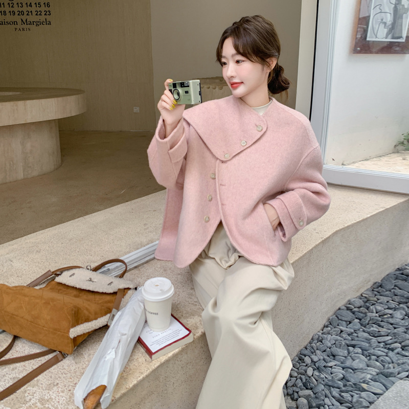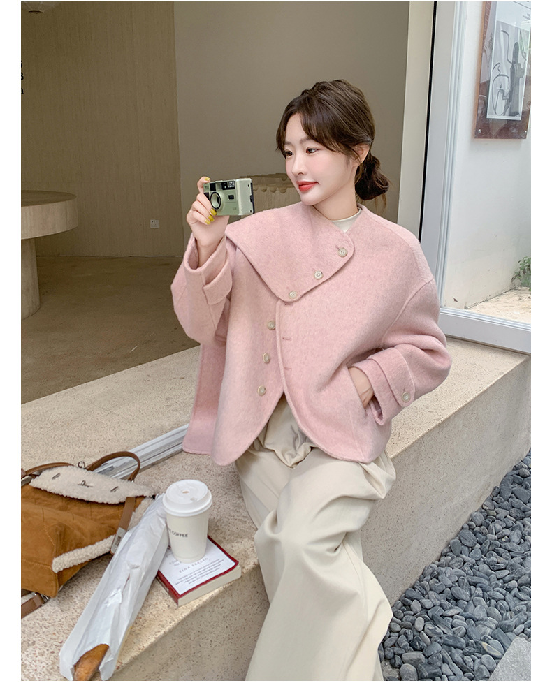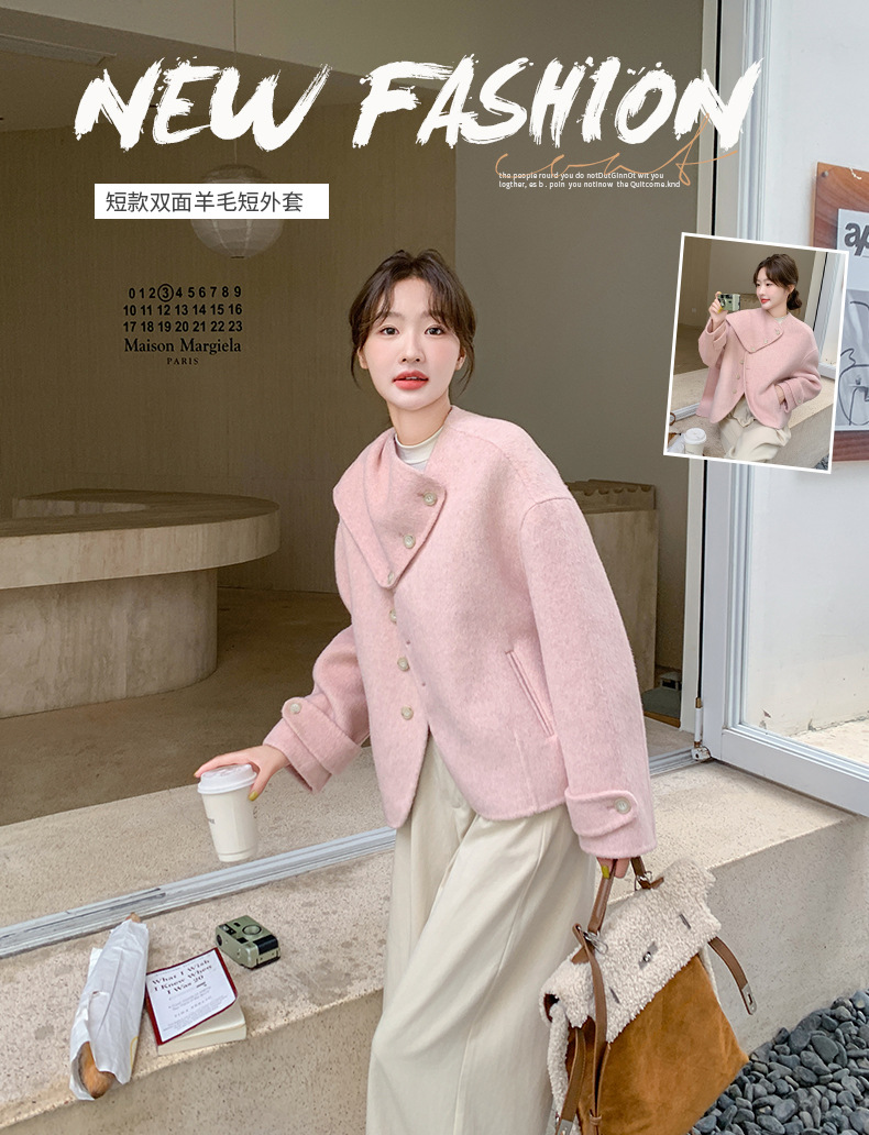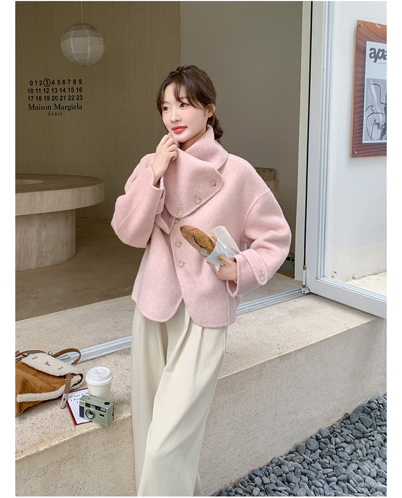 핑크 리치 패밀리 골드 스타일 짧은 양면 캐시미어 코트 여성의 2024 가을 및 겨울 새 스카프 칼라 울 코트