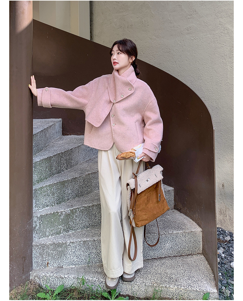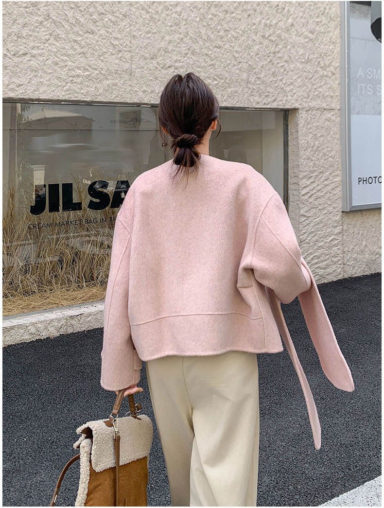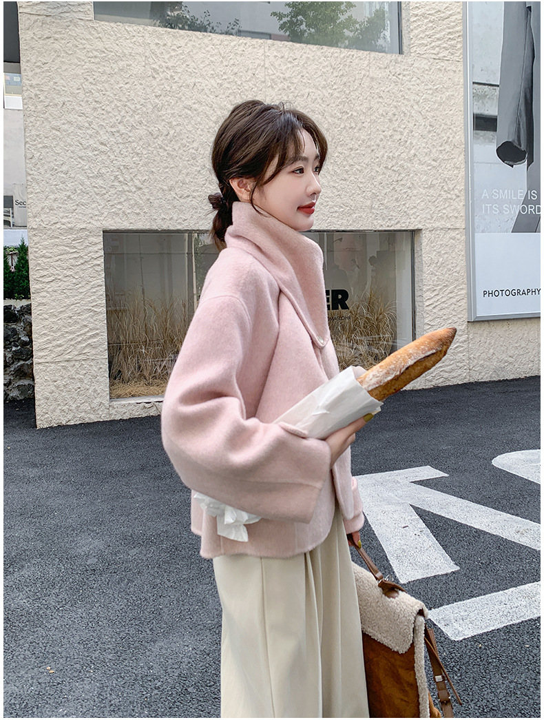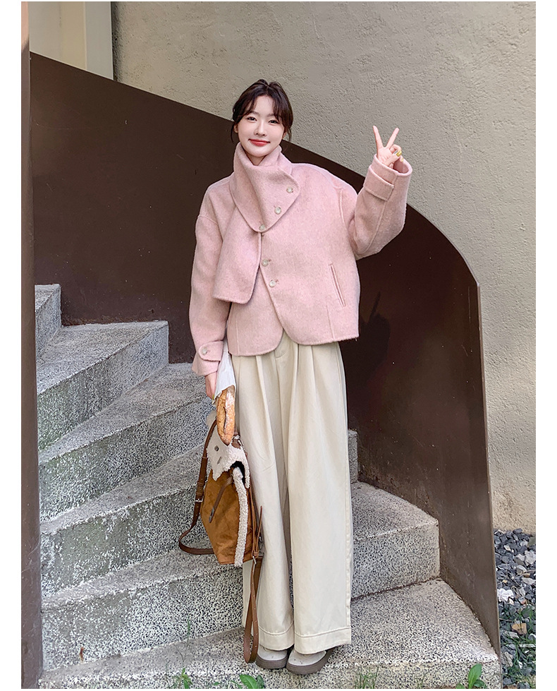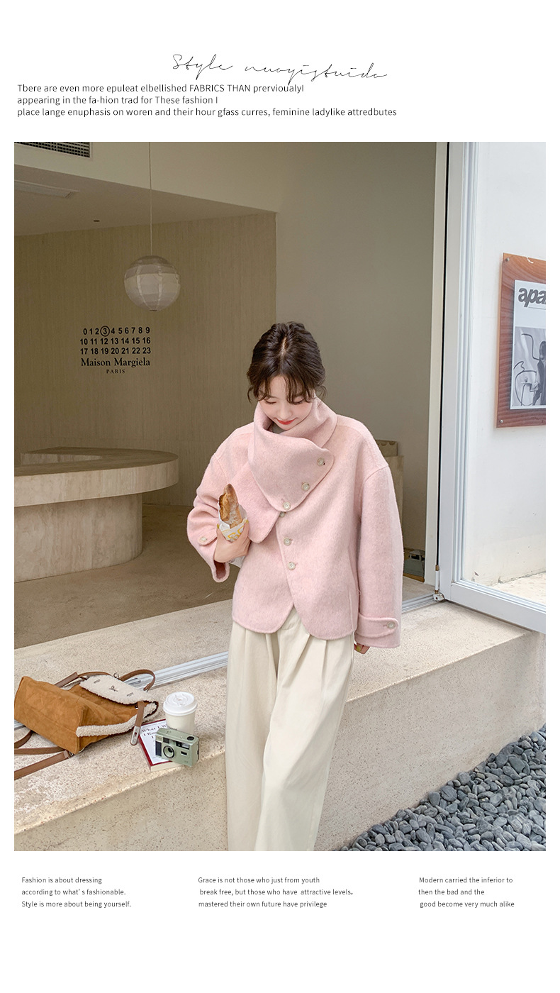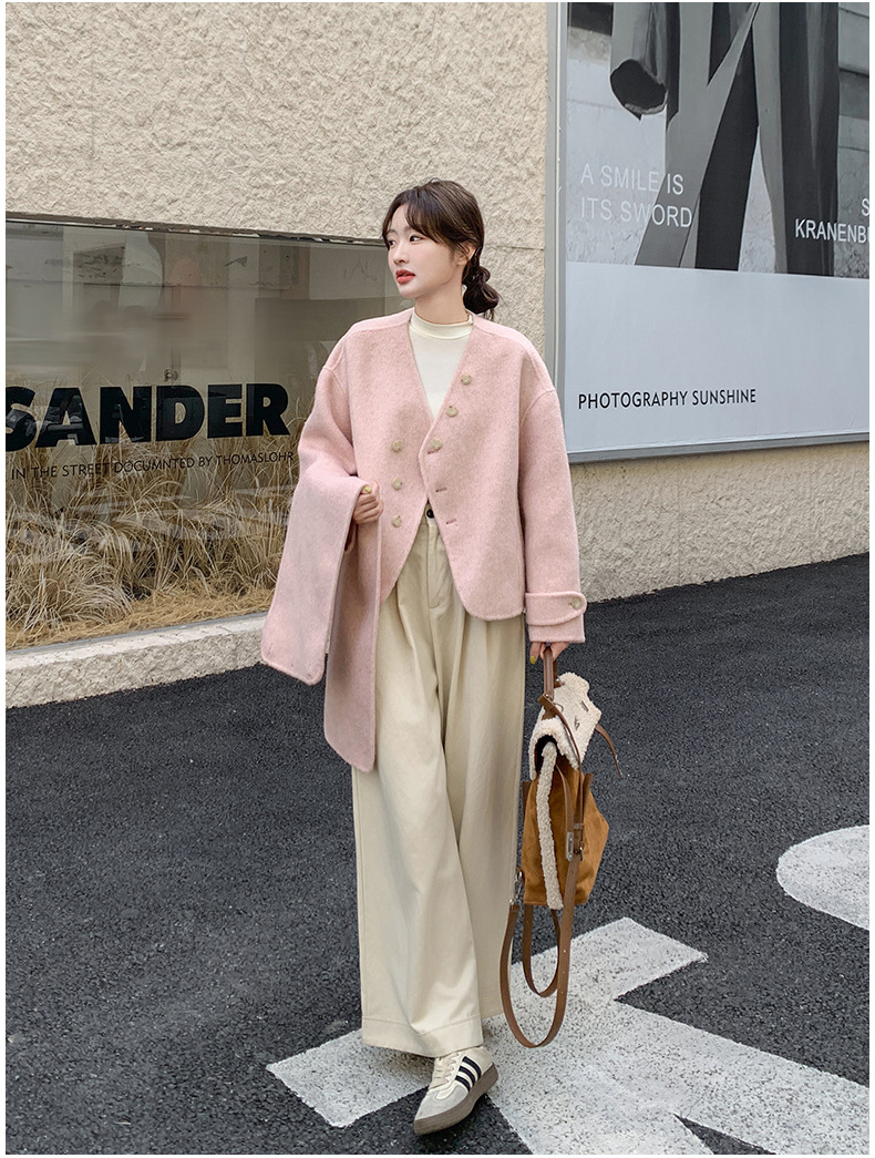 핑크 리치 패밀리 골드 스타일 짧은 양면 캐시미어 코트 여성의 2024 가을 및 겨울 새 스카프 칼라 울 코트