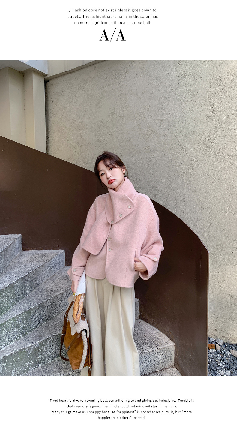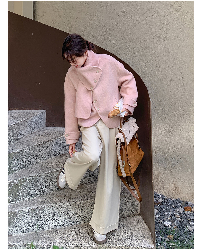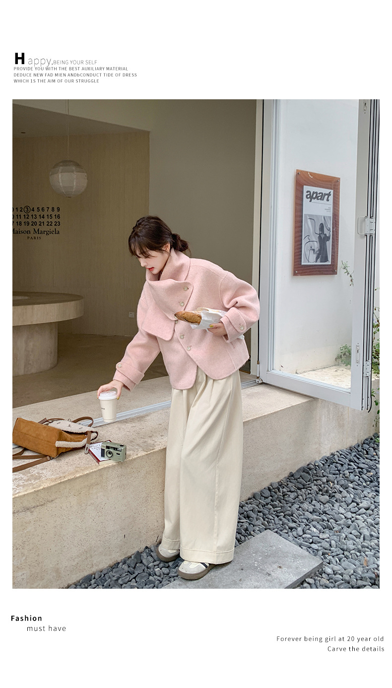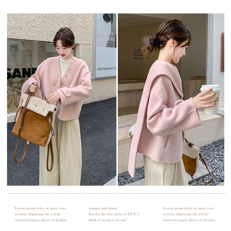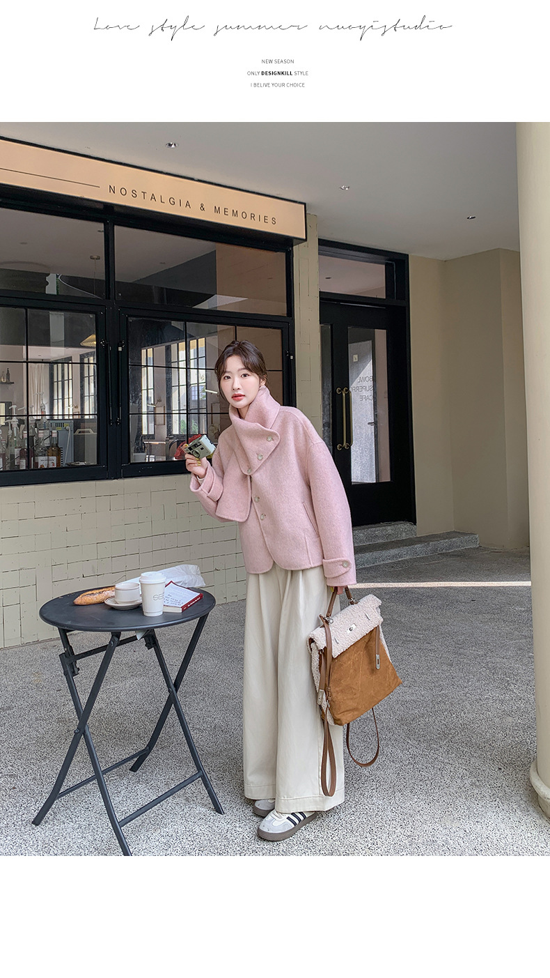 핑크 리치 패밀리 골드 스타일 짧은 양면 캐시미어 코트 여성의 2024 가을 및 겨울 새 스카프 칼라 울 코트
