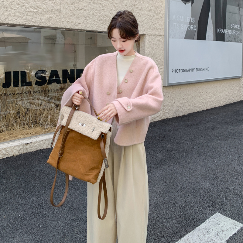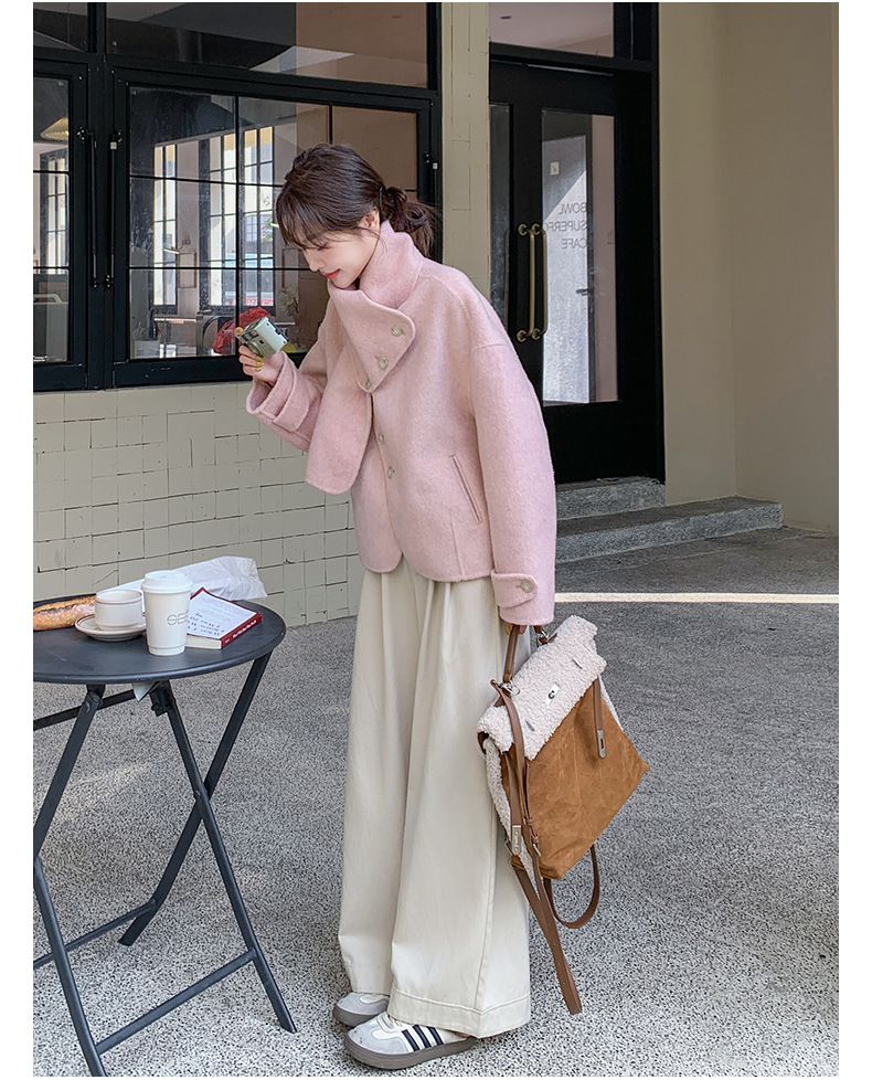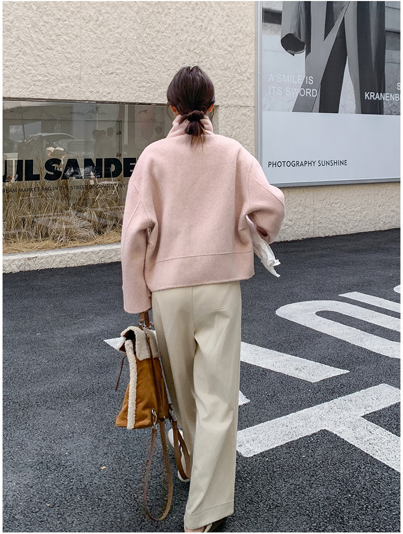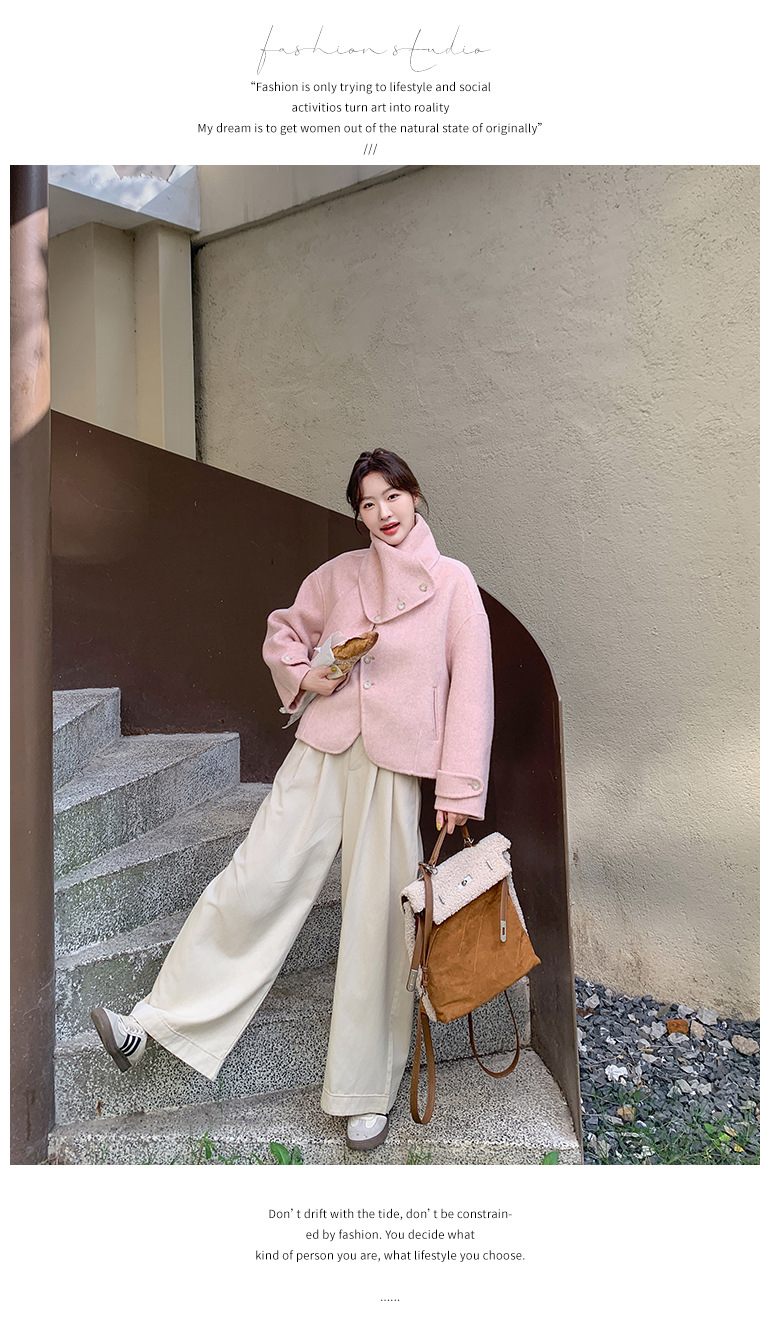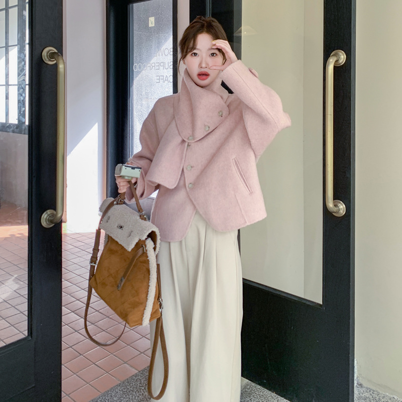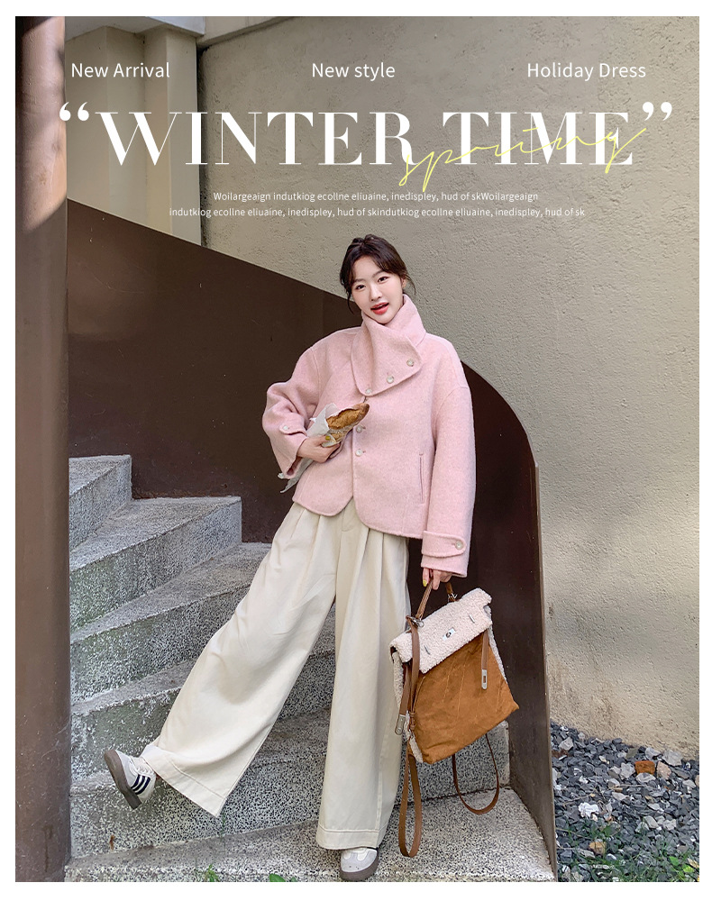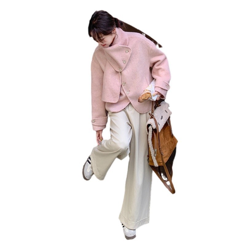 핑크 리치 패밀리 골드 스타일 짧은 양면 캐시미어 코트 여성의 2024 가을 및 겨울 새 스카프 칼라 울 코트