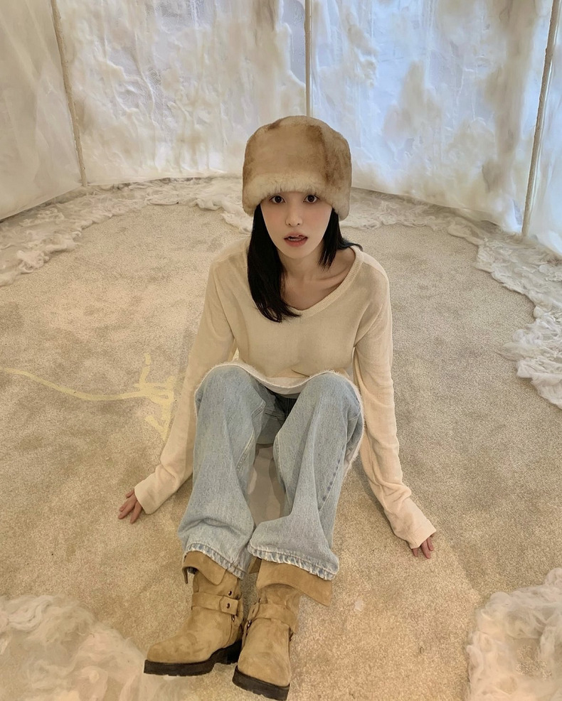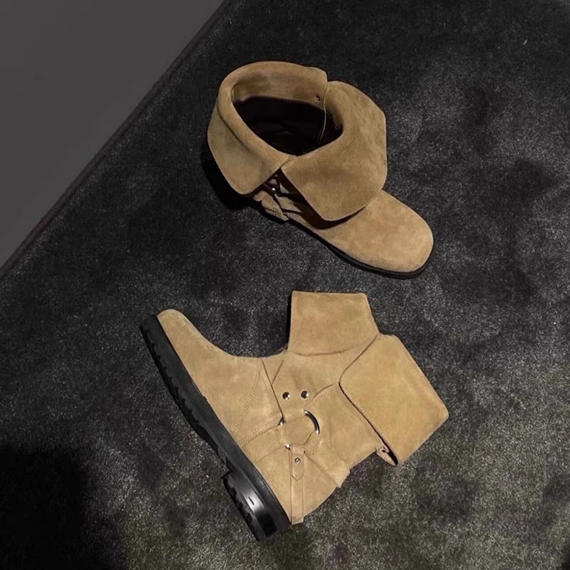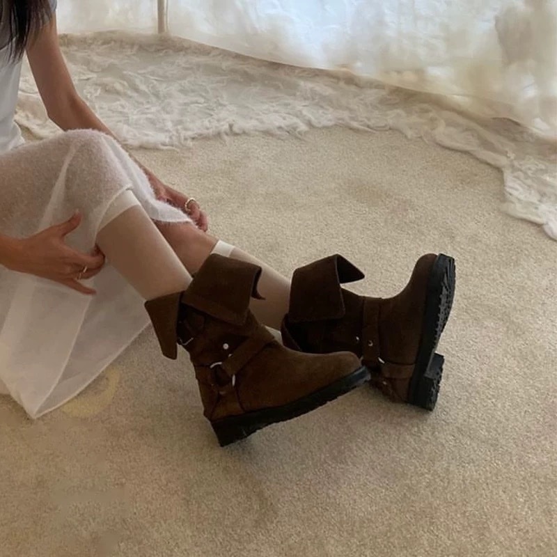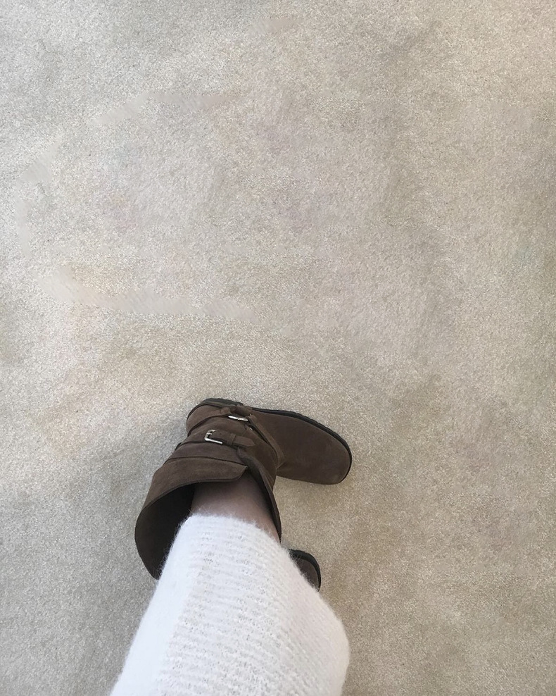 한국 스타일 틈새 옷깃 투웨어 벨트 버클 마틴 부츠 여자 가을 겨울 기모 두꺼운 힐 라운드 발가락 웨스턴 데님 쇼트 부츠