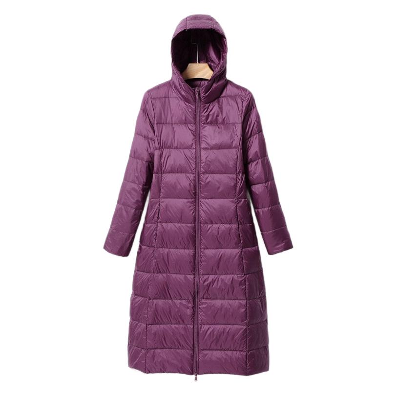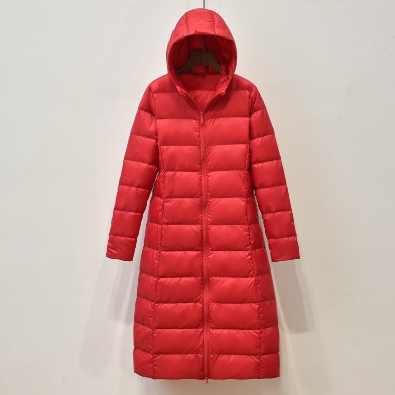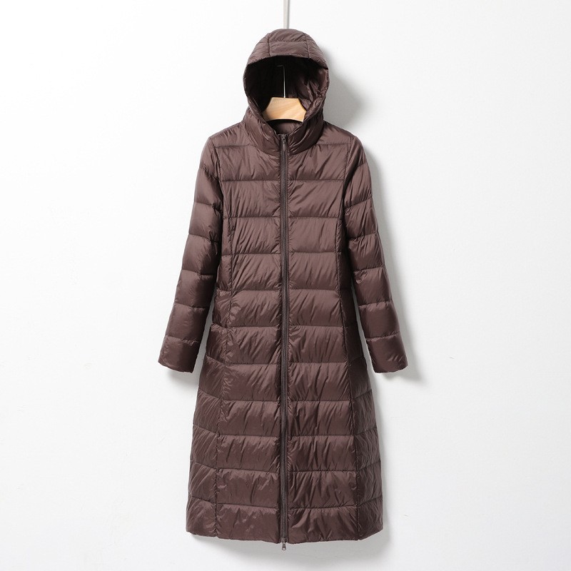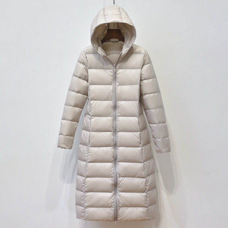 2025년 가을 겨울 신상 여성용 경량 롱 다운 재킷, 무릎 아래까지 오는 슬림핏 패셔너블 후드 코트
