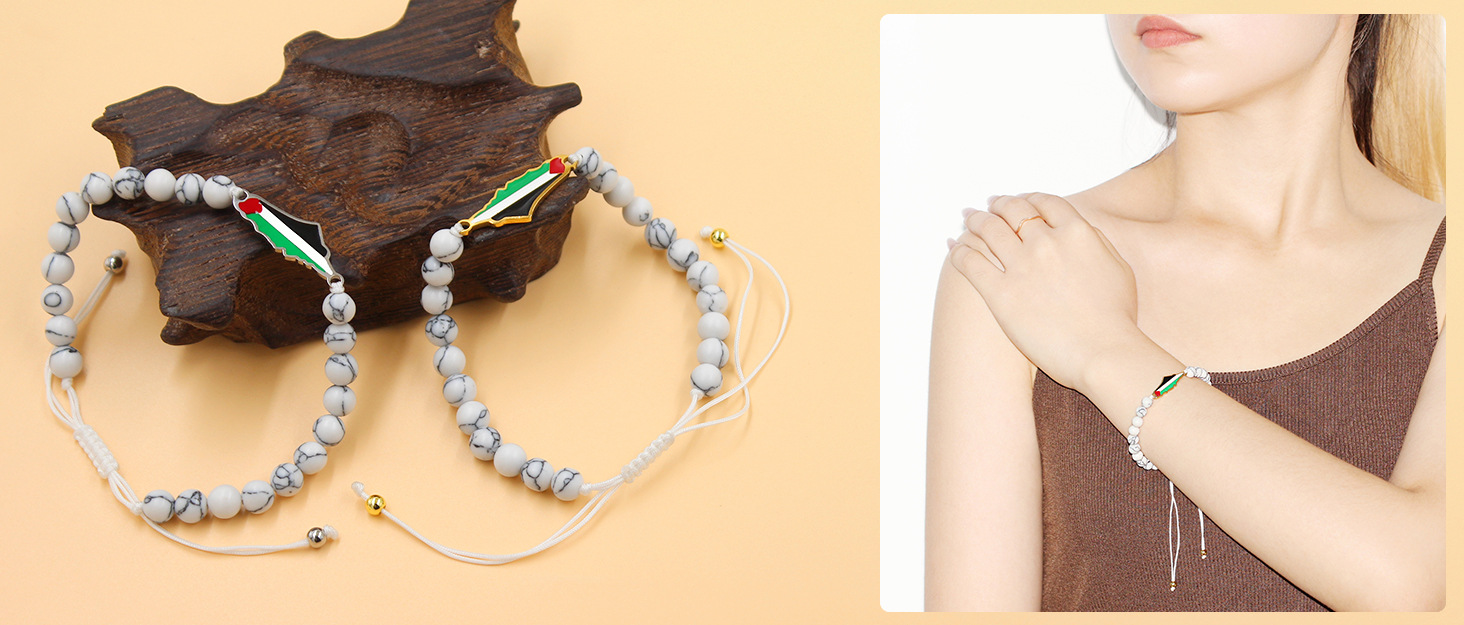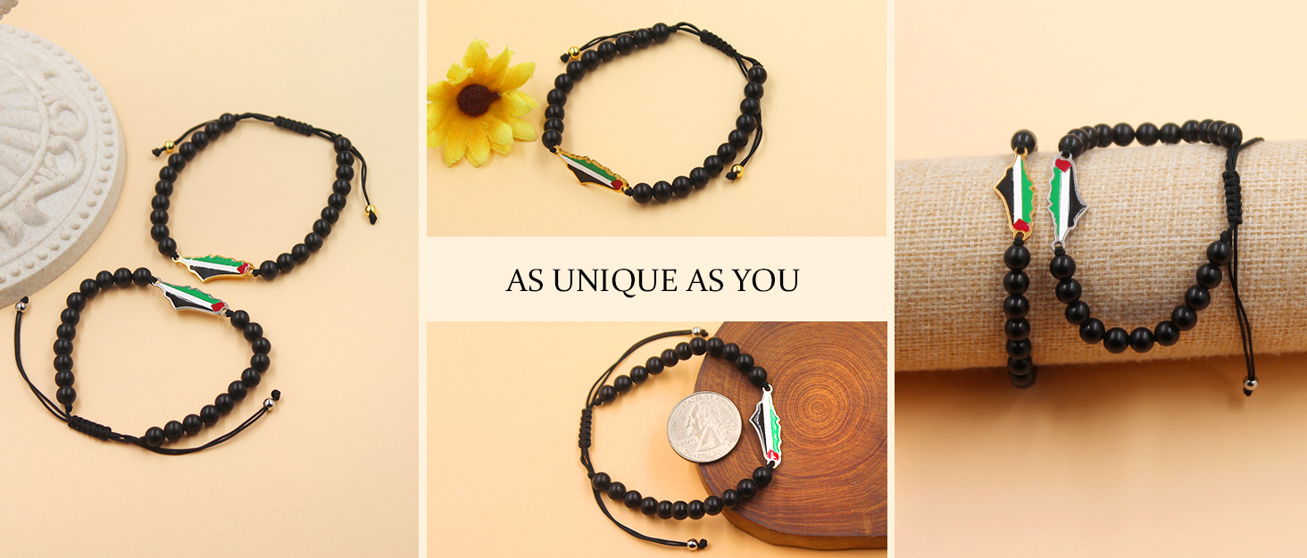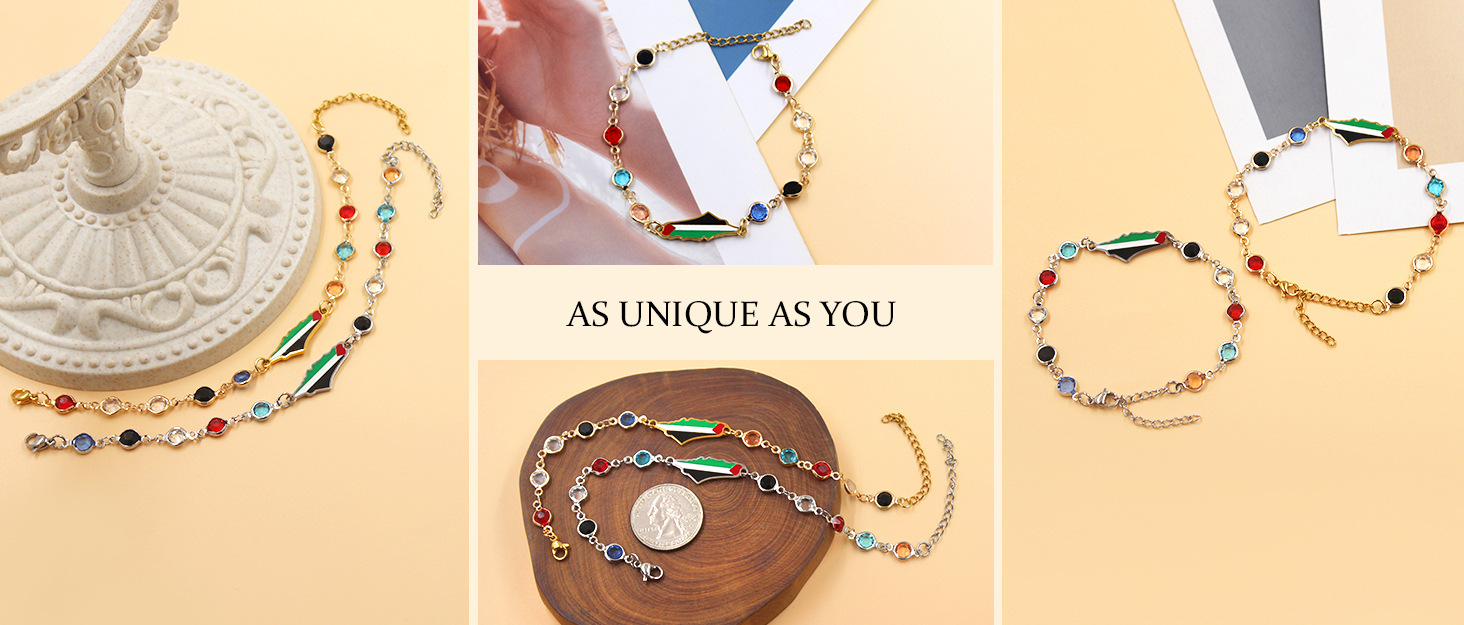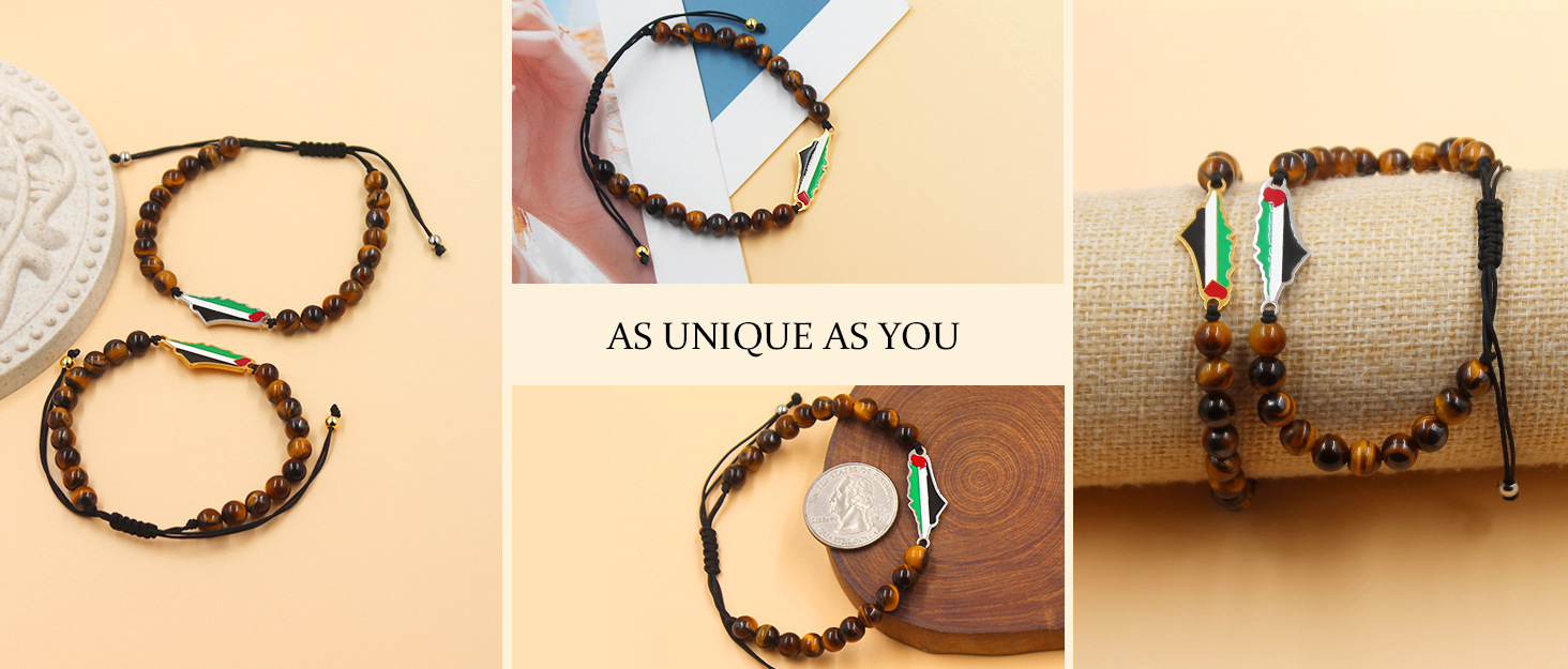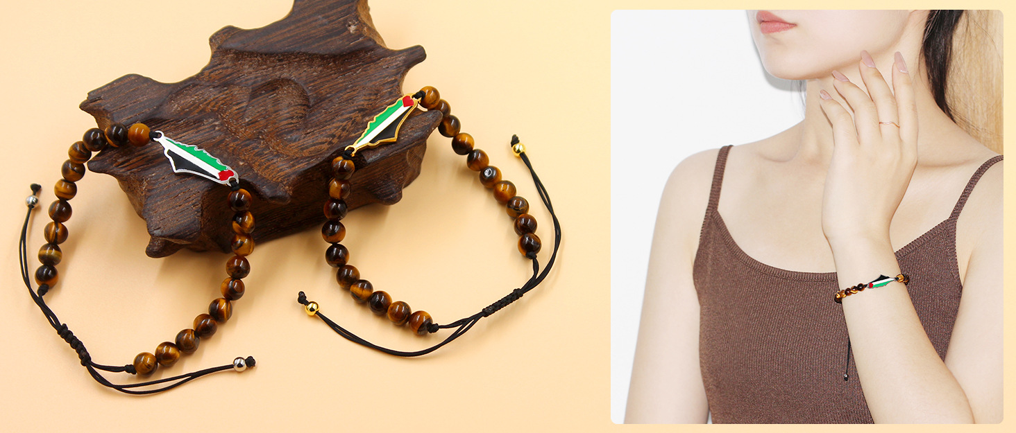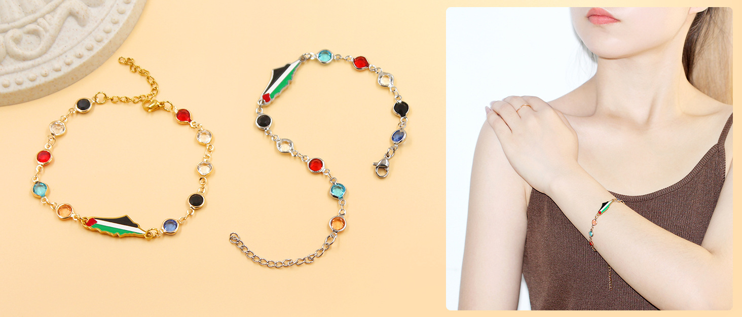 产品材质:不锈钢滴油国旗,不锈钢心链,铜镶嵌锆石链,4mm不锈钢珠/4mm铜珠,6mm白松石/黑玛瑙/虎眼石,不锈钢镶嵌水晶链