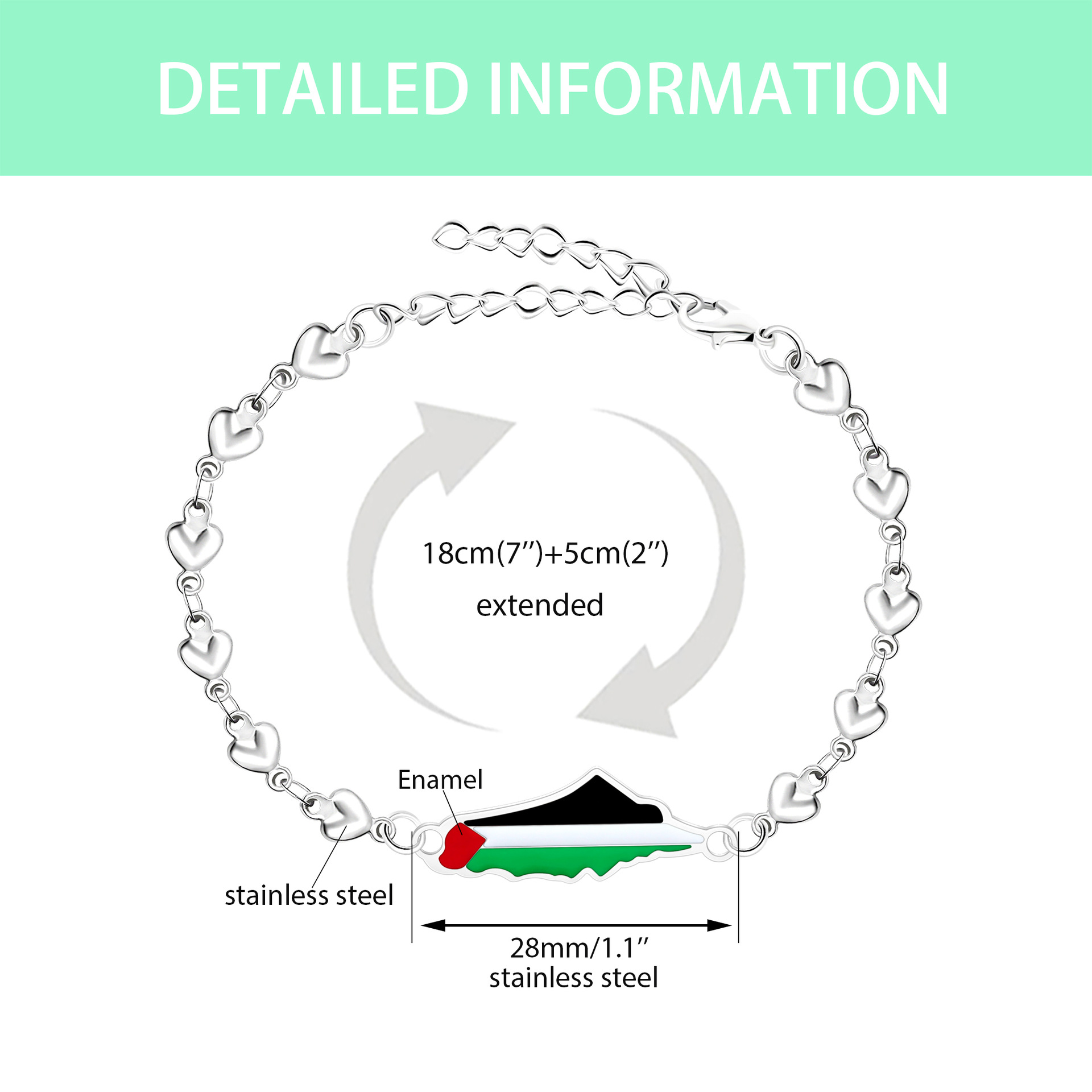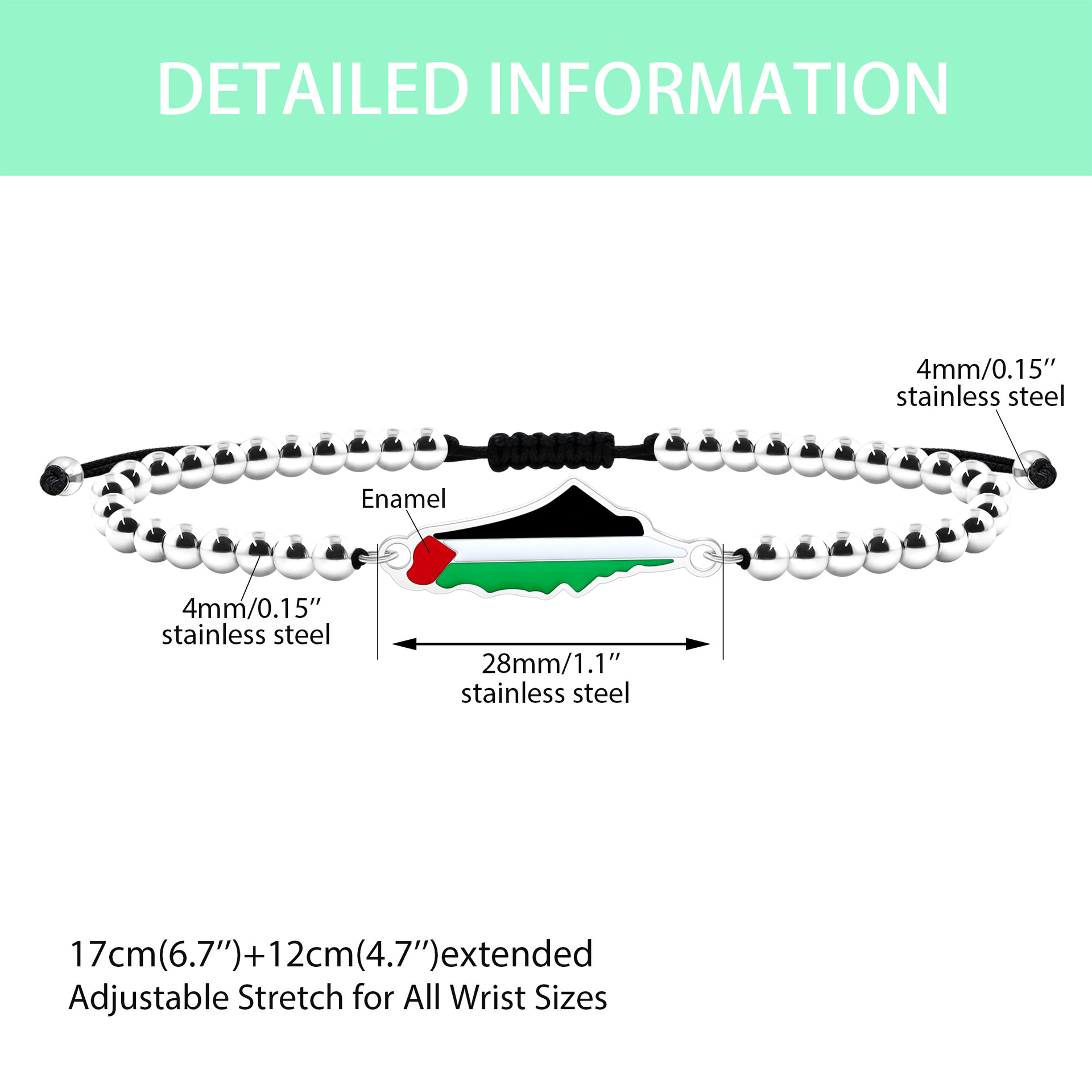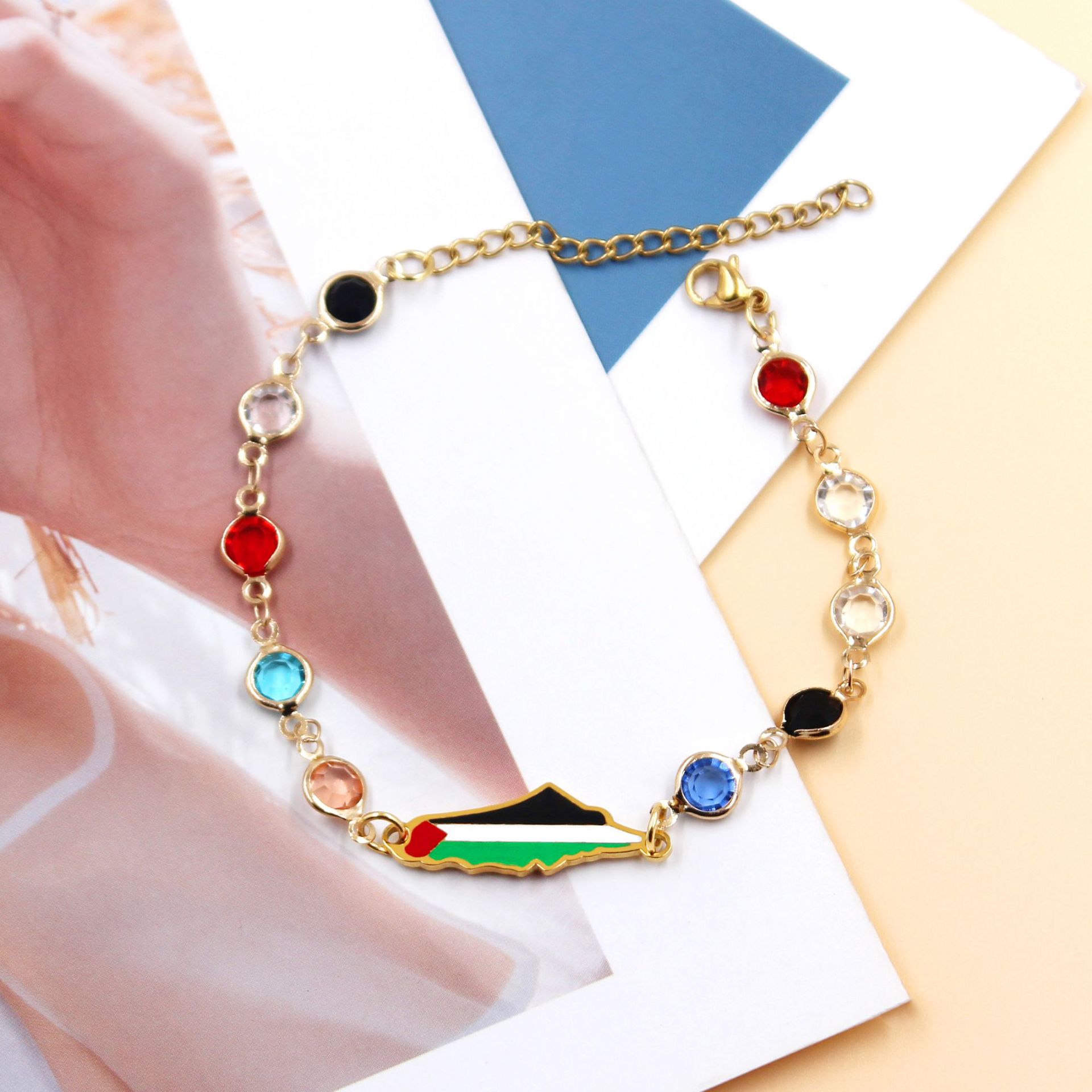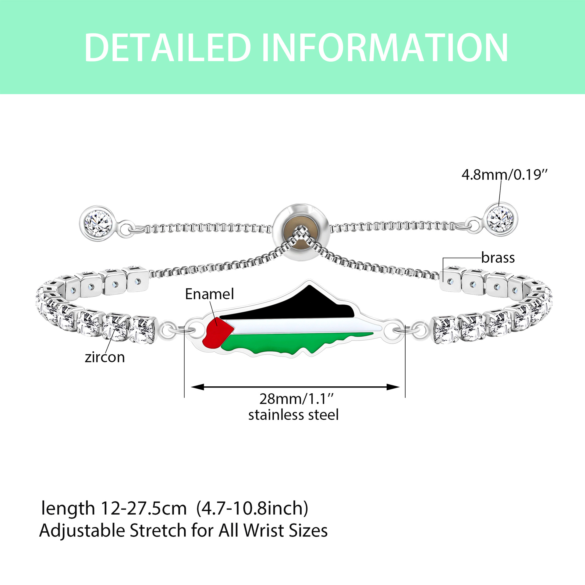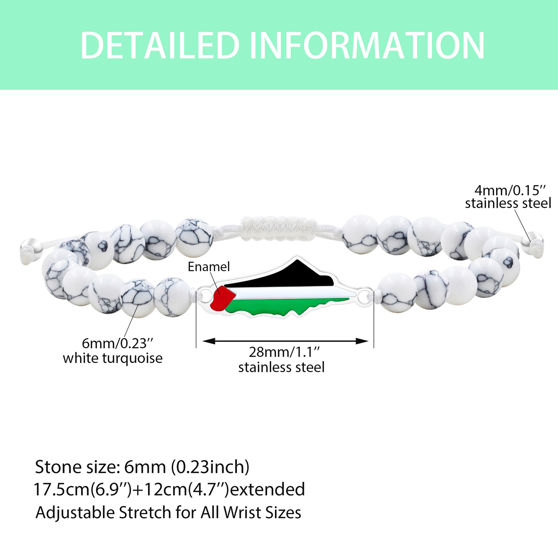 产品材质:不锈钢滴油国旗,不锈钢心链,铜镶嵌锆石链,4mm不锈钢珠/4mm铜珠,6mm白松石/黑玛瑙/虎眼石,不锈钢镶嵌水晶链