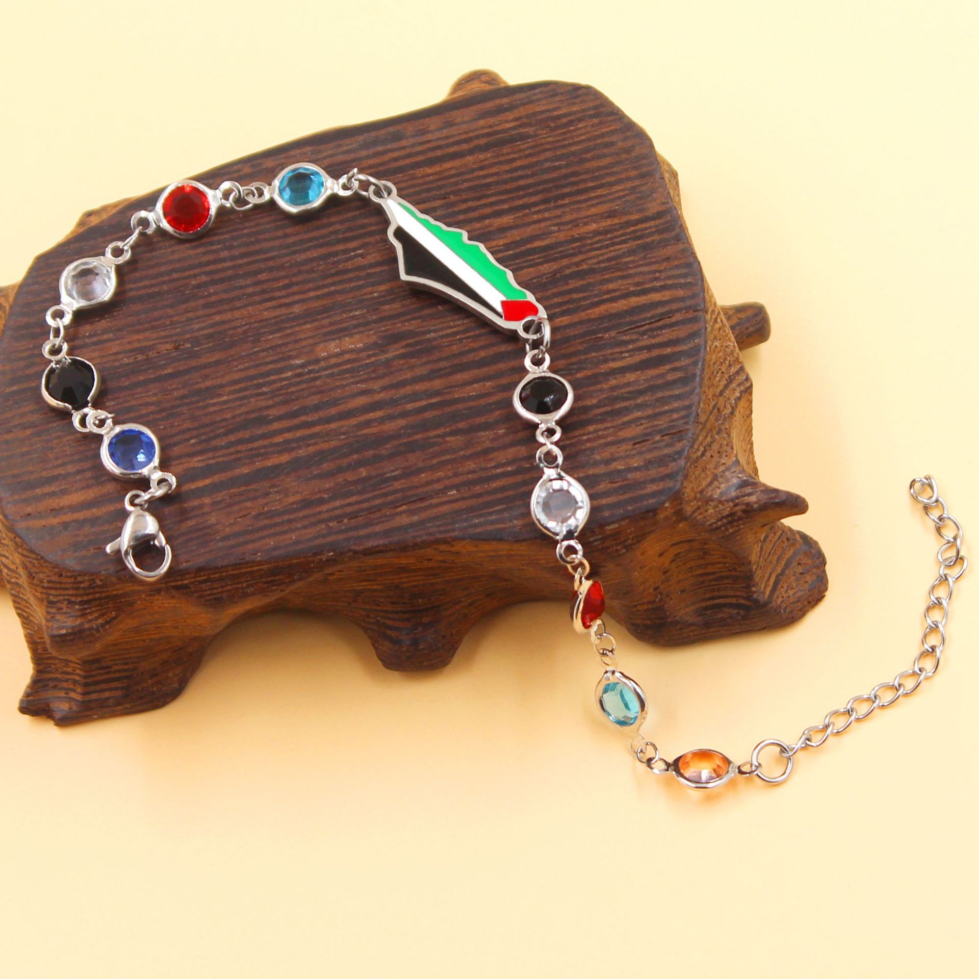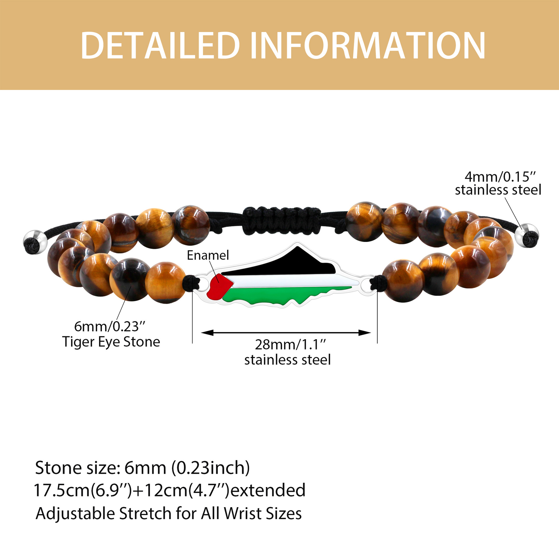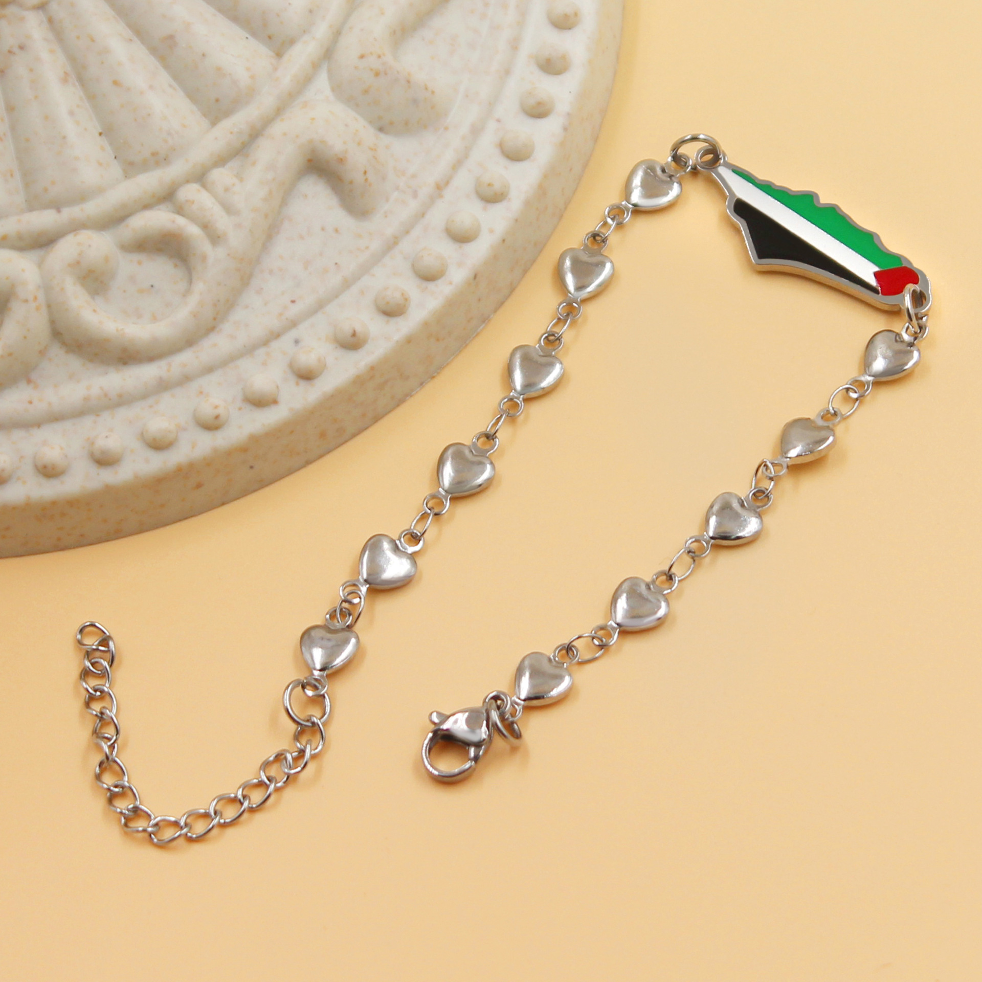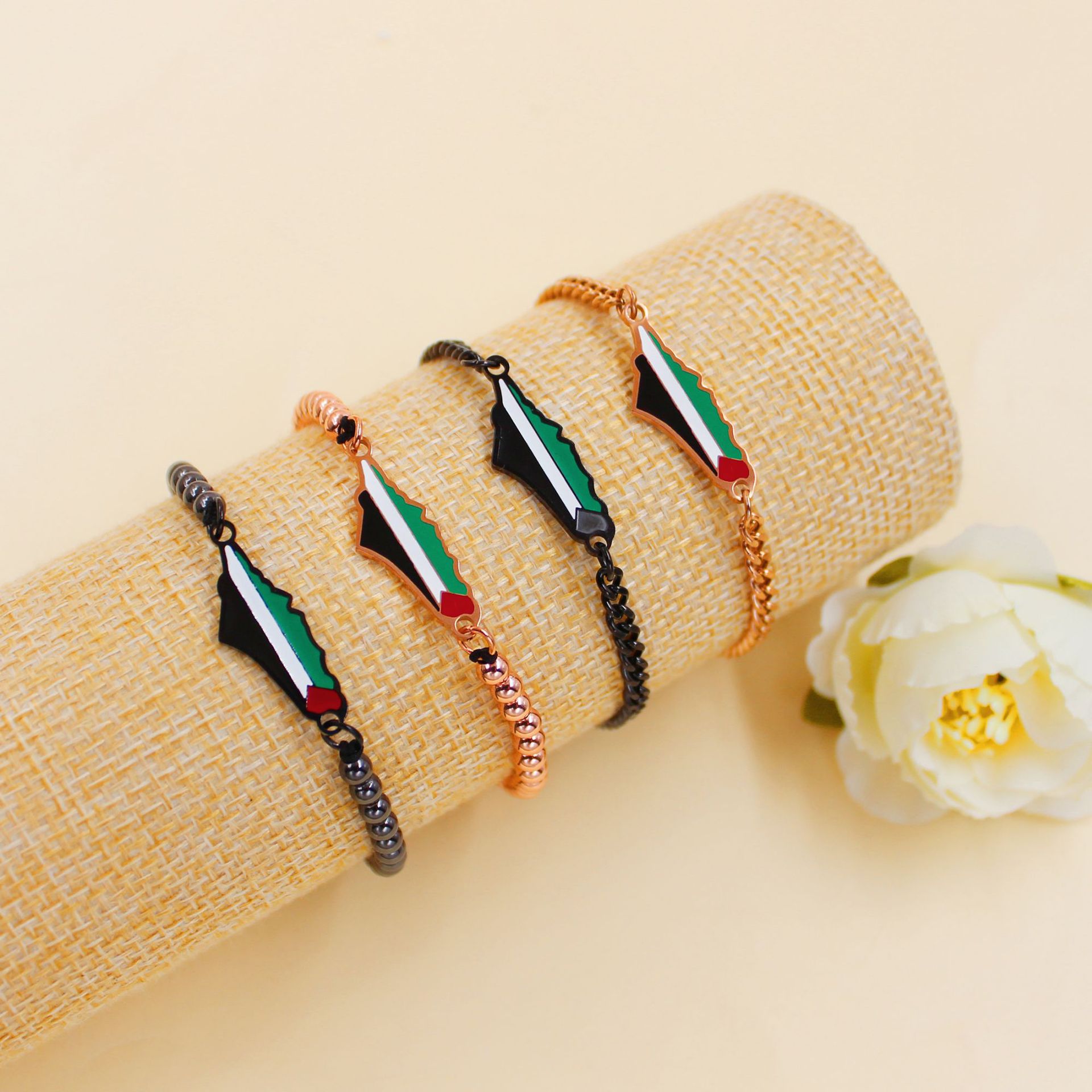 产品材质:不锈钢滴油国旗,不锈钢心链,铜镶嵌锆石链,4mm不锈钢珠/4mm铜珠,6mm白松石/黑玛瑙/虎眼石,不锈钢镶嵌水晶链