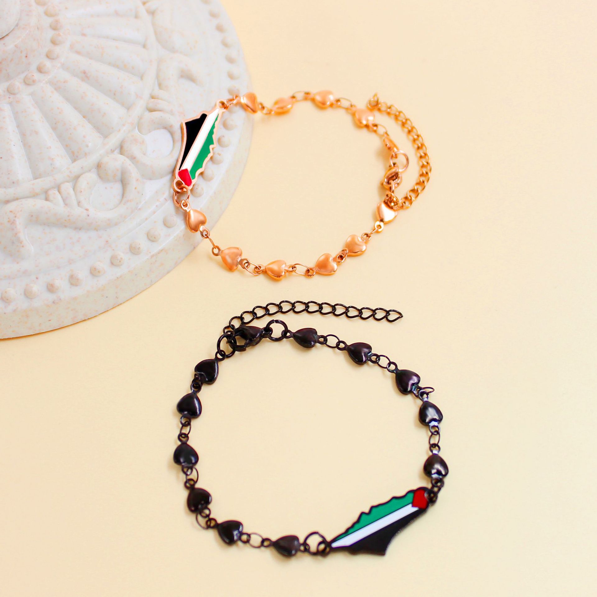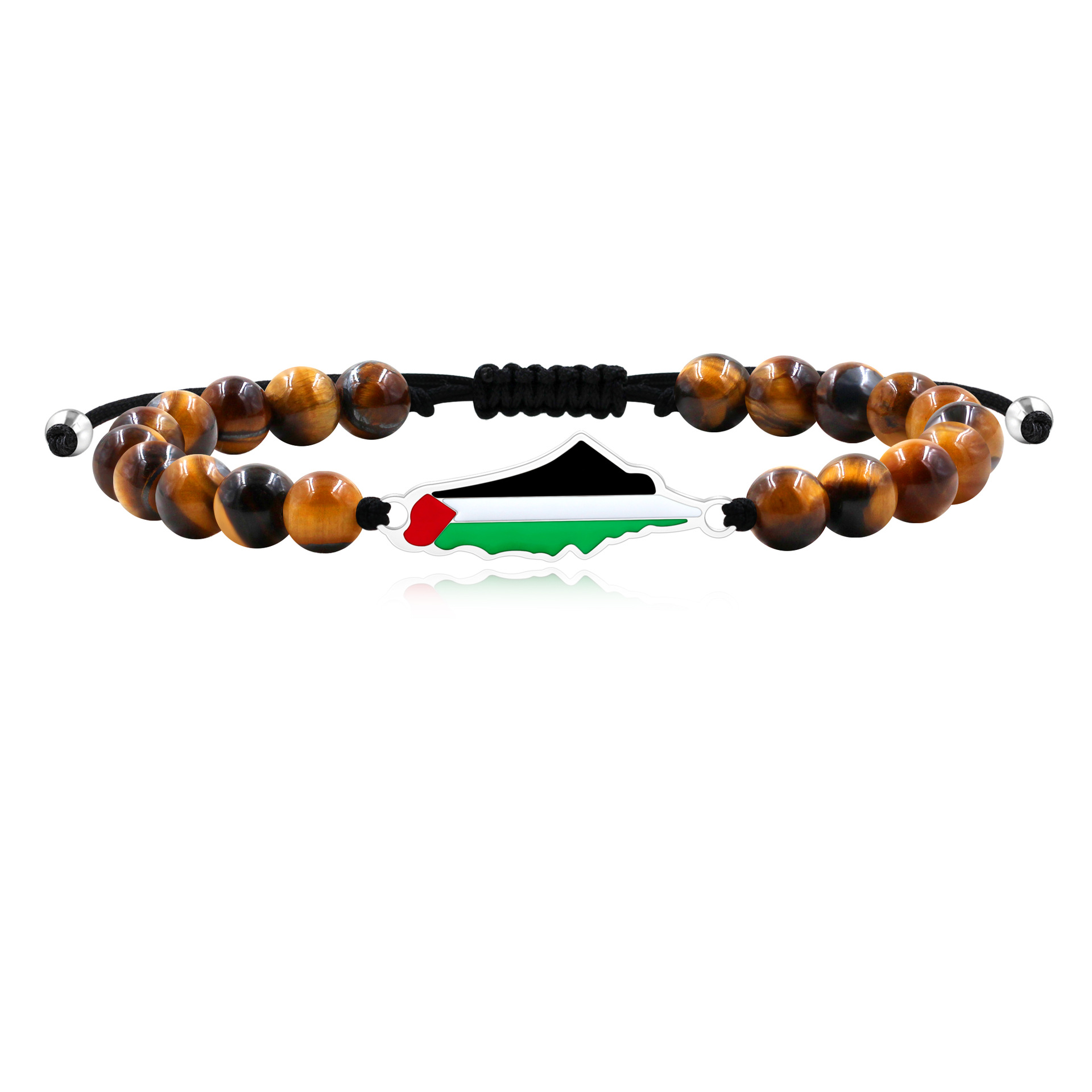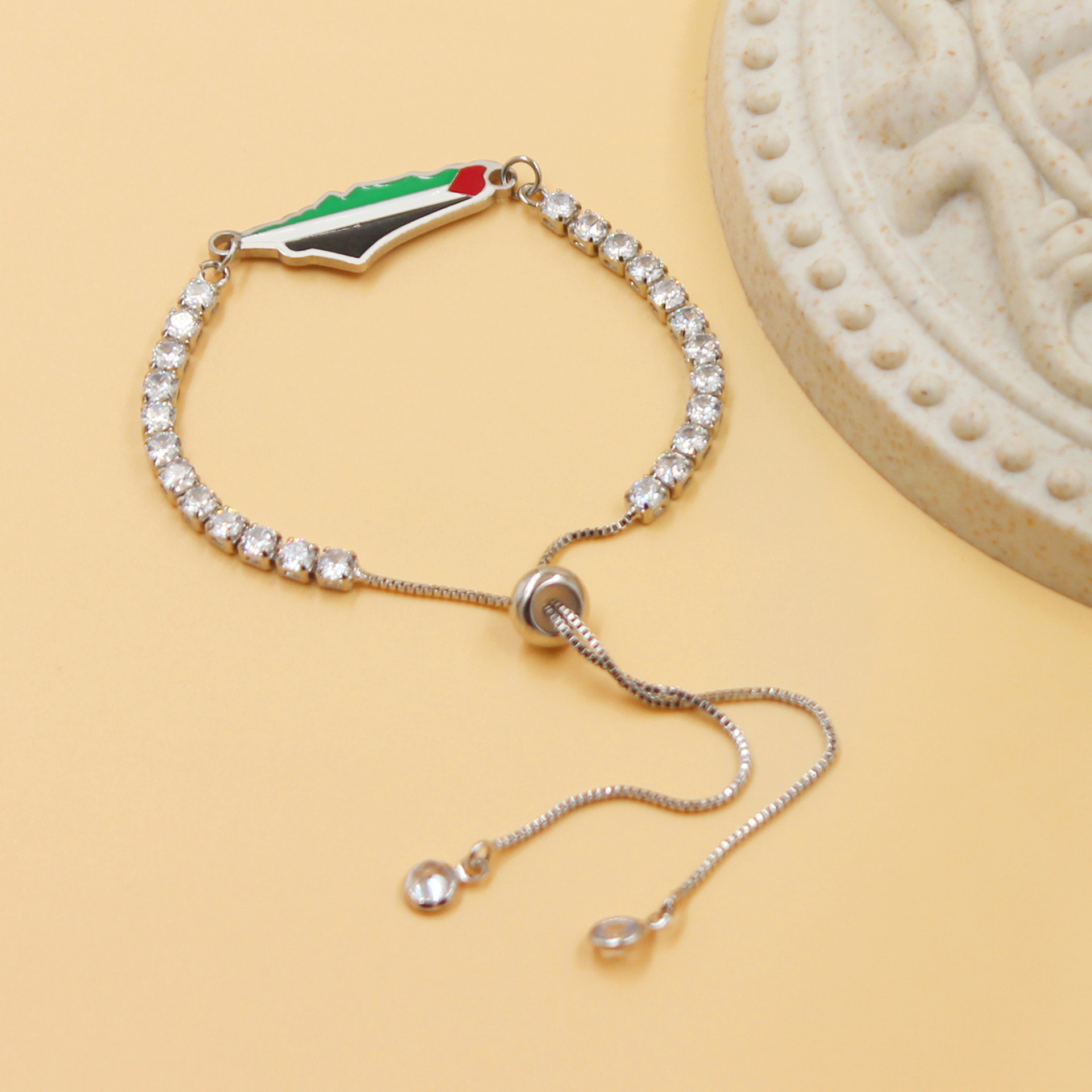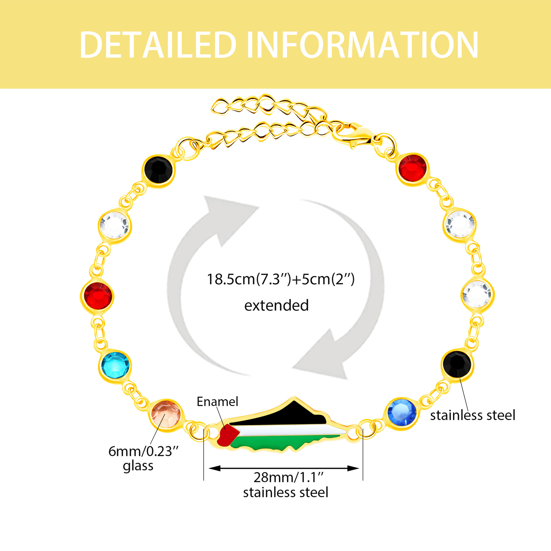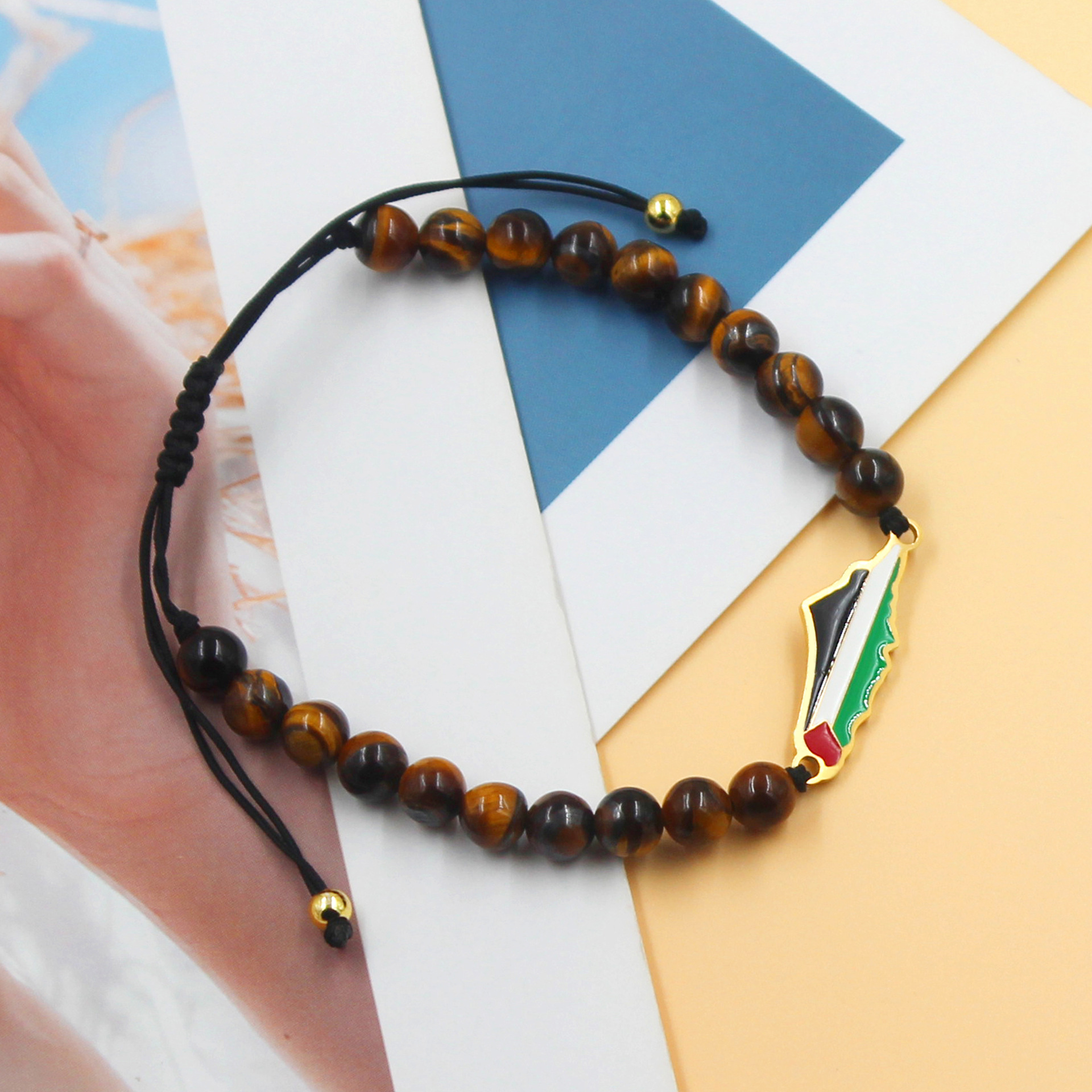 产品材质:不锈钢滴油国旗,不锈钢心链,铜镶嵌锆石链,4mm不锈钢珠/4mm铜珠,6mm白松石/黑玛瑙/虎眼石,不锈钢镶嵌水晶链