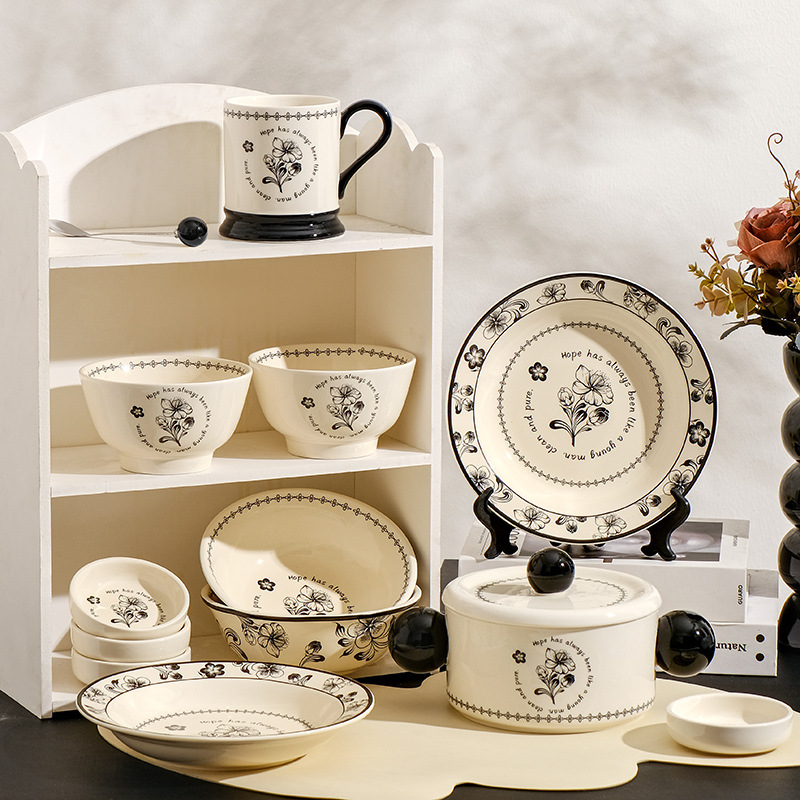 복고풍 세라믹 그릇 접시 세트 가정용 밥그릇 접시 수프 그릇 고급스러운 물컵 뚜껑 포함 라면 그릇 식기 세트