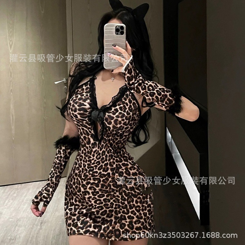 밀짚 소녀 레오파드 레이스 섹시한 할로우 엉덩이 원피스 뜨거운 순수한 섹스 란제리 유혹 나이트 드레스 1740